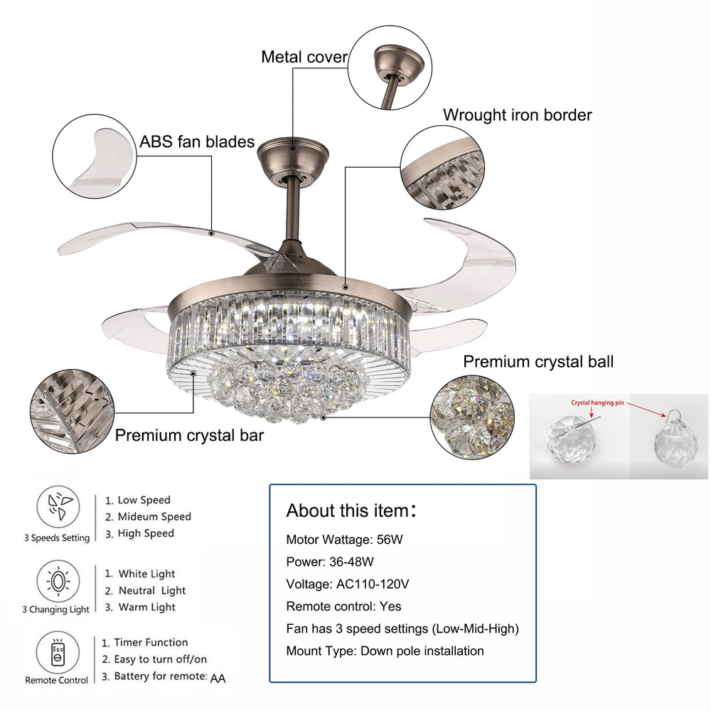36" ceiling fan with lights is a combination of ceiling fan and crystal chandelier: Fan Chandelier Features: ♥Pendant Lights Type: Crystal Pendant Lights ♥Material: Stainless Steel+k9 crystal+ABS fan ♥Size: Modern Fan Light Chandelier:36 inches when the fan is extended, Includes two lower bars, one for 4 inches and the other for 8 inches, you can choose one to install. ♥Color: Silver ♥Style: modern ♥Number of Blades: 4 ♥Lighting Features: dimmable, fan light ♥Application Type: Indoor ♥Light Bulb Type: LED ♥Number of lamps: 10 ♥Power: 41W (inclusive) -50W (including) ♥Applicable Places: living room/bedroom/kitchen/office and restaurant ♥Voltage: 110V Modern Crystal Chandelier Fandelier Ceiling Fan with Lights and Remote Silver 36" Ceiling Fan with Lights Is a Combination of Ceiling Fan and Crystal Chandelier: ★As for a Ceiling Fan, It Has 4 Retractable Blades That Can Stretch out and Put Inside Automatically When Turned on and off. ★That Means, When Turned off, the Blades Will Put Inside and Become 'Invisible', Totally a Chandelier with Crystal; ★When Turned on, the Blades Will Stretch out, and Transfer to a Traditional Ceiling Fan with Lights. ★This Chandelier Fan Is Controlled by Remote Control, Ceiling Fan Speed and Led Light Can Be Controlled Separately by a Single Remote Control. Fan Chandelier Features: ♥Pendant Lights Type: Crystal Pendant Lights ♥Material: Stainless Steel+K9 Crystal+Abs Fan ♥Size: Modern Fan Light Chandelier:36 Inches When the Fan Is Extended, Includes Two Lower Bars, One for 4 Inches and the Other for 8 Inches, You Can Choose One to Install. ♥Color: Silver ♥Style: Modern ♥Number of Blades: 4 ♥Lighting Features: Fan Light ♥Application Type: Indoor ♥Light Bulb Type: Led ♥Number of Lamps: 10 ♥Power: 41w (Inclusive) -50w (Including) ♥Applicable Places: Living Room/Bedroom/Kitchen/Office and Restaurant ♥Voltage: 110v Payment Delivery details Terms of sales About us Contact us Payment We accept ebay payment 。 Fees such as import duties, taxes are not included in the item price or shipping costs. These charges are the buyer's responsibility. Delivery details Shipping: 2-9 working days to: USA Terms of sales We maintain high standards of excellence and strive for hundred percent customer satisfaction. Feedback is very important to us. We hope that you contact us immediately before you give neutral or negative feedback, so that we can address your concerns. It is impossible to address issues if we do not know about them! About us Your satis faction is our ultimate goal. We work hard to earn your trust and future business. Our certified technicians have tested each item before shipping. The unit comes with 1 year limited warranty on all manufacturing defects. a) If you receive a defective item, you may return it or ask for a discount. Please contact us within 14 days after you receive the package. b) What you returned must be intact and in its original packaging as re? u. Customer is responsible for shipping costs of the returned item. c) We will cover the cost of shipping back t with the shipping rate indicated in the registration page. We will send you a new unit or refund the full payment you paid. Thank you. Contact us Business Hour Business Hour: Monday To Friday: 8:30 AM to 5:00 PM (Beijing China time) Due to time zones, our reply to your questions may not be immediately. But within above working time, we will reply your email within 24 hours. If it's non-workdays, please kindly be patient and wait till Monday. Please contact us with ebay message. Please feel free to contact us if you have any questions. Monday To Friday: 8:30 AM to 5:00 PM (Beijing China time) Due to time zones, our reply to your questions may not be immediately. But within above working time, we will reply your email within 24 hours. If it's non-workdays, please kindly be patient and wait till Monday. Please contact us with ebay message. Please feel free to contact us if you have any questions. FEATURE 2 FAST SHIPPING FEATURE -1 highquality, fastshipping Features High Quality, Creative, Fast Shipping shipping notice Can not ship to Puerto Rico,Alaska/Hawaii Item location: CA /NJ /Austell Note: Do not send to the Canary Islands Transportation does not include: canarias shipping notice: Can not ship to Puerto Rico,Alaska/Hawaii Light Source LED Model Ceiling fan Style Modern Material Stainless Steel+k9 crystal+ABS fan ISBN Does not apply UPC Does not apply EAN Does not apply Type Ceiling Fan Color Silver MPN Does Not Apply Room Bathroom, Bedroom, Dining Room, Hallway, Home Office/Study, Kitchen, Living Room, Children's Room Brand Unbranded Voltage 110V Number of Blades 4 Control Style Remote Control Mounting Ceiling Number of Speeds 3 Lighting Technology LED Installation Area Indoor & Outdoor Fan Width 36" Blade Color Clear Design Crystal Sensor Type Light Country/Region of Manufacture China Personalized Yes Manufacturer unknown Cord Color N/A Number of Settings 1 Power Source Corded Energy Star A LED String/Strip Type WS2811 EC Range A - G
