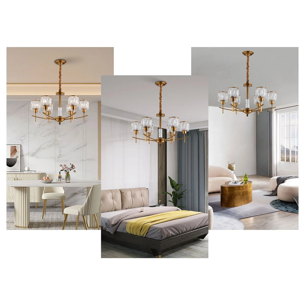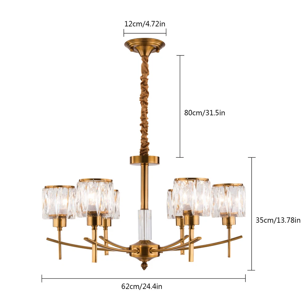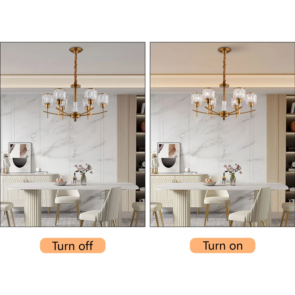 Modern Crystal Chandeliers Dinning Bedroom 6-Light Pendant LED Ceiling Lamp 265V Welcome to our store🎈🎈 Description This chandelier mainly uses iron and K5 crystal materials with exquisite processes, making it anti-rust and sturdy. Its six crystal lampshades with the 161.4-215.3ft² illuminated range will be a beautiful addition to your farmhouse, living room, porch, patio, etc. You can adjust the height through the hanging chain to achieve the desired lighting effect. This product is compatible with LED, Edison, incandescent, and other E12 bulb types less than 12W. Key Features Long Service Life: The premium iron and K5 crystal materials and electroplating process make this chandelier anti-rust, mildew and insect-proof, and high-strength, thus keeping beautiful and practical for a long time. Beautiful Decorative Effect: Elegant and soft light shines through the crystal lampshade on the frame of the body, refracting bright and comfortable light from multiple angles, making your room glowing and giving you a magnificent visual effect. It also plays a unique decorative role when not in use, bringing an elegant charm into your home. Adjustable Height: The hanging chain make this chandelier have 31.5" adjustable lengths, thus adapting to different ceiling height and creating different lighting effects and decorative appearance. Good Transmittance: Crystal lampshades have better light transmission compared with regular lampshades, which can let the light be better divergence, soft, and not dazzling, allowing you to fully feel the light within 161.4-215.3ft². Wide Application: It is suitable for various ceiling heights while ensuring better lighting effect. And it supports a wide voltage, which can adapt to different voltage environments. Easy&Flexible Installation : With complete accessories and an English manual, you can easily assemble this chandelier, connect the wire reserved on the ceiling, and screw the E12 bulbs into the lamp holder. It also can be installed on sloping, flat, or arched ceilings. Easy to Clean: With the electroplated surface and open design, you can easily wipe the dirt from it with a wet cloth. Ideal Gift: Thanks to its exquisite design and great lighting function, you can choose this chandelier as a gift for housewarming to your friends. Protective Package: To prevent the product from being damaged and bumped during transportation, we packed it with foam to protect your products to the maximum extent possible. Buy with Confidence: We have been working hard to provide better service and quality for our customers, which is our goal. If there is any problem with our products, please contact us in time. Details Standard E12 Lamp Holder: Six standard E12 lamp holders can be adapted to various models of bulbs such as LED, incandescent, and halogen to create different lighting effects. Round Base: The 4.72" diameter hardware base enhances load-bearing capacity and stability, ensuring a solid foundation. Lamp Chain Fleece: The light chain is covered with fleece, which plays a decorative role and can better protect the chain from damage and dust. Application Its applicable area is about 161.4-215.3ft² and its applicable height is less than 9.18ft. It is ideal for kitchens, hallways, living rooms, bedrooms, balconies, bars, aisles, foyers, hotels, restaurants, corridors, cafes, dining rooms, children's rooms, libraries, and other indoors. Specifications Color: Gold, Clear Shape: Round Style: French Style Material: Iron, K5 Crystal Process: Electroplating Assembly Required: Yes Mounting Type: Ceiling Mount Indoor/Outdoor Usage: Indoor Room Type: Kitchen, Living Room, Office Light Fixture Form: ‎Chandelier Light Direction: Downlight Efficiency: E Power Source: Corded Electric Light Source: 6* E12 Bulbs (Not Included) Voltage: 85-265V Max. Single Bulb Power: 12W Applicable Area: 15-20m²/161.4-215.3ft² Applicable Height: <2.8m/9.18ft Adjustable Height: 80cm/31.5inch Hanging Chain Length: 80cm/31.5inch Lampshade Height: 35cm/13.78inch Lampshade Diameter: 62cm/24.4inch Chassis Diameter: 12cm/4.72inch Package Included 1* ‎Crystal Chandelier 1* English Manual Other Accessories for Assembly Notes Please check the product size before ordering to make sure it fits your room. You need 6 E12 bulbs with a single bulb less than 12W (not included). We recommend using LED bulbs for energy saving and long life. Please make sure that the bulb wattage is below 12W, or it may damage this industrial chandelier. Please make sure the power is cut off before installation. To ensure your safety, we recommend that two people install this ceiling light together. Please install it by someone with an electrical license if necessary. You can control this ceiling light with the switch reserved on the wall. Please read the operating manual completely before use. And pay particular attention to the safety instructions included. Please allow the slight color difference caused by the shooting light and 1-3cm error due to manual measurement, and make sure you do not mind before you order. ↓↓↓↓↓↓ Payment Delivery details Terms of sales About us Contact us Payment We accept ebay payment 。 Fees such as import duties, taxes are not included in the item price or shipping costs. These charges are the buyer's responsibility. Delivery details Shipping: 2-9 working days to: USA Terms of sales We maintain high standards of excellence and strive for hundred percent customer satisfaction. Feedback is very important to us. We hope that you contact us immediately before you give neutral or negative feedback, so that we can address your concerns. It is impossible to address issues if we do not know about them! About us Your satis faction is our ultimate goal. We work hard to earn your trust and future business. Our certified technicians have tested each item before shipping. The unit comes with 1 year limited warranty on all manufacturing defects. a) If you receive a defective item, you may return it 