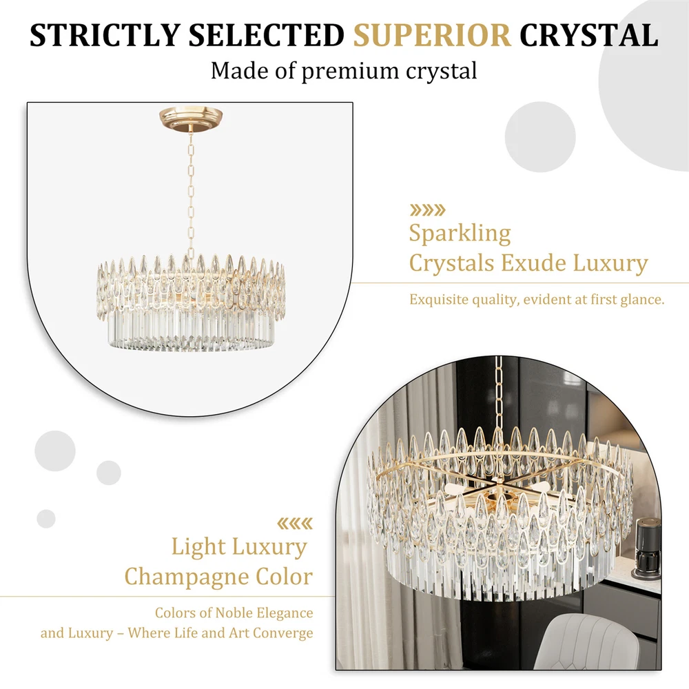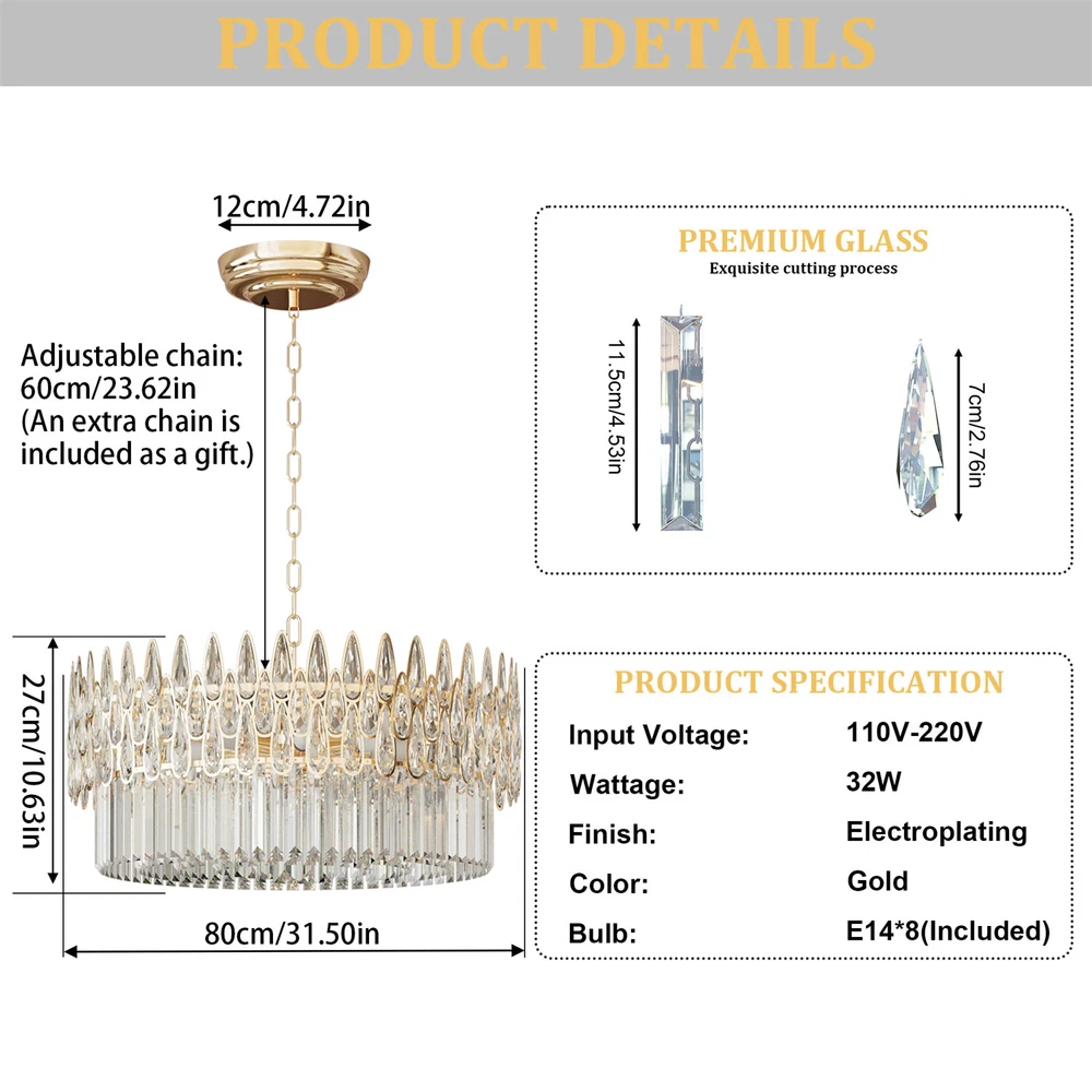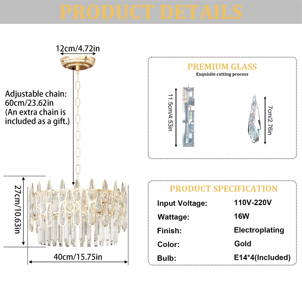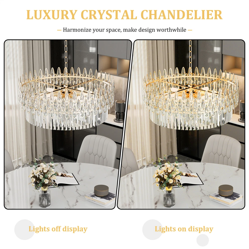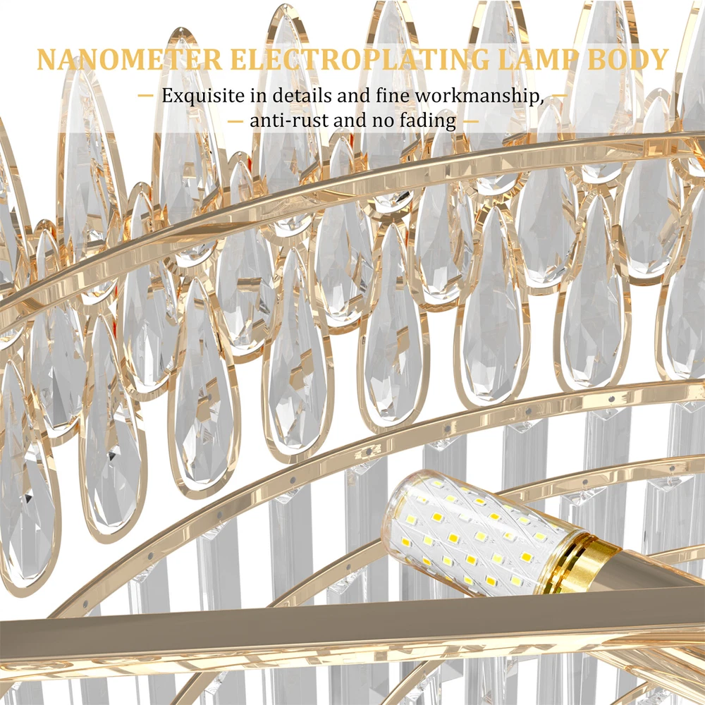 Modern Crystal Raindrop Chandelier Lamp Dining Living Room 3colors Temperature Modern Crystal Raindrop Chandelier Lamp Dining Living Room 3colors Temperature US SELLER, FAST ARRIVAL! Features: Available in three different diameters to fit different room scales, from dining to foyer. The chandelier features a combination of long oblong and raindrop-shaped crystals. Oblong crystals provide an elongated silhouette, raindrop shapes add a fluid touch. Sparkling crystals with special cutting, brings more exquisite and luxury to the decor. Adjustable cable chains to customize the height according to your space and layouts. The top-grade crystals sparkle like diamonds, creating an enchanting dramatic beauty. Three lighting modes for settings, warm (2700K), neutral (4000K), cool white (6500K). Warm lighting 2700K, provides a cozy and inviting atmosphere, ideal for dining areas. Neutral white 4000K, offers a natural light suitable for general use in various settings. Cool white 6500K, emits a bright, crisp light perfect for areas requiring high visibility. Perfect for dining rooms, living rooms, entryways, kitchens, make a bold statement. Gold-plated metal mounting bracket, strong and super durable, not easy to deform. Incorporates multiple bulbs, placed to maximize the light passing through the crystals. Recommends that 2 people for assembly, included mounting hardware and manual. Chandelier lamp must be anchored to a ceiling that can withstand the heavy weight. Featuring a gold-plated metal structure with exquisite crystals for a modern touch. Specifications: Type: Ceiling Lamp Model: Chandeliers Light Shape: Round Feature: Decorative Applications: Dining room, hotel, kitchen, ballroom, pub, foyer Material: Crystals + Iron + Copper Color: Light Gold & Clear Crystals Frequency: 50/60Hz IP Waterproof: IP23 Occasion: Ceiling Input Voltage : 100~220V Input / Output Current: 0.02A Color Temperature: 2700K, 4000K, 6500K Lighting Color: Cool White, Neutral, Warm White 15.75 in- Power: 16W Lumen: 1800ml Led Irradiation Area: 20m² Light Source: 4pcs E14 led corn lights Net Weight: 6kg/ 13.23 lbs Product Dimension: L * W 40x27cm/ 15.75x10.63 inch Chandelier Diameter: 40cm/ 15.35 inch Adjustable Chain: 60cm-120cm/ 23.62 inches - 47.24 inches 23.62 in- Power: 28W Lumen: 3200ml Led Irradiation Area: 25m² Light Source: 7pcs E14 led corn lights Net Weight: 10.7kg/ 23.59 lbs Product Dimension: L * W 60x27cm/ 23.62x10.63 inch Chandelier Diameter: 60cm/ 23.62 inch Adjustable Chain: 60cm-120cm/ 23.62 inches - 47.24 inches 31.50 in- Power: 32W Lumen: 4200ml Led Irradiation Area: 35m² Light Source: 8pcs E14 led corn lights Net Weight: 14.2kg/ 31.31 lbs Product Dimension: L * W 80x27cm/ 31.50x10.63 inch Chandelier Diameter: 80cm/ 31.50 inch Adjustable Chain: 60cm-120cm/ 23.62 inches - 47.24 inches Package Included: 1 x Crystal Chandelier Lamp 1 x Instruction Payment Delivery details Terms of sales About us Contact us Payment 1.We accept payment by credit card, paypal, payoneer. 2.Upon on payment, please confirm your shipping address. Delivery details 1. All of our products are brand new. 2. All Mirror have passed drop test over 1.2m and quality inspection, ensures the mirror was shipped in good condition before shipment. Terms of sales 1.We are located in NJ, CA ,all the items will be shipped via USPS, UPS Ground, Fedex Ground with tracking number provided. 2. We cannot ship to Alaska, Hawaii & Puerto Rico Addresses. About us About Wisfor At Wisfor,we provide high quality LED bathroom mirrors,focus on the development and innovation of mirrorsand our company has over 10 years backed with professional service experience, and exports products to more than 130 countries around the world. There are severial series of mirrors, Bathroom Mirror with Light, RGB Frontlit &Backlit LED Mirror, Metal Frame Mirror,Decorative Wall Mirror,ect. And many shapes, rectangle, round, oval, and so on.We always focus on the development and innovation of high-quality LED bathroom vanity mirror, to meet your demand and to elevate personality and design tastes. Contact us 1. If you are satisfied with the transaction could you pls leave us a positive feedback 5-star that we will be appreciated. 2. Normally your email would get replied within 24 hours (Business Hours) and your issue will be followed up carefully till we 've reached an agreement. 3. If you have any questions or suggestions before opening a case or dispute ,or leaving any neutral or negative feedback, please contact us first,we will try our best to resolve your problem. Brand LUVODI Type Chandelier Sensor Type Light Lighting Technology LED Room Any Room Material Crystals + Iron + Copper Style Modern Number of Lights 4-8 Shade Shape Round Features Water Resistant, Adjustable, Energy Efficient, Flexible, With Light Number of Settings 1 Finish Shiny Installation Area Indoor Control Style Pull Chain Power Source Corded Electric Department Adults LED String/Strip Type NA MPN JDI2JC9U9J EC Range A+++ - G Color Gold Light Color Warm, cool white, warm white Energy Star A+++ Color Temperature 2700K, 4000K, 6500K
