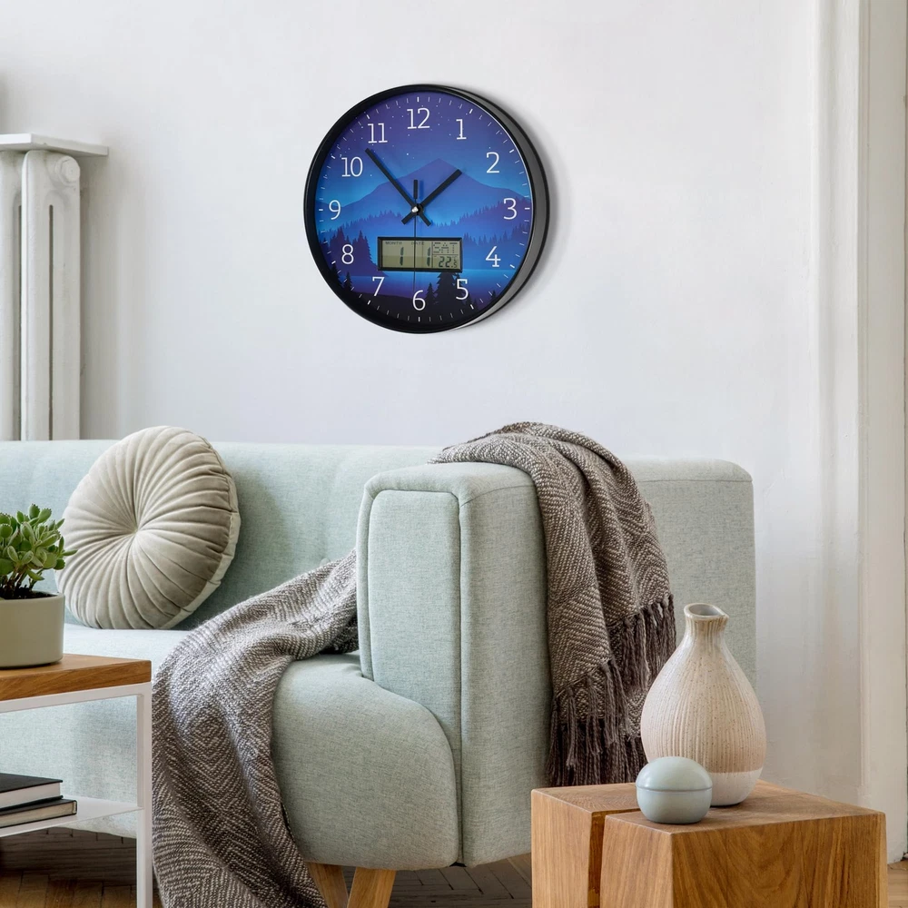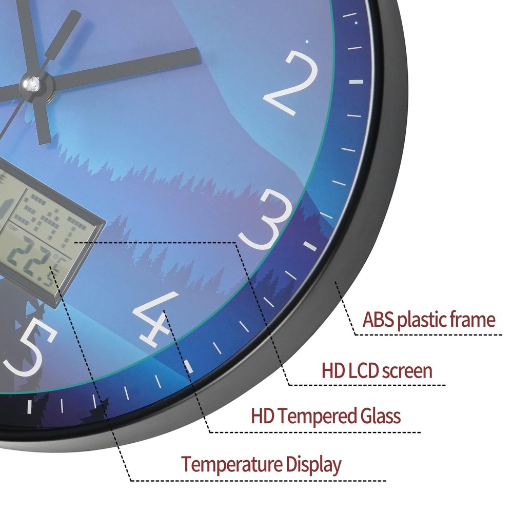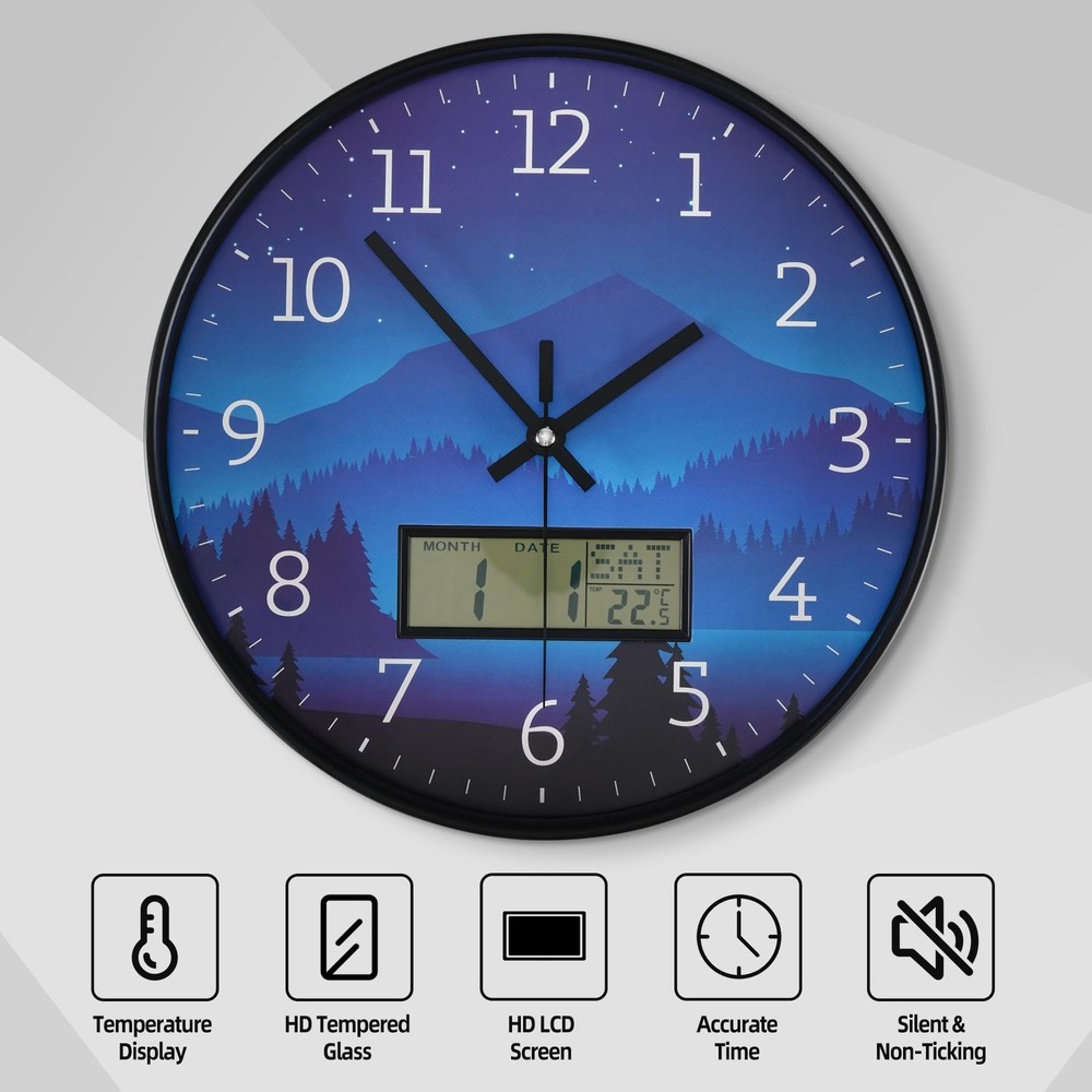 【Wall Clock Battery Powered】-Easy to use. It requires 1 AA battery and 1 "AAA" battery for the LCD display and one for the quartz movement. (Note: Batteries not provided. Do not use alkaline batteries.) Clock comes with hooks and a wide slot on the back for easy hanging 【Widely Used】: This wall clock is 12 inches in diameter, you can hang it anywhere. This wall clock is perfect for outdoor/indoor, living room, kitchen, bedroom, office, library, school decoration. 【Accurate Time & Non-Ticking】The silent wall clock use superior precise quartz movement, and keep the time accurate . It can keep you have a good sleep, study and work environment. It is a great choice in home, kitchen and office decor. 【LCD Display】: The modern wall clock decorative features with a large LCD screen, and displays date, month, day of week and temperature. only need a wall clock can use more functions. 【PERFECT GIFT IDEA 】- wall clocks are the perfect gift for family, partners, and friends. It is also an ideal gift for birthdays, anniversaries, Christmas, Mother's Day, Valentine's Day, Halloween, and Christmas. Modern clock can make your home look more beautiful and personalized.