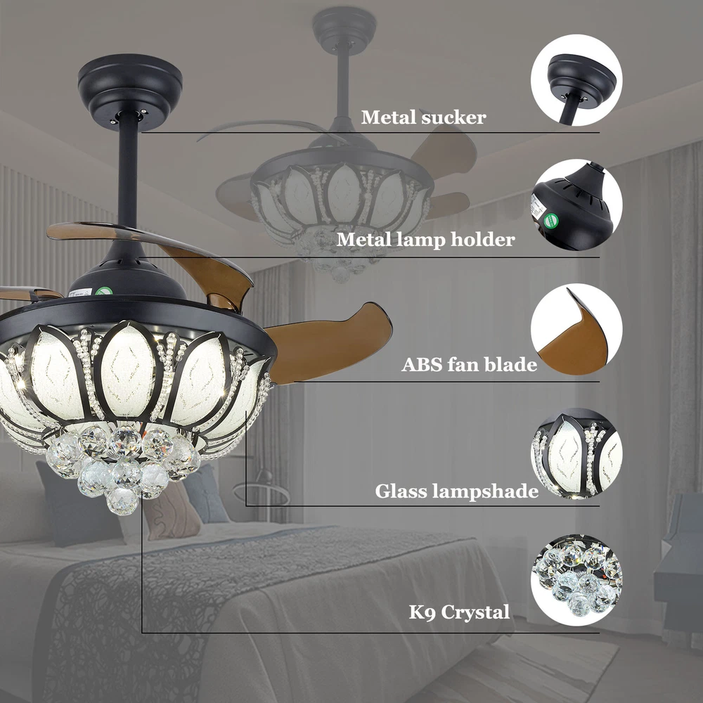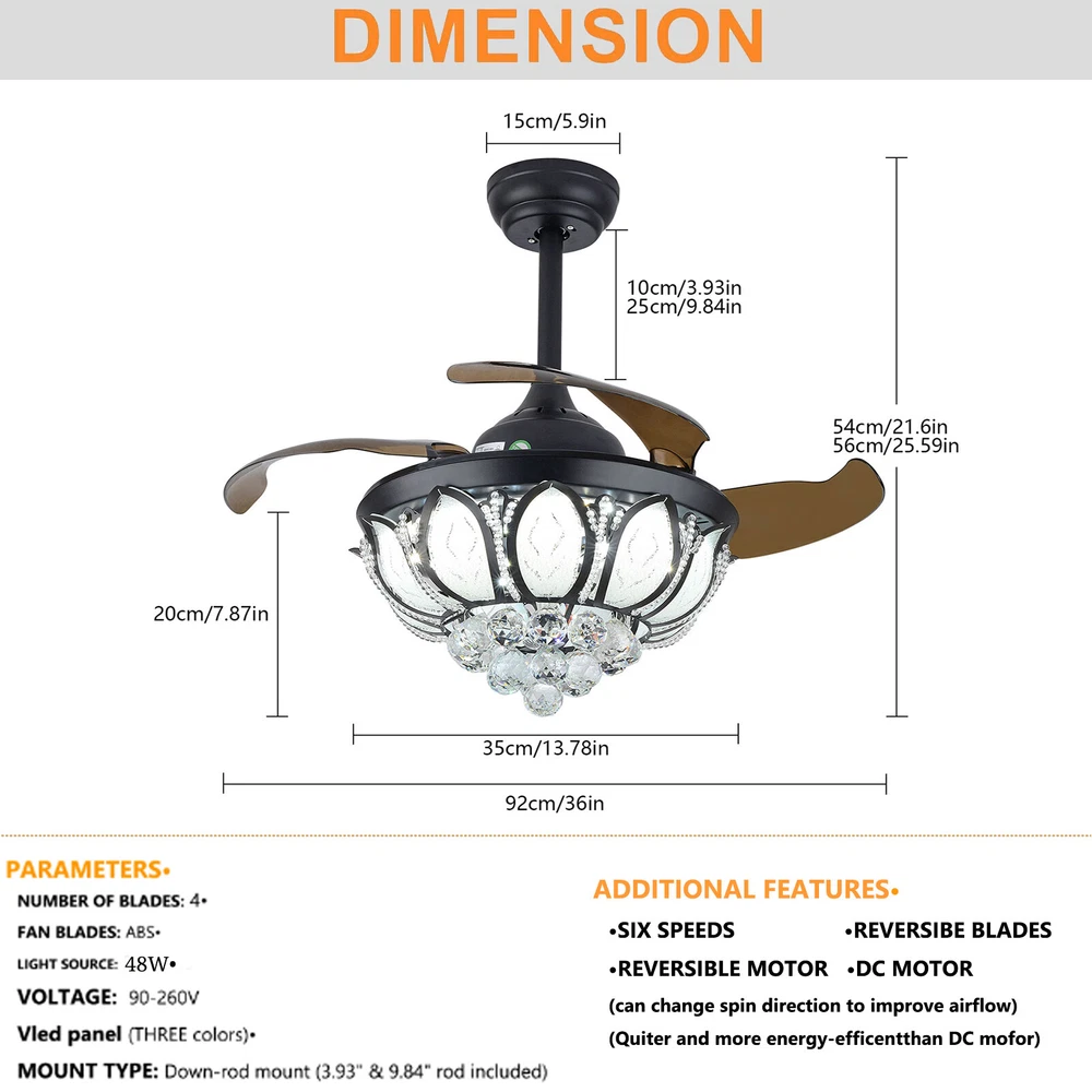 Package Included 1 * Ceiling Fan Light 2 * Suspension Rods 1 * Chinese Manual Other Accessories for Assembly Modern Invisible Ceiling Fan Light Dimmable Lamp W/Remote LED Crystal Chandelier Description Do you want to add a touch of vitality to your home? Explore our fan pendant light - a work of art that combines lighting, decoration, and practical functions. The remote control allows you to adjust brightness, light color, and wind speed, creating a warm atmosphere or enjoying a cool breeze, all under control. Exquisite crystal embellishment, showcasing extraordinary taste with the flow of light and shadow. Instantly ignite life inspiration! Key Features Good Materials: The product is made of acrylic, K9 crystal, and iron, which have been baking painted and polished to prevent fading, cracking, or rusting, and have a long service life. Excellent Lighting: The high transmittance lampshade, energy-saving LED light source(2200 lm), and warm, neutral, and cold light colors can provide soft and variable illumination modes, which take great care of your eyes and mood. Smart Control: You can set the timing function(1/2/4H) to have a comfortable sleeping environment and the 6-speed wind speed to experience the refreshing breeze or strong coolness through the convenient remote control, simplifying your daily routine and enhancing your overall living experience. Reversible Function: In addition to enjoying a cool environment in summer, you can also reverse the direction of the fan in winter, blowing hot air into the room from the top and increasing the room temperature. Low Noise: The pure copper motor makes the product operate at a noise level of less than 33dB, which is as quiet as a soft-speaking voice. This allows you to enjoy a peaceful and quiet environment. Thoughtful Design: When the fan function is turned on or off, the fan blades can automatically fold or open, which can avoid dust accumulation when the fan blades are not in use. High Adaptability: You can choose to install any of the 2 equipped lamp poles of 3.94" and 9.84" in height according to your needs and ceiling heights. Generous Outlook : It was crafted with clean and elegant lines and designed to be with simple black and white colors, and brilliant crystal balls that can fit most of the decoration styles in modern life. Details Stable Chassis: The 5.9" thickened and enlarged chassis ensures stronger load-bearing capacity and stability. Round Corners: The smooth and rounded corners along with the absence of sharp edges make installation and cleaning of this product a gentle and comfortable experience for your skin. Additionally, they also add to the overall aesthetic appeal of the product. Application This ceiling fan can be installed in various places that have a height of 8.53-10.17ft and require an illumination area within 129.17 ft² and air circulation, such as the living room, bedroom, kitchen, study, and hallway. Specification Material: Acrylic, K9 Crystal, Iron Process: Baking Paint, Polishing Color: Black+White Style: Modern Control Mode: Remote Control(Included) Motor Type: Pure Copper Motor Light Colors: Cold, Neutral, Warm Assembly Required: Yes Mount Type: Ceiling Mount Light Source Type: LED Battery Type: 2 * AAA Batteries (Not Included) Speed Gears: 6 Voltage: 110-120V Motor Power: 36-48W Light Power: 24W Efficiency: E Noise: ≤33dB Color Temperature: 3000-4500-6000K Lumen: 2200lm Brightness Adjustment Range: 5-100% Timing Range: 1/2/4h Memory Function: About 10s Remote Control Distance: Within 5m/16.4ft Lighting Area: Within 12m ²/129.17ft ² Applicable Room Height 2.6-3.1m/8.53-10.17ft Suspension Rods Length: 10cm/3.94in, 25cm/9.84in Base Diameter: 15cm/5.9in Fan Diameter (Unfolded): 92cm/36in Lampshade Size (D*H): 35*20cm/13.78*7.87in Overall Height: 45cm/17.72in, 56cm/22.05in Package Size: 55*55*39cm/21.65*21.65*15.35in Gross Weight: 11kg/24.25lbs Net Weight: 10kg/22.05lbs Package Included 1 * Ceiling Fan Light 2 * Suspension Rods 1 * Chinese Manual Other Accessories for Assembly Notes Please make sure that the size of the ceiling fan matches your room and carefully make a choice. Please make sure the power is cut off before installation and when you clean the light. The surface of the product and the electric wire should avoid scratching when mounting, and electric insulation gloves(not included) must be worn when installing. To ensure your safety, professional ones with an electric license are recommended to carry out the installation if possible. This product is suitable for flat-top concrete ceiling houses. If you want to install it on gypsum boards and wooden ceilings, you need to bring your own modified brackets. Please allow the slight color difference caused by the shooting light and 1-3cm error due to manual measurement, and make sure you do not mind before ordering. Payment Delivery details Terms of sales About us Contact us Payment We accept ebay payment 。 Fees such as import duties, taxes are not included in the item price or shipping costs. These charges are the buyer's responsibility. Delivery details Shipping: 2-9 working days to: USA Terms of sales We maintain high standards of excellence and strive for hundred percent customer satisfaction. Feedback is very important to us. We hope that you contact us immediately before you give neutral or negative feedback, so that we can address your concerns. It is impossible to address issues if we do not know about them! About us Your satis faction is our ultimate goal. We work hard to earn your trust and future business. Our certified technicians have tested each item before shipping. The unit comes with 1 year limited warranty on all manufacturing defects. a) If you receive a defective item, you may return it or ask for a discount. Please contact us within 14 days after you receive the package. b) What you returned must be intact and in its original packaging as re? u. Customer is responsible for shipping costs of the returned item. c) We will cover