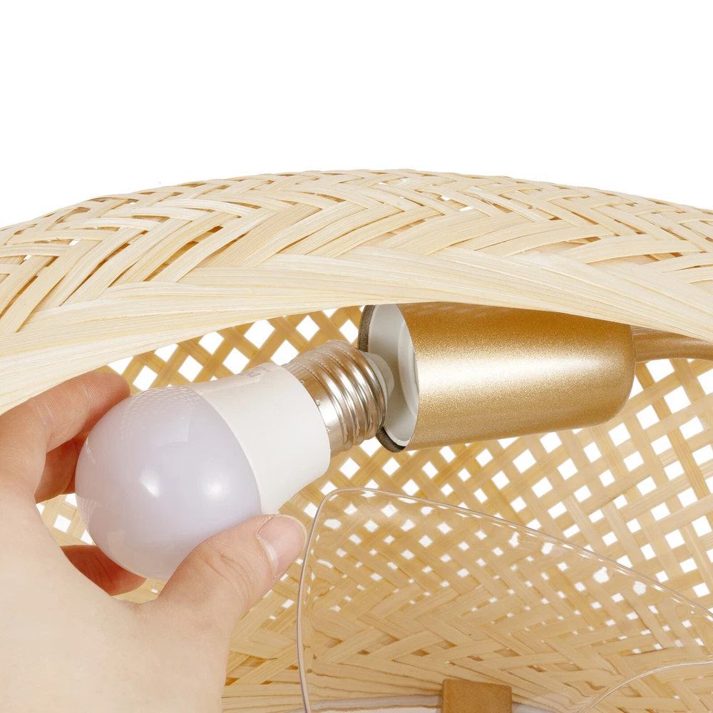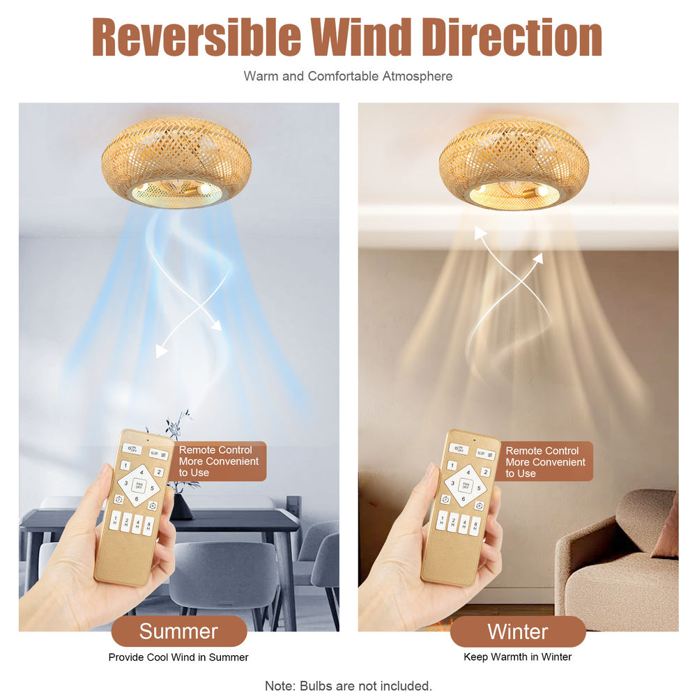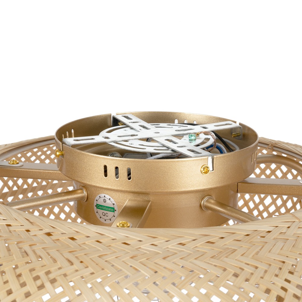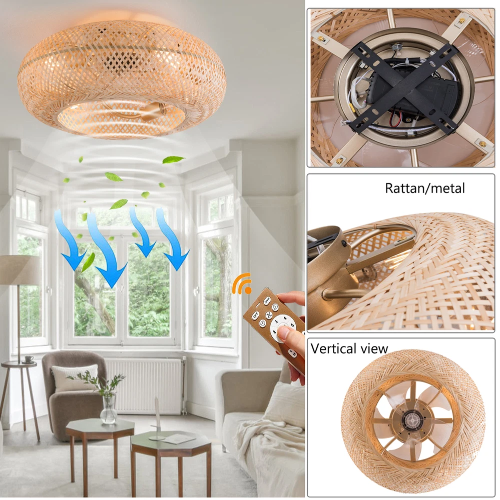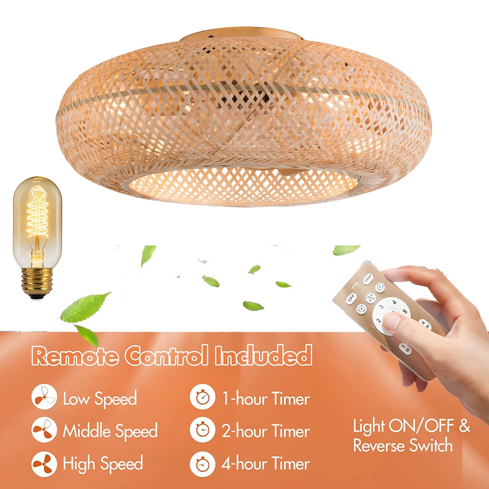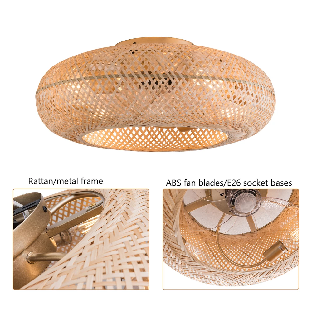 Description This ceiling fan mainly uses woven rattan and iron material with exquisite processes, making it anti-rust and sturdy. Its woven rattan shade in a cage shape looks classical and rustic in your farmhouse, living room, porch, patio, etc. within 107.6-161.4ft². You can achieve simple operation with the remote control to adjust the speed, reversible function, and timing function. Choose this ceiling fan, you can have a comfortable life.Details Sturdy Chassis: The sturdy round chassis of 5.9 inches in diameter ensures stable support for the lamp body and present classic beauty. Standard E26 Bases: Equipped with standard E26 bases, you can choose different style bulbs less than 18W such as LED, Edison, and incandescent to create different lighting effects. ABS Blades: The 7 blades use high-quality ABS materials, making them clear, wear-resistant, and high-strength without affecting the whole beauty of this ceiling fan. Semi-enclosed Bottom Opening: The semi-enclosed bottom opening allows for convenient installation or change of the bulbs