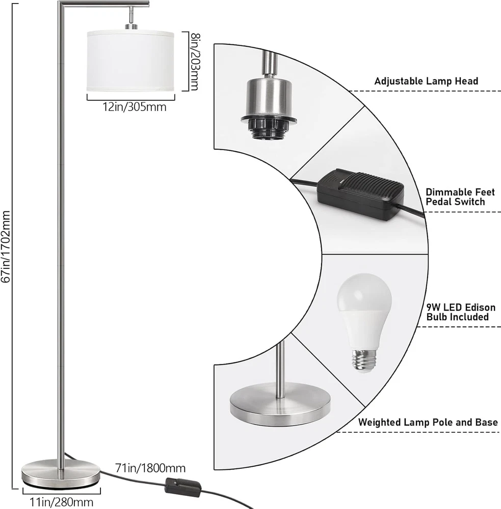 Store New Arrivals Add to Favorite View Feedback Contact Modern Floor Lamp for Bedroom, Dimmable Silver Floor Lamps for Living Room with Adjustable Shade, Tall Standing Lamp Nickel Finish Reading Light for Office Dorm Nursery, 9W LED Bulb Included Description Item model number 13046 Light Source Type LED Style Modern, Minimalist, Classic, Antique, Art Decor Number of Items 1 Power Source Corded Electric Number of Light Sources 1 Country of Origin China Batteries Included? No Lighting Method Adjustable Mounting Type Pole Mount Maximum Compatible Wattage 100 Watts Number of Pieces 1 Room Type Office, Living Room, Bedroom, Study Room, Dining Room Lamp Type Floor Lamp Bulb Shape Size B10 Efficiency High Efficiency Product Dimensions 11"D x 12"W x 67"H Material Metal Installation Type Freestanding Finish Type Brushed Specific Uses For Product Indoor use only Is Waterproof False Indoor/Outdoor Usage Indoor Brightness 1200 Lumen Control Method Touch Water Resistance Level Waterproof Batteries Required? No Item Weight 11 Pounds Connectivity Technology USB Connectivity Protocol Homeplug Special Features Pedal Dimmer Switch, 0-100% dimmable, LED bulb included Special Feature Pedal Dimmer Switch, 0-100% dimmable, LED bulb included Shade Height 35 Inches Part Number 13046 Shade Color White Color Temperature 3000 Kelvin Color Silver Wattage 9 watts Is Cordless? No Base Material Metal Bulb Base E26 Medium Shape Curved Voltage 120 Volts (AC) Recommended Uses For Product Indoor use only Shade Material Silk Finish types Brushed Included Components Bulb included, lamp base, lamp pole, lamp shade Base Diameter 11 Inches Switch Type Dimmer [Fully Dimmable & Pedal Dimmer Switch] -- Our LED floor lamp can be customized brightness gradually from 0%-100% according to your needs, gives you focused lighting for painting, reading or working. A switch on the cord allows you to easily control the floor lamp, sparing your hands to do something else and saving you the trouble of bending down to turn off the light. [Flexible Hanging Lampshade] -- This modern floor lamp comes with a 360° adjustable head, which can be rotated to any angles as you desired, effectively providing a wide range of illumination to your space. Perfect for any corner like near desk, sofa, side table,etc. Note: Please rotate the lamp head instead of rotating shade directly to avoid damage. [Modern Floor Lamp for Any Decor] -- Adopted with a slub imitation silk cloth lampshade and metal silver finish, this simply and elegant design makes the reading stand light fit easily in majority of interior styles no matter modern, traditional or minimalist. It is an excellent choice to add a eye-catching look for your bedroom, living room, or study room. [Soft White Bulb for Romantic Space] -- The package contains a 9W 3000K led bulb, you could easily install the dimmable floor light without finding the right size bulb to match it. The bulb brightness is equivalent to a 80W incandescent bulb, which not only saves up to 90% energy, but also offers a flicker-free and stable light, protecting your family’s eyesight. [Sturdy Metal Base & Easy to Assemble] -- Made of well-weighted metal pole and base, this montage tall floor lamp is stable enough to hold in anywhere and safe to kids and pets not being wobbled by accident. No tools required, just take a few minutes to following the instructions and video on the product page, you can enjoy the tall pole lamp immediately. Product Description 1 0-100% Stepless Dimmable 2 360°+180° Rotatable Shade 3 Weighted Stable Base 4 LED Bulb Included 5 Easy Installation Eye-protection Lampshade Softened by a classic fabric lampshade that composed of textured material, this lamp will produce comfortable glow and relieve the strain of eyes. Pedal Dimming Switch Apply with dimmable pedal switchon the power cord, the floor lamp is convenient for you to control the brightness from 0 to 100% with your foot. Stable Metal Base This modern standing lamp is composed of well-weighted metal base and pole, which has an excellent stability to prevent tipping over on daily use. Excellent Gift Choice With classic outlook, the floor lamp with led bulb can brighten up a room and create a cozy ambience. Decent choice as gift for your family or friend. Does this floor lamp come with a light bulb? Yes, a 9W 3000K LED bulb is included, saving your time in finding the right size bulb. What kind of bulbs can I use if I want to change the included one? Incandescent light bulbs less than 100W are greatly recommended. Not all Led bulbs are fully compatible with the dimmer system of the lamp, so it may cause to flicker or lose dimming function with other Led bulbs. Is the lamp shade adjustable? Yes, the lampshade is 360°horizontally and 180°vertically adjustable. Please try to rotate the metal lamp head connected to the pole instead of the lampshade to avoid failure of rotation. How tall is this lamp? The height of this lamp is 67 inch. Can a different lamp shade be used with this lamp? Yes, the shade can be easily replaced following installation instructions. The size of original lampshade is 12"D x 8"H. And maximum diameter of the lampshade should be under 19.69”, otherwise it might not fit. Silver Floor Lamp Boncoo Floor Lamp Series 67 inch Height 76 inch White Silk Cloth Shade Type Cage-Shaped Metal Silver Color Oil-Rubbed Bronze 0-100%Fully Dimmable Bulb Included Pedal Dimmer Switch Control Type Pedal ON/OFF Switch 360°+180° Adjustable Angle 360° Horizontally 67 inch Height 67 inch White Silk Cloth Shade Type White Silk Cloth Silver Color Brown 0-100%Fully Dimmable Bulb Included Pedal Dimmer Switch Control Type Pedal Dimmer Switch 360°+180° Adjustable Angle 360°+180° 67 inch Height 66 inch White Silk Cloth Shade Type Beige Silk Cloth Silver Color Gold 0-100%Fully Dimmable Bulb Included Pedal Dimmer Switch Control Type Pedal Dimmer Switch 360°+180° Adjustable Angle 360°+180° 67 inch Height 67 inch White Silk Cloth Shade Type White S