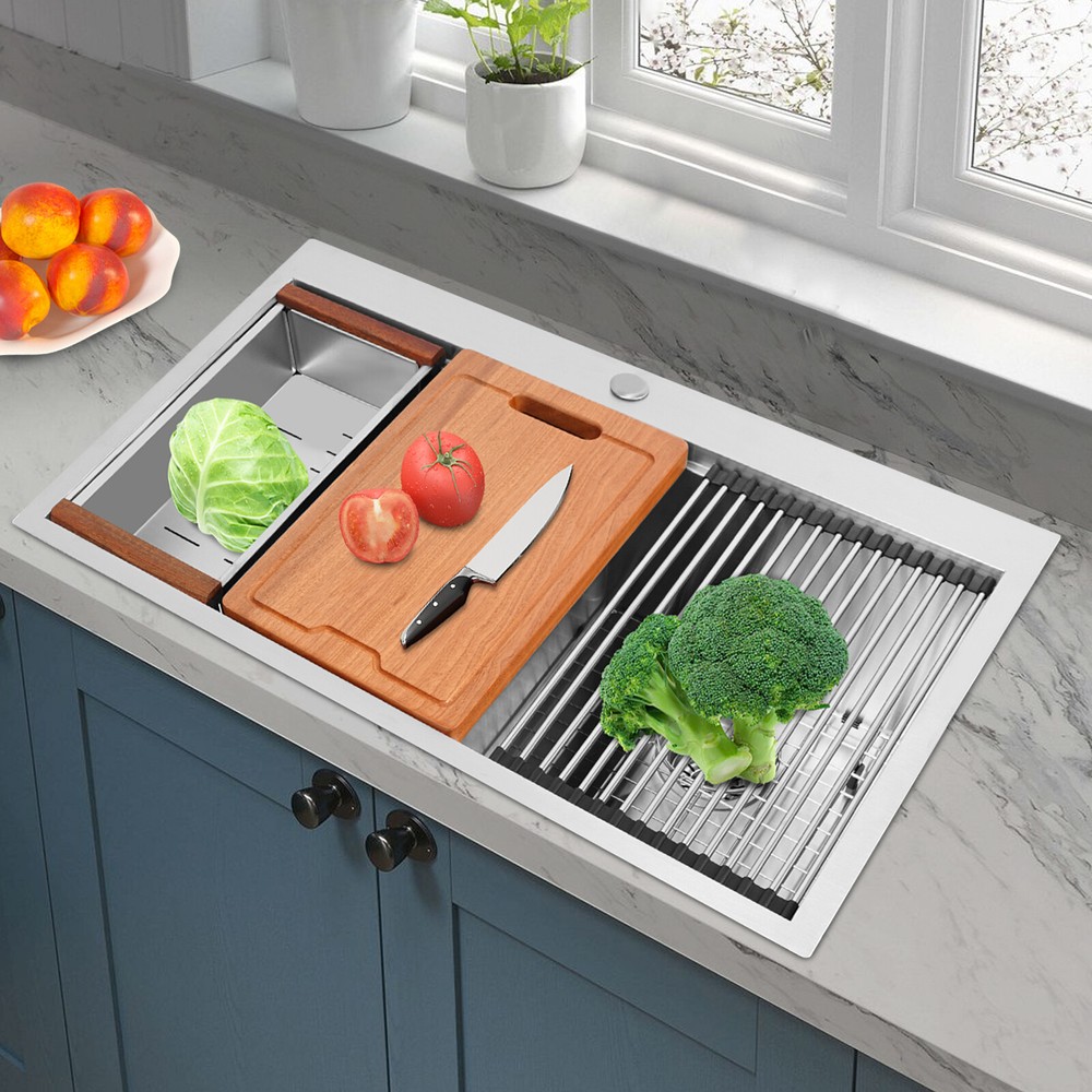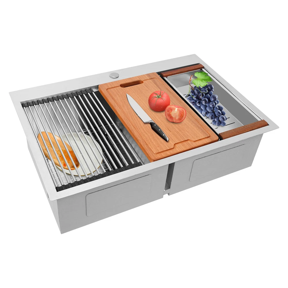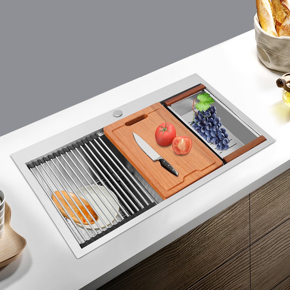 Specification Style: Modern Color: Silver Shape: Rectangular Material: 304 Stainless Steel, 201 Stainless Steel, Rubber Surface Treatment: Brushed and PVD Installation Type: Topmount, Flushmount Number of Bowls: 2 Gross Weight: 25kg/55.12lbs Net Weight: 23.75kg/52.36lbs Package Size: 87*58*28cm/34.25*22.83*11.02in Product Size: 83.8*55.88*22.86cm/33*22*9 in Each Bowl Size: 45.72*38.1*22.86cm/18*15*9in Package Included 1* Double-Bowl Kitchen Sink 1* Cutting Board 1* Roll-up Rack 1* Drain Basket 2* Bottom Grids Other Accessories for Assembly Modern Silver Double-Bowl Kitchen Sink, Flushmount Stainless Steel Kitchen Sink Description What if there is not enough space in the kitchen sink? What do you do if the sink is always clogged and can't be cleaned all the time? Then I suggest taking a look at our double-bowl kitchen sink with excellent material and easy cleaning features, which can easily solve the above problems and help you to create a more tidy kitchen. Key Features Last and Durable: Made of 304 stainless steel, and 201 stainless steel with brushed and PVD processes, it is rustproof , and can resist corrosion, impact, and deformation, so it can remain beautiful and practical for a long time. Thoughtful Design: The X-shaped water guiding line can guide water flow and form vortices to achieve rapid drainage. The anti-condensation coating effectively prevents excessive temperature differences and protects the cabinet from moisture. I t is equipped with sound insulating pads, which can effectively reduce the noise generated by the faucet water release and the collision of dishes, creating a quiet kitchen environment. Kitchen Assistant: Our product comes with a cutting board for easy vegetable cutting. In addition, the roll-up rack can help drain your dishes, the drain basket is beneficial for draining vegetables and fruits, and two bottom grids can effectively protect the sink base. Large Capacity: A large and deep (9-inch) sink with two bowls can hold a large amount of dishes, making you more comfortable and efficient when washing. It is a great helper for you to clean dishes or prepare food. Easy to Clean: The smooth surface, simple construction, and R0 round corner design that does not easily harbor dirt make the sink easy to rinse with clean water. Complete Accessories: It comes with a sink, a cutting board, a roll-up rack, a drain basket, two bottom grids, etc. to meet your various needs at once and also save you money. Quality Service: We stand behind all our guests and look forward to assisting you with your purchase. It is our pleasure to answer your confusion and questions. The end of the story between us is definitely not "we sell and you buy" Details Filter Basket: The filter basket intercepts food residue for easy handling and prevents your pipeline from clogging. Tier Track: It allows you to easily place and move the cutting board, roll-up rack, and drain basket, converting your sink to a workstation and providing you with more space. Application This product can be widely used at homes, restaurants, bars, hotels, cafes, milk tea shops, school canteens, dessert shops, cafeterias, garages, clean rooms, and any other commercial places for manual cleaning of food, fruits, vegetables, dishes, etc. Specification Style: Modern Color: Silver Shape: Rectangular Material: 304 Stainless Steel, 201 Stainless Steel, Rubber Surface Treatment: Brushed and PVD Installation Type: Topmount, Flushmount Number of Bowls: 2 Gross Weight: 25kg/55.12lbs Net Weight: 23.75kg/52.36lbs Package Size: 87*58*28cm/34.25*22.83*11.02in Product Size: 83.8*55.88*22.86cm/ 33*22*9 in Each Bowl Size: 45.72*38.1*22.86cm/18*15*9in Package Included 1* Double-Bowl Kitchen Sink 1* Cutting Board 1* Roll-up Rack 1* Drain Basket 2* Bottom Grids Other Accessories for Assembly Notes Please check the size carefully before ordering. Please note that this product does not include a faucet. Please do not scratch its surface with sharp objects to obtain a longer service life. If you want to get a better installation effect, we suggest you ask professional workers to install it. Please allow the slight color difference caused by the shooting light and 1-3cm error due to manual measurement, and make sure you do not mind before ordering. Payment Delivery details Terms of sales About us Contact us Payment We accept ebay payment 。 Fees such as import duties, taxes are not included in the item price or shipping costs. These charges are the buyer's responsibility. Delivery details Shipping: 2-9 working days to: USA Terms of sales We maintain high standards of excellence and strive for hundred percent customer satisfaction. Feedback is very important to us. We hope that you contact us immediately before you give neutral or negative feedback, so that we can address your concerns. It is impossible to address issues if we do not know about them! About us Your satis faction is our ultimate goal. We work hard to earn your trust and future business. Our certified technicians have tested each item before shipping. The unit comes with 1 year limited warranty on all manufacturing defects. a) If you receive a defective item, you may return it or ask for a discount. Please contact us within 14 days after you receive the package. b) What you returned must be intact and in its original packaging as re? u. Customer is responsible for shipping costs of the returned item. c) We will cover the cost of shipping back t with the shipping rate indicated in the registration page. We will send you a new unit or refund the full payment you paid. Thank you. Contact us Business Hour Business Hour: Monday To Friday: 8:30 AM to 5:00 PM (Beijing China time) Due to time zones, our reply to your questions may not be immediately. But within above working time, we will reply your email within 24 hours. If it's non-workdays, please kindly be patient and wait till Monday. Please contact us with ebay message. Please feel free to contact us if you have any questions. M