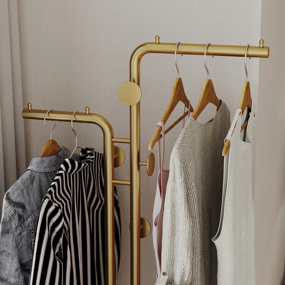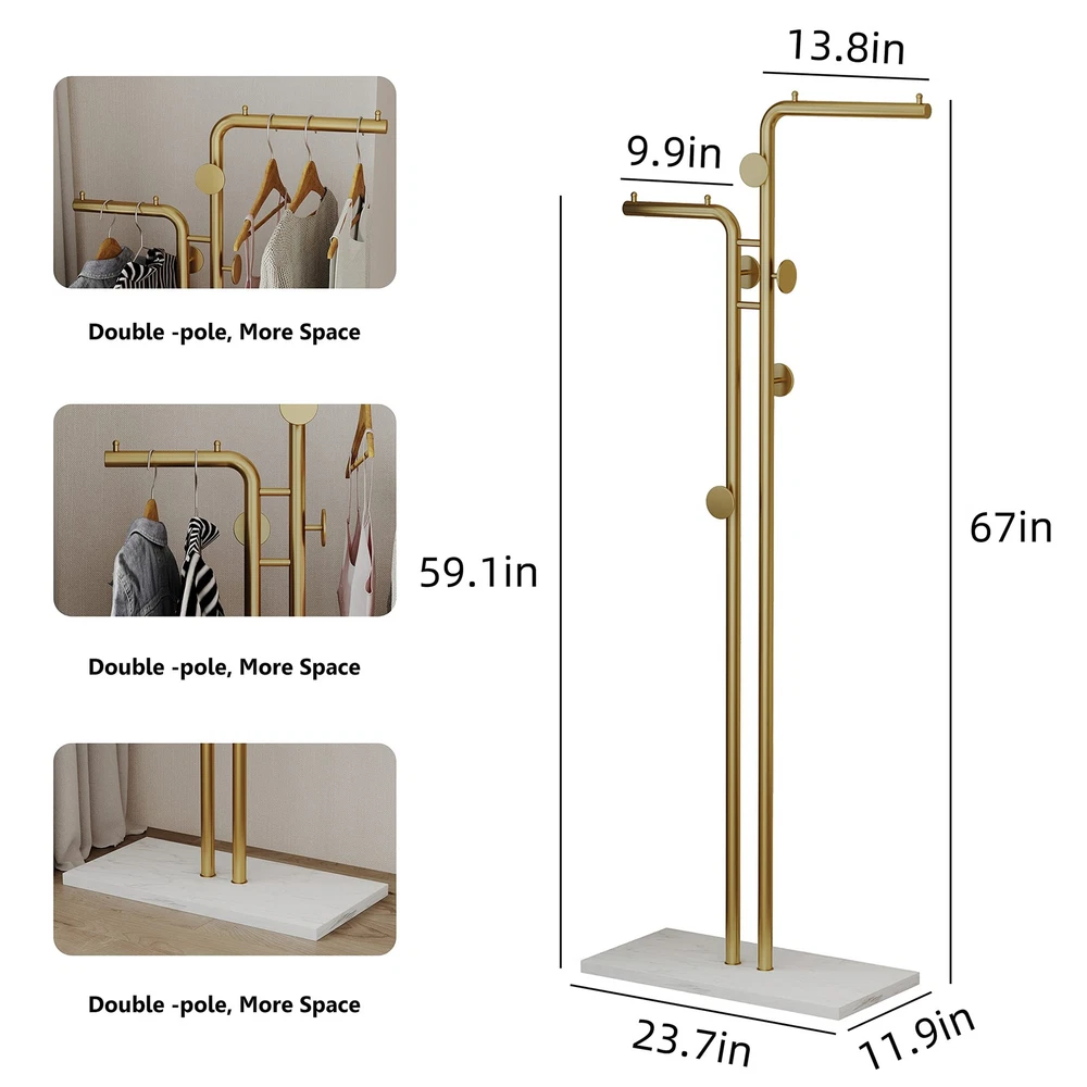 2rod coat rack SPACE-SAVING: This coat rack is compact and self-contained with a unique double-bar design that takes up very little space while maximizing storage capacity. The slate marble base combines the hardness of the slate with the beauty of marble. It is oil-resistant, scratch-resistant, and easy to clean MODERN & MINIMALIST STYLE: Double-pole freestanding metal coat rack with a satin steel finish, smooth touches, organize your living space with stylish solutions, the anti-drop bead design, are both beautiful and in preventing the hanger from falling off HIGH-QUALITY CRAFTSMANSHIP: The durable coat rack is made of premium iron. Adopt the golden/black electroplating and polishing process, and create an elegant appearance and a delicate touch. The anti-rust coating allows it to be used even in the bathroom EASY TO ASSEMBLE: So easy, assemble in minutes. Firstly connect metal pipes together by rotation, then stick non-slip pads on the base, and finally connect the base and the bottom metal pipe by rotating screw. The package includes a screw and Allen key MULTIPLE OCCASIONS: The coat rack standing is larger than similar products on the market, more stable and balanced, and more secure to hang. Suitable for home, entryway, entry hall, bedroom, apartment, office, hotel, and more Tips: The included screws are already installed in the bar of the coat rack
