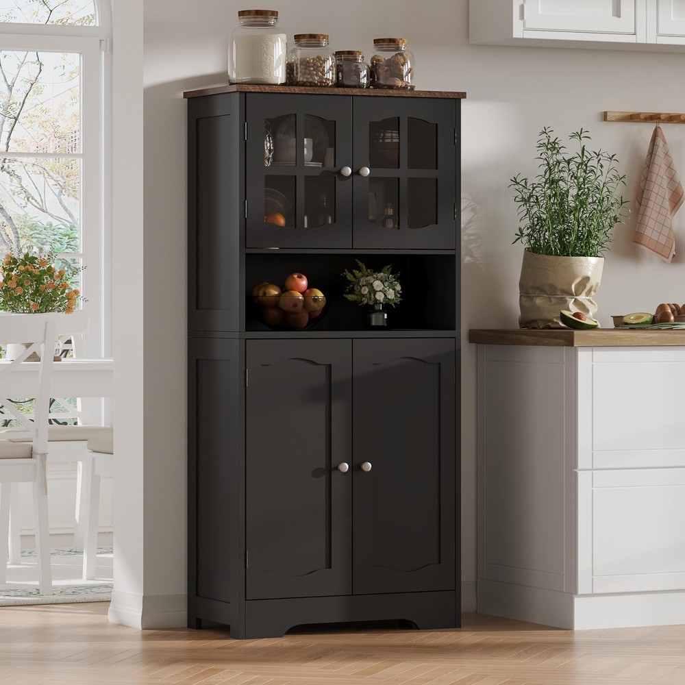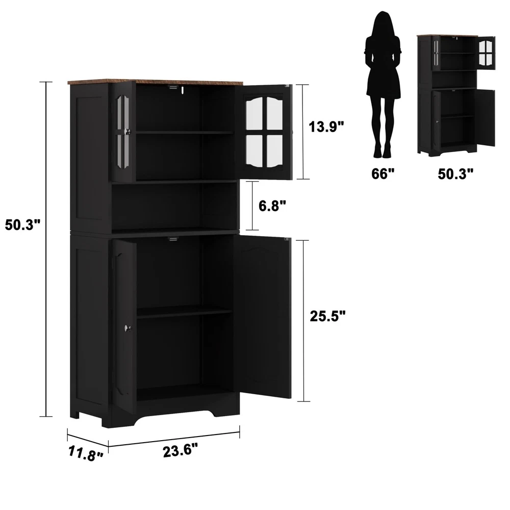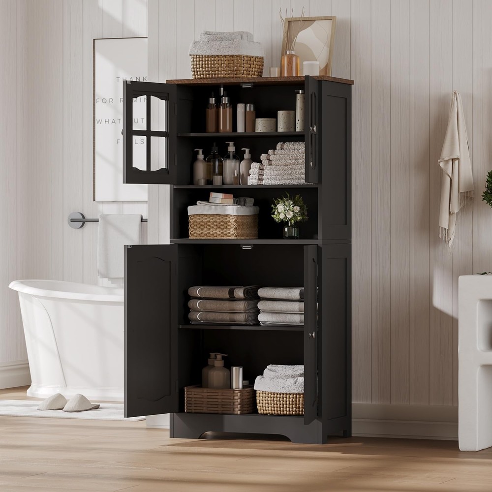 Bathroom Storage Cabinet, Freestanding Storage Cabinet with Doors and Shelves, Modern Cupboard for Bathroom, Living Room, Kitchen, Office, Black 【Elegant Modern Design】Cross-patterned acrylic cabinet doors with metal handles bring a touch of modernity and sophistication to your space. Minimalist lines and finishes combine beauty and functionality, making this black storage cabinet the highlight of your bathroom, kitchen, or living room 【Spacious Storage】This bathroom floor cabinet features 4 interior compartments with adjustable shelves and an open countertop for flexible storage of towels, toiletries, kitchen supplies, and more. The open countertop provides easy access to everyday items and organizes your space 【Multi-Situation Functionality】The tall storage cabinet is perfect for the bathroom. It can also be used as a freestanding cabinet in the living room, a storage cabinet in the kitchen, or a bookcase in the home office. Its versatile design makes it a practical choice for any room 【Sturdy & Durable】This pantry linen cabinet is made of high-quality MDF, which is waterproof and scratch-resistant to ensure durability. It has some load-bearing capacity and it comes with anti-tip hardware and a solid base for safe use 【Easy Assembly】bathroom cabinet comes with detailed instructions, labeled parts for quick and easy installation. Our dedicated customer service team is ready to assist you