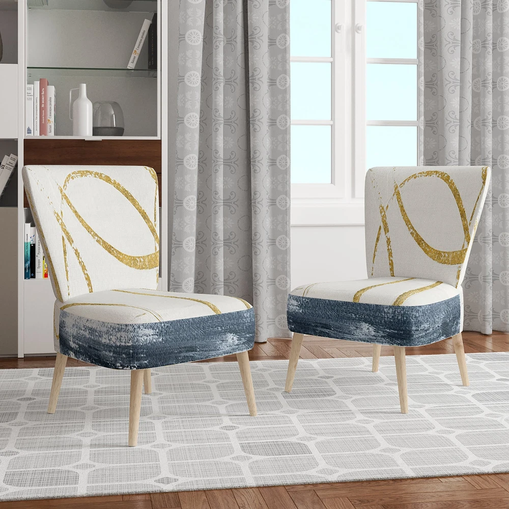 Use Designart's modern upholstered chair to bring a glamorous accent to your contemporary aesthetic. The sleek armless design makes this side chair ideal for smaller spaces, and the strong hardwood frame provides sturdy support. Rich shades of gold and grey stay vivid thanks to the use of high-density Italian inks in the printing process. Soft polyester fabric, a semi-firm foam-padded seat, and a high back combine in this 'Gold Abstract Geometric Shape' chair to create a comfortable place to unwind and relax at day's end.Features:1 Accent chair includedFoam Filled SeatingSide Chairs : 32.5in high x 22.5in deep x 27.5in wideSlipper Chair : 32in high x 21in deep x 25in wideArm Chair : 32in high x 23in deep x 23in wide Free Shipping Over $49.99* Details Designart "Gold Abstract Geometric Shape" Upholstered Modern Accent Chair - Arm Product Description: Use Designart's modern upholstered chair to bring a glamorous accent to your contemporary aesthetic. The sleek armless design makes this side chair ideal for smaller spaces, and the strong hardwood frame provides sturdy support. Rich shades of gold and grey stay vivid thanks to the use of high-density Italian inks in the printing process. Soft polyester fabric, a semi-firm foam-padded seat, and a high back combine in this 'Gold Abstract Geometric Shape' chair to create a comfortable place to unwind and relax at day's end. Features: 1 Accent chair included Foam Filled Seating Side Chairs 32.5in high x 22.5in deep x 27.5in wide Slipper Chair 32in high x 21in deep x 25in wide Arm Chair 32in high x 23in deep x 23in wide
