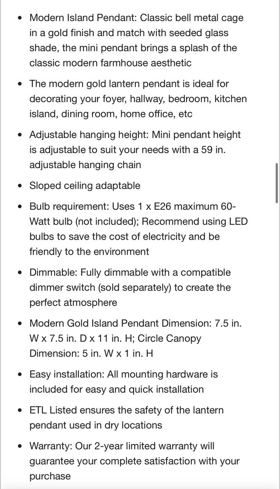 1. Love this gorgeous mini pendant light! The gold finish adds a modern touch, and the seeded glass shade gives off the perfect warm glow. Super easy to install and looks way more expensive than it is. Came quickly and well-packaged—totally worth it for an instant style upgrade!