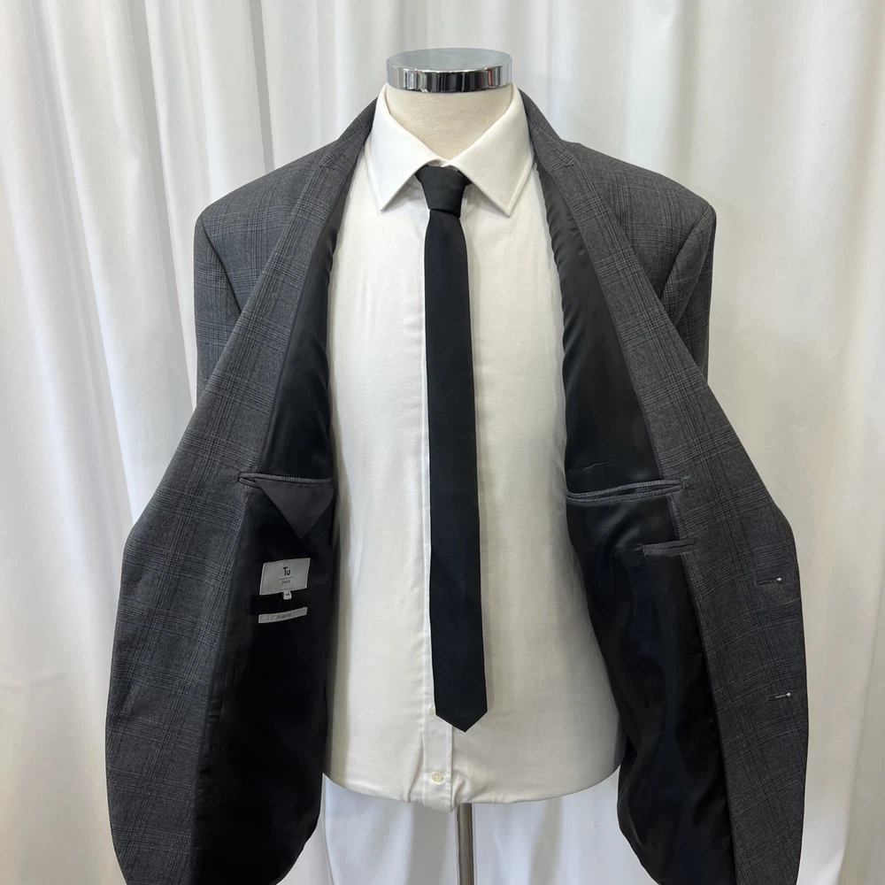 Inside Leg: 31 in Personalisation Instructions: . Country/Region of Manufacture: Cambodia Size: 48R Department: Men Fit: Slim Jacket/Coat Length: Regular Chest Size: 48 Seller Notes: “very good” Jacket Vent Style: Single-Vented Features: Inner Pockets Brand: TU Occasion: Business, Formal, Party/Cocktail, Wedding Colour: Grey Garment Care: Dry Clean Only Waist Size: 44 in Lining Material: Polyester Pattern: Check Number of Pieces: 2 Piece Jacket Sleeve Button Style: Four-Button EAN: Does not apply Jacket Cut: Single-Breasted Leg Style: Tapered gtin13: Does not apply Handmade: No Type: Suit Front Type: Flat Front Size Type: Regular Personalise: No Jacket Front Button Style: Two-Button Material: Polyester, Viscose Vintage: No Season: Autumn, Spring, Summer, Winter Jacket Lapel Style: Notch Style: 2 Piece