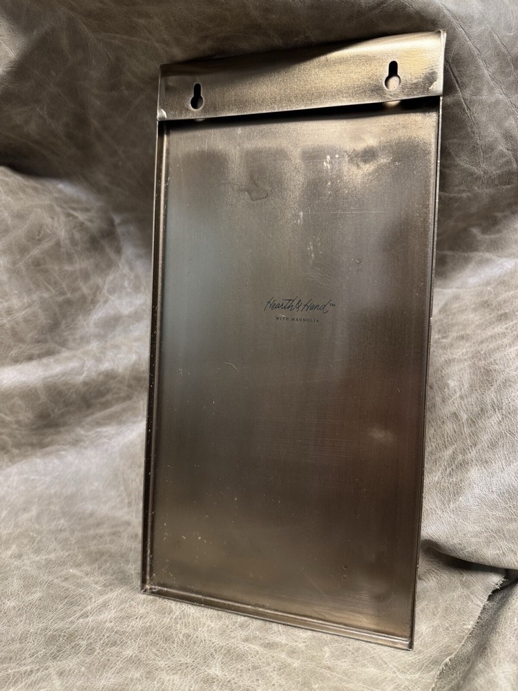 Hearth & Hand with Magnolia metal hanging paper roll with pencil holder. Condition: Minor weathering (rusting around the base of the paper holder). Measurements: 12” x 6”. All measurements are taken to the nearest half inch.