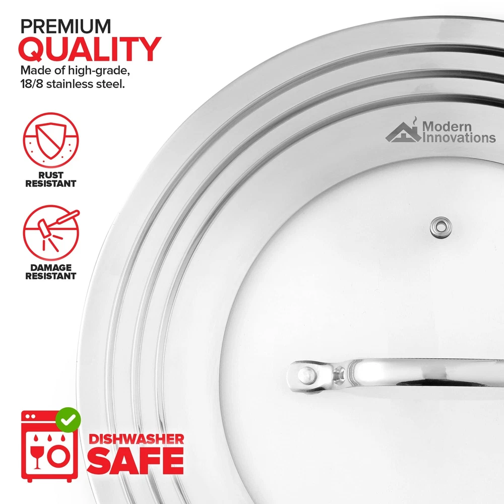 Never search for a matching lid again! This durable 18/8 12" diameter x 2.5" H stainless steel universal lid has a polished finish with a tempered glass insert that allows you to see your food while it's cooking. It fits all frying, saute pans, sauce pans, and stock pots that are between 7 and 12 inches in diameter. Oven safe to 425°F and dishwasher safe, this durable lid will become a kitchen staple in no time. No more going through the hassle of keeping and storing multiple lids, the Modern Innovations Stainless Steel and Glass Universal Lid has you covered. The Ultimate Space Saver: Never search for matching pan covers again! The unique universal design of our lid fits 8.25, 9, 10, 11, and 12 Inch pots and pans. Overall diameter: 12.5”. *Not suitable for cookware with tall handles. Premium Quality: Made of high-grade, 18/8 stainless steel, our replacement cover is rust and damage resistant. It is also dishwasher safe, making clean-up a breeze. Clear Glass Top: The tempered glass top is perfect for watching your food as you cook. The vented hole helps to expel excess moisture and prevent condensation from forming. Heat Resistant: Our lids can withstand up to 425°F (218.3⁰ C). The sturdy, stainless steel handle makes it easy to pick up the lid while you’re cooking. *Caution: Handle gets hot - use an oven mitt or dish rag. Clear Clutter: Why go through the hassle of storing multiple covers? Replace your cookware lids - both small and large - with our universal lid. Perfect for a frying pan, sauté pan, crockpot, sauce pot, and more!