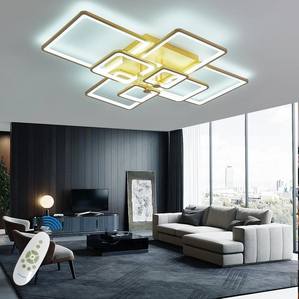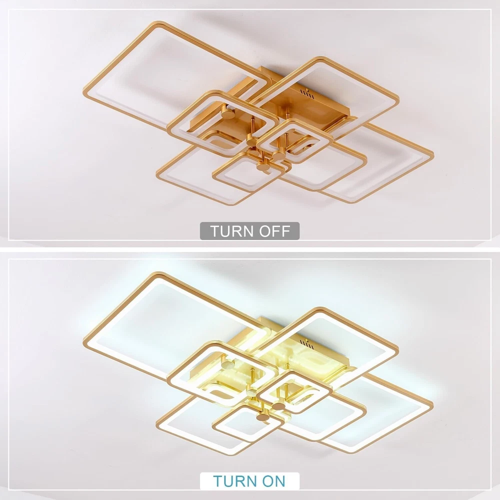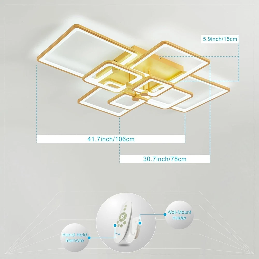 【Exquisite Gold Modern Ceiling Light】Selecting gold-colored elements in home design can help elevate the brightness and comfort of a space. HiHiHomy 8 Squaure gold flush mount ceiling light fixture modern borned. It's a very stunning lighting fixture ceiling that combines elegance with functionality. This exquisite gold ceiling light fixture features a sleek and slim design, making it a perfect fit for modern-style home. Ceiling light is crafted with high-quality gold metal, adding a touch of luxury to any space; 【 Energy-Saving Modern Led Ceiling Lights for Living Room】The light source of this gold ceiling light fixture utilizes energy-saving LED technology, ensuring long-lasting and efficient illumination.HIHIHOMY dimmable modern ceiling light fixture with remote refers to a type of ceiling light that offers continuous dimming capabilities. Stepless dimming allows for adjusting the brightness to any desired level between the minimum and maximum settings, save your electric bill at the most; 【High Color Rendering,Dimmable Modern Ceiling Light with Remote in Gold】The gold flush mount led ceiling light is not only a modern lighting fixture ceiling, but also a stylish artwork to decorate your living room and other interiors.Adjustable color (daylight mode, night light mode), brightness (5%-100%), lumen and the color temperature of the light (warm, white, neutral), the irradiation area is 18 to 30 square meters, and the average life expectancy is 50,000 hours. Voltage: 110V, lumens: over 8000LM; 【Various Spaces Dimmable Led Ceiling Light Fixtue】Upgrade your home with the perfect appeal of the HIHIHOMY 8 Square Modern LED Ceiling Light for living room. Its combination of modern aesthetics, energy efficiency, and wide-ranging applications make it an ideal lighting solution for any space choice like bedroom, living room, kitchen, dining room, study etc. High-quality strength-enhanced aluminum alloy frame, spray painting process. Length 31.5"/width 23.6"/height 4.7",light area is about 10-20m²; 【Customer Service Modern Ceiling Lamps】The gold led ceiling light made of high quality metal plus acrylic lampshade; We have our own factory and a professional engineer team; if you have any question on this ceiling light fixture flush mount with remote control,please contact us anytime,we are together.
