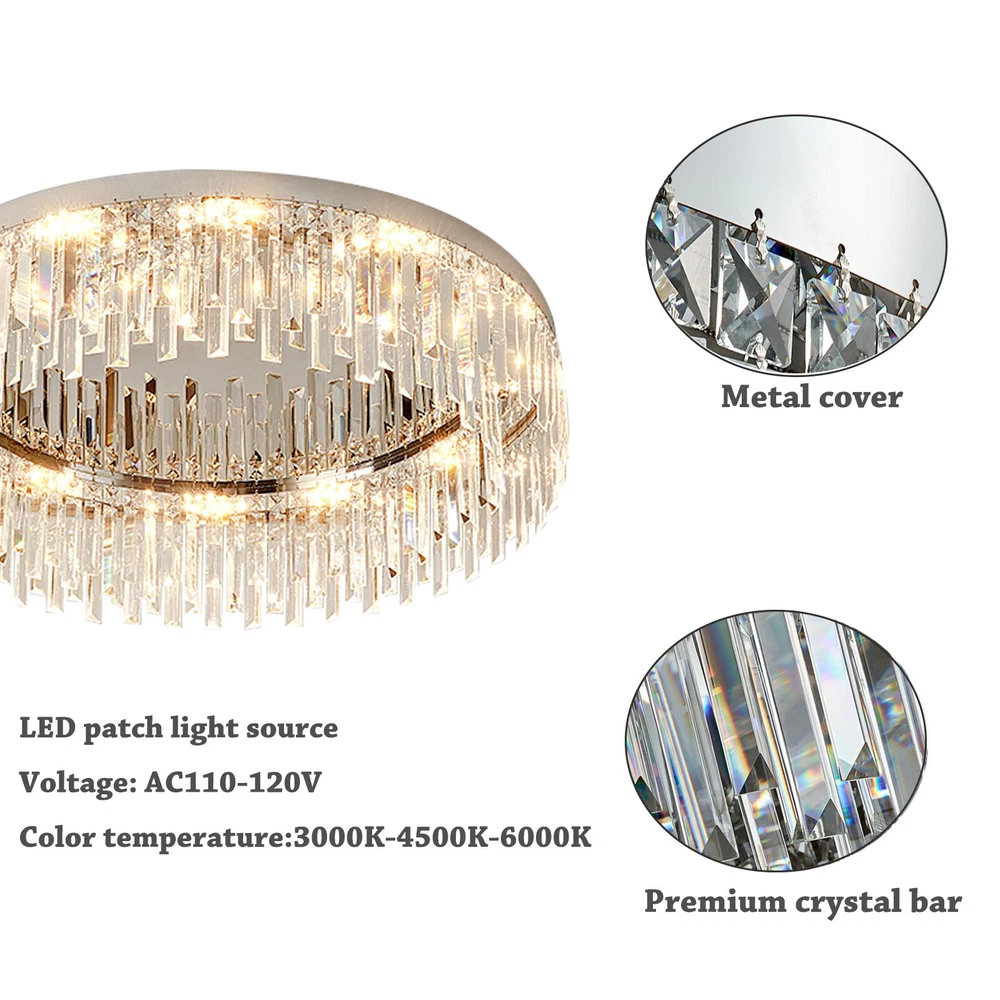 ❤❤❤Welcome to the store.If you have any question , please contact us , and we will reply you as soon as possible. Modern LED Ceiling Light Flush Mount Crystal Chandelier Pendant Lamp Fixture US Description This ceiling lamp mainly uses stainless steel material, making it anti-rust, high-strength, and durable. With beautiful crystals forming the lamp shade, it will cast a shimmering and beautiful reflection on the ceiling when on, adding elegance to your home. In addition, with standard E12 bases, you can choose different style bulbs for less than 40W according to your needs. Key Features High-quality Material: This ceiling lamp adopts stainless steel chassis, lamp body, and frame, making it anti-rust, corrosion-resistant, high-strength, and durable. Beautiful Lighting Effect: Applying the crystals with fine cutting that helps to refract light well, this ceiling lamp casts gorgeous rays on the ceiling to make a beautiful lighting effect and create a warm&romantic atmosphere in your living room. Elegant Appearance: With a unique crystal design, a classic round shape, and chrome color, this ceiling lamp looks very luxurious and elegant and matches your home decoration style, adding beauty and stylish elements to your room. Large Applicable Area: The item can serve an area of 15-20m²/161.4-215.3ft² to illuminate over the entire room. Wide Compatibility: This wall lamp is equipped with standard E12 bases, and you can choose different style bulbs less than 40W such as LED and incandescent to create different lighting effects. Easy to Install : This wall lamp has been assembled (including the crystal strings). You just need to connect the wire reserved on the ceiling and the lamp chassis to install this lamp, which is easy and convenient. And there is an English manual for your reference. Easy to Clean: Due to its stainless steel&crystal material and smooth surface, you can wipe the dirt from it with a wet cloth, which is easy to clean up. Ideal Gift: Thanks to its exquisite design, elegant appearance, and beautiful lighting effect, you can choose this ceiling lamp as a gift for housewarming to your friends. Protective Package: To prevent the product from being damaged and bumped during transportation, we packed it with foam to protect your products to the maximum extent possible. Details Crystal Shade: This ceiling lamp has a clear crystal shade, which is made with evenly distributed crystal prisms in triangle&square pyramid shapes, providing superior quality and presenting multi-angle scattering. The crystal strings are connected by bow-shaped connectors, which adds beauty to the lamp. Stable Chassis: This ceiling lamp is designed with a round stainless steel chassis to ensure stable support for the light body and present classic beauty. Application It is ideal for kitchens, hallways, living rooms, bedrooms, bathrooms, balconies, bars, aisles, foyers, hotels, restaurants, corridors, cafes, dining rooms, children's rooms, libraries, etc. And its applicable area is 15-20m²/161.4-215.3ft². Specifications Model: 5911 Color: Chrome Material: Stainless Steel Shade Material: Crystal Surface Treatment: Cutting Style: Modern Shape: Round Mounting Type: Ceiling Mount/Flush Mount Indoor/Outdoor Usage: Indoor Light Fixture Form: Chandelier Light Direction: Downlight Power Source: AC, Corded Electric Voltage: 110VMax. Bulb Power: 40W Applicable Area: 15-20m²/161.4-215.3ft² Ceiling Lamp Height: 19cm/7.48inch Ceiling Lamp Diameter: 60cm/23.6inch Package Included 1* Ceiling Lamp 1* English Manual Notes Please check the product size before ordering to make sure it fits your room. You need 12 E12 bulbs (not included). Please make sure the power is cut off before installation. Payment Delivery details Terms of sales About us Contact us Payment We accept ebay payment 。 Fees such as import duties, taxes are not included in the item price or shipping costs. These charges are the buyer's responsibility. Delivery details Shipping: 2-9 working days to: USA Terms of sales We maintain high standards of excellence and strive for hundred percent customer satisfaction. Feedback is very important to us. We hope that you contact us immediately before you give neutral or negative feedback, so that we can address your concerns. It is impossible to address issues if we do not know about them! About us Your satis faction is our ultimate goal. We work hard to earn your trust and future business. Our certified technicians have tested each item before shipping. The unit comes with 1 year limited warranty on all manufacturing defects. a) If you receive a defective item, you may return it or ask for a discount. Please contact us within 14 days after you receive the package. b) What you returned must be intact and in its original packaging as re? u. Customer is responsible for shipping costs of the returned item. c) We will cover the cost of shipping back t with the shipping rate indicated in the registration page. We will send you a new unit or refund the full payment you paid. Thank you. Contact us Business Hour Business Hour: Monday To Friday: 8:30 AM to 5:00 PM (Beijing China time) Due to time zones, our reply to your questions may not be immediately. But within above working time, we will reply your email within 24 hours. If it's non-workdays, please kindly be patient and wait till Monday. Please contact us with ebay message. Please feel free to contact us if you have any questions. Monday To Friday: 8:30 AM to 5:00 PM (Beijing China time) Due to time zones, our reply to your questions may not be immediately. But within above working time, we will reply your email within 24 hours. If it's non-workdays, please kindly be patient and wait till Monday. Please contact us with ebay message. Please feel free to contact us if you have any questions. Highlights Compact Design,Unique Appearance,high reliability Brand Unbranded Type Chandelier Sensor Type Light Style Modern Lighting Technology E12 Material Stainless Steel Roo