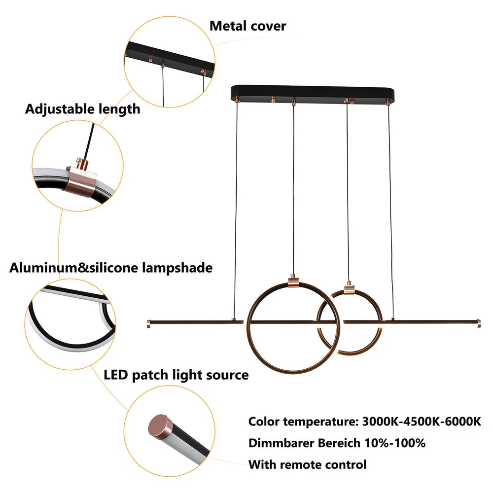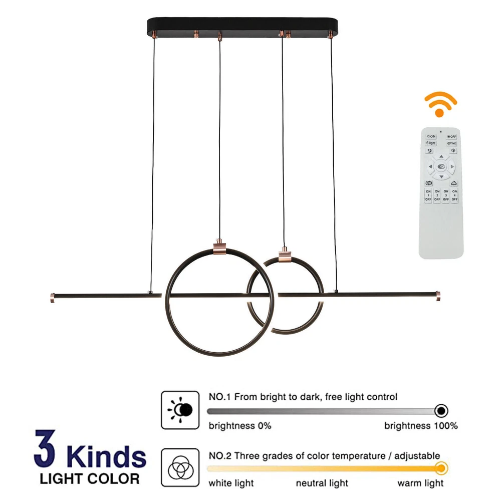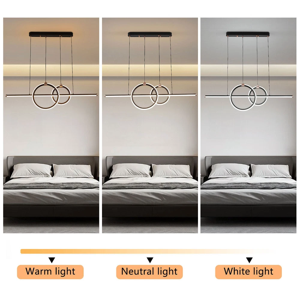 Details 47.2inch Chain: The chain of this light is 1.2m/47.2inch long and can be adjusted, you can adjust it according to the height of your room, so as to play a better role in lighting and decoration. Sturdy Base: The product is equipped with a rectangular base with a size of 20.27*2.36inch, which increases stress area, and can make the pendant light fixed firmly. Silicone Lampshade: It can not only make the light soft and bright but also prevent dust from entering the interior, reducing the cleaning difficulty. Modern LED Kitchen Island Light Pendant Chandelier Ceiling Fixture Lamp w/Remote Welcome to our store~ Description A good pendant light can add a sense of atmosphere and charm to a room. Our pendant light adopts intelligent operation and high-end aluminum and iron materials to ensure long-term use. In addition, the product adopts the stepless dimming mode, which greatly facilitates your life. Both as a decorative or illumination, this pendant light is your ideal choice. Key Highlights High-end Material: This light is made of aluminum and iron, and adopts an oxidation process, making product resistant to oxidation and corrosion, so it can keep beautiful and practical for a long time, and you and your family can use it with confidence. Stepless Dimming: This light has three light colors: white light, neutral light, and warm light, and the color temperature is 3000-6500k. It adopts stepless dimming, so you can adjust the appropriate brightness and color temperature with the remote control to meet different needs. Intelligent Timing: The timing range of this product is 10 hours. Each press of the remote control increases or decreases by half an hour. You can choose freely within this range, which is conducive to reducing waste and ensuring a good sleep without having to turn off the lights. LED Source: The product uses an eye-friendly LED light source, which is not only energy-saving but also non-stroboscopic, and it can be used for about 30000 hours, saving your use cost. Night Light and Energy-saving Mode: There is a night light mode and energy-saving mode button on the remote control, which can create a comfortable night environment for you, laying a solid foundation for a good mental state the next day, and saving your electricity fees. Attractive Appearance: Different from other products in the market, this product is a waved design with gold color and smooth lines, which is easier to attract people’s attention and can well match rooms of various decoration styles, adding a warm and elegant atmosphere and charm. Easy to Use: The light is equipped with a remote controller that has powerful functions. There are various buttons on the remote controller, corresponding to different functions. You just need to follow the instructions, which is very convenient. Ideal Gift: With a fashionable appearance and complete functions, this item can be regarded as a gift for parents, friends, and lovers, and it can be regarded as a gift for housewarming, birthdays, and holidays. Effortless Cleaning: The light has a simple structure and a smooth surface. When dust accumulates, you only need to use a towel to clean it. Protective Packaging: In order to better protect your product during transportation, we use plastic film and foam in the packaging to ensure that it can be delivered to you completely. Specifications 47.2inch Chain: The chain of this light is 1.2m/47.2inch long and can be adjusted, you can adjust it according to the height of your room, so as to play a better role in lighting and decoration. Sturdy Base: The product is equipped with a rectangular base with a size of 20.27*2.36inch, which increases stress area, and can make the pendant light fixed firmly. Silicone Lampshade: It can not only make the light soft and bright but also prevent dust from entering the interior, reducing the cleaning difficulty. Application This pendant light is suitable for an area of 13m²/139.93indoors, such as entryways, hallways, foyers, restaurants, studios, double rooms, children’s rooms, bedrooms, exhibition halls, clothing stores, coffee shops, bars, and shops. Specification Color: Gold Material: Aluminum, Silicone, Iron Surface Treatment: Oxidation Style: Modern Shape: Wave Light Source Type: LED Color of Light: White, Neutral, and Warm Light Color Teperature: 3000-6500K Power: 45w Voltage: 95-265V Type: US Standard Timing Range: 0-10hour Brightness: From 5% to 100% Energy Efficiency Class: A ++ Service Time: About 30000hours Luminous Flux: 3200Lumen Battery Type: 2 AAA(Not Included) Control Method: Remote Number of Items: 1 Light Fixture Form: Pendant Assembly Required: Yes Mount Type: Ceiling-mounted Base Size: 51.5*6*3.5cm/20.27*2.36*1.38inch Chain Length: 1.2m/47.2inch Product Height: Big circle 30cm/11.81inch,Small circle22cm/8.66in. Product Length: 1m/39.3inch Applicable Area: 13m²/139.93ft² Package Included 1* Pendant Light 1* Remote Control 1* English Manual All Accessories for Installation Notes 1.Please operate and use the product in strict accordance with the instructions. 2.Please make sure that the power supply has been cut off before installation, and conduct a power test before installation. 3.Please use the lamp within the applicable voltage range. 4.Please note that the batteries for the remote are not included in the package, you need to prepare two AAA batteries yourself. 5.Please allow the slight color difference caused by the shooting light and 1-3cm error due to manual measurement, and make sure you do not mind before ordering. Payment Delivery details Terms of sales About us Contact us Payment We accept ebay payment 。 Fees such as import duties, taxes are not included in the item price or shipping costs. These charges are the buyer's responsibility. Delivery details Shipping: 2-9 working days to: USA Terms of sales We maintain high standards of excellence and strive for hundred percent customer satisfaction. Feedback is very important to us. We hope that you contact 