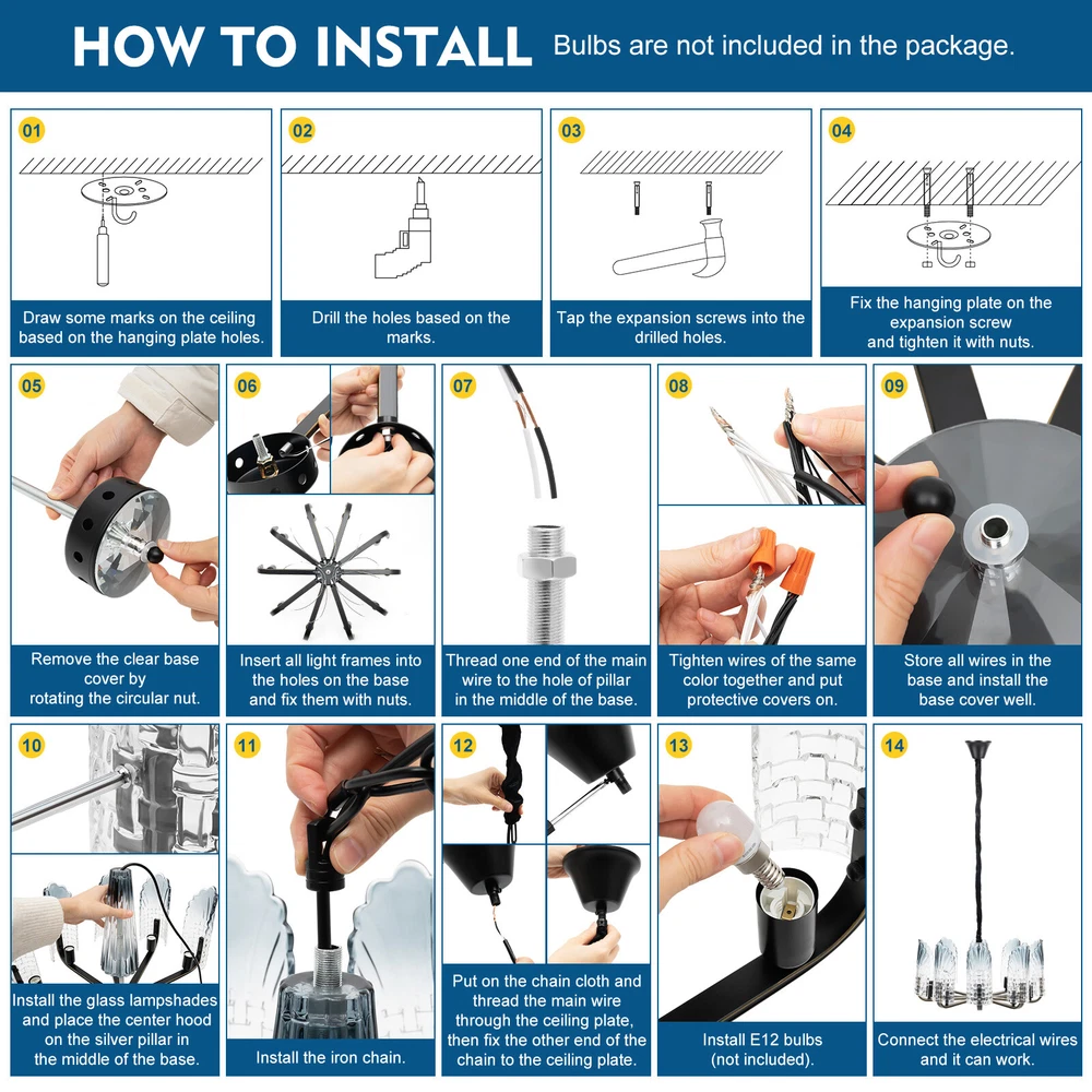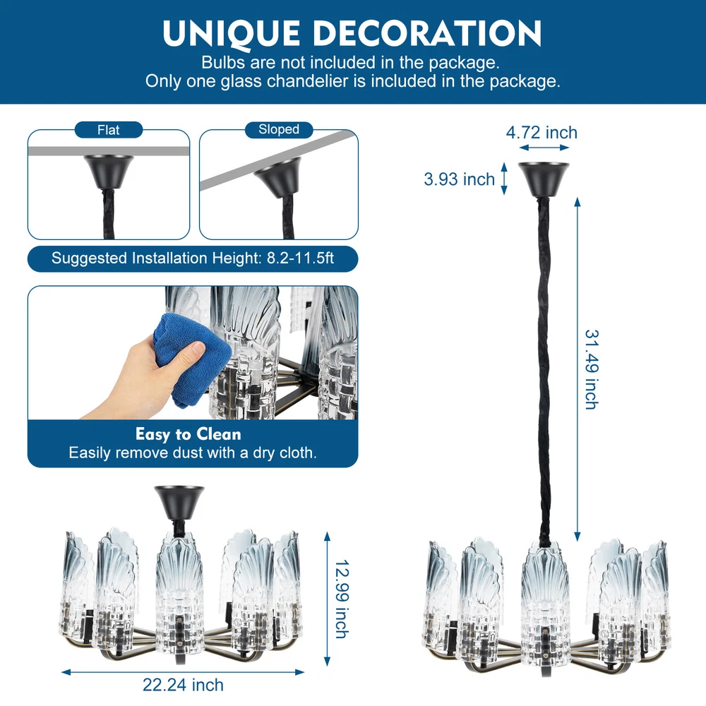 Modern Luxury Crystal Glass LED Pendant Lamp Chandelier Ceiling Light Fixture US Description People who like uniqueness and elegance will love this glass chandelier. Its unique and clear glass lampshades make it look more modern, which also can make the light brighter. The ornamental three-dimensional sense will greatly create a gorgeous ambiance for your room, giving you a great surprise. Key Features Standard Lamp Holder: The standard E12 lamp holders can support the use of LED and incandescent bulbs (not included), making it very convenient for you to purchase and replace. Durable and Sturdy: It consists of iron frames with welding and baking paint process, thick glass material lampshades with baking paint process, and an iron chain with cloth cover, making it wear-resistant, rust-resistant, corrosion-resistant, and sturdy. Adjustable Height: The length of 31.49 inches iron chain allows you to easily adjust the height of the chandelier to fit different heights of the ceiling to meet your different needs. Excellent Lighting Effect: The light bulbs (not included) enclose in a circle with a corresponding lampshade, which forms a scattered lighting effect with an area of approximately 161.45-215.27ft² when turned on. You can also purchase adjustable light bulbs to create different atmospheres with different brightness levels. Easy to Clean: The glass lampshades and baking paint iron base allow you to easily remove dust from it with a dry cloth or feather duster. Unique Decoration: The beautiful pattern on each lampshade is combined with the black iron chain above, and the light bulbs (not included) are surrounded in the middle, to bring a unique new Chinese style beauty to your home. Easy Installation: The simple structure, hook design, complete accessories, and detailed instructions allow you or professionals to easily and quickly install this product. Protective Packaging: This product comes in a custom foam board that resists compression and falls to prevent product damage in transit. Details Hanging Plate: It's made of iron with a hook, which can connect the chandelier through the iron chain and fix it on the ceiling with screws easily. Ceiling Plate: It measures 4.72*3.93 inches, increasing the contact area with the ceiling, so that the chandelier body is firmly fixed on the ceiling and not easy to fall. Iron Chain Cover: It's made of soft and high-quality cloth, which can protect the chain from dust and rust. Screw Holes: Each lampshade has two screw holes to fix it on the chandelier frames, offering great stability. Application It is very suitable for corridors, farmhouses, kitchens, nurseries, staircases, dining rooms, bedrooms, living rooms, entrances, foyers, rest areas, reading corners, attics, plant areas, etc. with a height between 8.2-11.5ft, and works well with incandescent or LED bulbs in E12, providing an illumination area about 161.45-215.27ft². How to Install 1. Draw some marks on the ceiling based on the hanging plate holes. 2. Drill the holes based on the marks. 3. Tap the expansion screws into the drilled holes. 4. Fix the hanging plate on the expansion screw and tighten it with nuts. 5. Remove the clear base cover by rotating the circular nut. 6. Insert all light frames into the holes on the base and fix them with nuts. 7. Thread one end of the main wire to the hole of pillar in the middle of the base. 8. Tighten wires of the same color together and put protective covers on. 9. Store all wires in the base and install the base cover well. 10. Install the glass lampshades and place the center hood on the silver pillar in the middle of the base. 11. Install the iron chain. 12. Put on the chain cloth and thread the main wire through the ceiling plate, then fix the other end of the chain to the ceiling plate. 13. Install E12 bulbs (not included). 14. Connect the electrical wires and it can work. 15. Bulbs are not included in the package. Specifications Material: Iron, Glass, Cloth Surface Treatment: Baking Paint, Welding Color: Clear, Blue, Black Shape: Round Style: New Chinese Style Light Fixture Form: Chandelier Control Mode: Switch Type Indoor/Outdoor Usage: Indoor Number of Bulbs: 10PCS (Not Included) Light Source Type: LED, Incandescent Bulb Lamp Holder: E12 Efficiency: E Assembly Required: Yes Power Source: Corded Electric Installation Type: Ceiling Mount Special Feature: Adjustable Height Voltage: 110V Single Bulb Power: 5-16W Illumination Area: 15-20㎡/161.45-215.27ft² Suggested Installation Height: 2.5-3.5m/8.2-11.5ft Chain Length: 80cm/31.49in Ceiling Plate Size(D*H): 12*10cm/4.72*3.93inch Gross Weight: 9kg/19.84lbs Net Weight: 7.55kg/16.64lbs Product Size (D*H): 56.5*33cm/22.24*12.99inch Package Size: 45*45*45cm/17.71*17.71*17.71inch Package Included 1*Glass Chandelier 1*English Manual All Accessories for Assembly Notes Please note that the light bulbs are not included in the package. It can be installed on a horizontal or inclined ceiling. Before installing or cleaning the chandelier, please cut off the power supply first. We suggest that this product be installed by professional personnel. Please allow the slight color difference caused by the shooting light and 1-3cm error due to manual measurement, and make sure you do not mind before you order. Payment Delivery details Terms of sales About us Contact us Payment We accept ebay payment 。 Fees such as import duties, taxes are not included in the item price or shipping costs. These charges are the buyer's responsibility. Delivery details Shipping: 2-9 working days to: USA Terms of sales We maintain high standards of excellence and strive for hundred percent customer satisfaction. Feedback is very important to us. We hope that you contact us immediately before you give neutral or negative feedback, so that we can address your concerns. It is impossible to address issues if we do not know about them! About us Your satis faction is our ultimate goal. We work hard to earn your trust and future business. Our