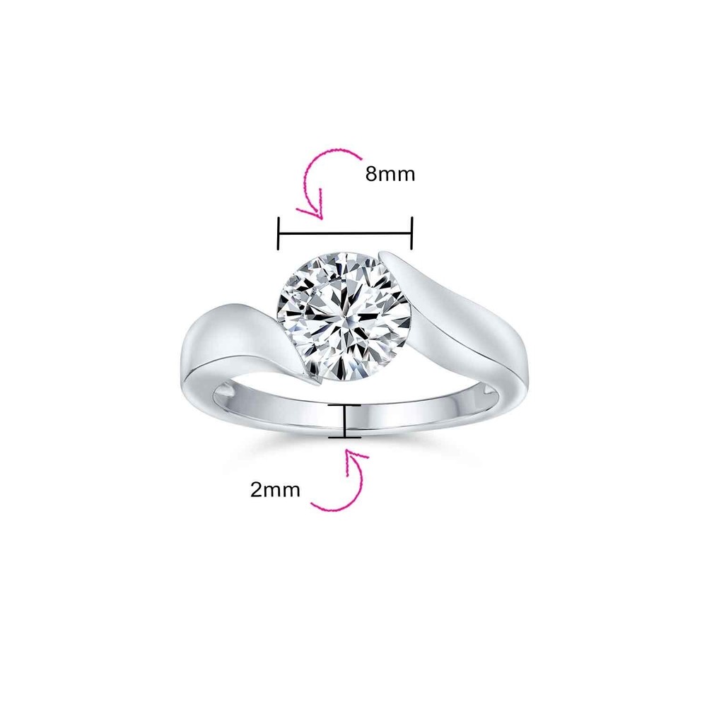Personalize Modern Simple Minimalist .5, 3,1CTW Cubic Zirconia AAA CZ Bezel Set Round Solitaire Promise Engagement Ring For Women .925 Sterling Silver Plain Band Customizable Product Details Color: Clear Ring Size: 5 Brand: Bling Jewelry MPN: SHN-KR4961 UPC: 640626726221 EAN: 0640626726221 Is Discontinued By Manufacturer : No Package Dimensions : 1.75 x 1.75 x 0.7 inches; 0.29 ounces Item model number : SHN-KR4961 Department : womens Date First Available : June 20, 2012 Manufacturer : Bling Jewelry Brand, Seller, or Collection Name: Bling Jewelry Metal stamp: 0.925 Metal: Rhodium-plated silver Material: gemstone, Metal Gem Type: Cubic Zirconia Minimum total gem weight: 2.00 carats Setting: tension-mount-setting Item Length: 0.61 inches Width: 8 millimeters Ring size: 5 Resizable: Yes Number of stones: 1 Stone Weight: 2.00 carats Model number: V-R71424-5 Size per pearl: not-applicable This .75 carat cubic zirconia solitaire engagement ring will leave any woman speechless. The timeless look on this silver .75 CT cubic zirconia solitaire engagement ring will never go out of style. The round, solitaire cubic zirconia stone on this stunning sterling silver solitaire engagement ring is the epitome of elegance. This cubic zirconia solitaire engagement ring is also made from .925 sterling silver, a long lasting material, able to outlive the memories you will surely make with this classic beauty. The medium sized band on this bezel set cubic zirconia engagement ring will fit comfortably on her finger for years into the future. --- This .75 carat cubic zirconia solitaire engagement ring will leave any woman speechless. The timeless look of this silver .75 CT cubic zirconia solitaire engagement ring will never go out of style. The round, solitaire cubic zirconia stone on this stunning sterling silver solitaire engagement ring is the epitome of elegance. This cubic zirconia solitaire engagement ring is also made from .925 sterling silver, a long-lasting material, able to outlive the memories you will surely make with this classic beauty. The medium-sized band on this bezel set cubic zirconia engagement ring will fit comfortably on her finger for years into the future.