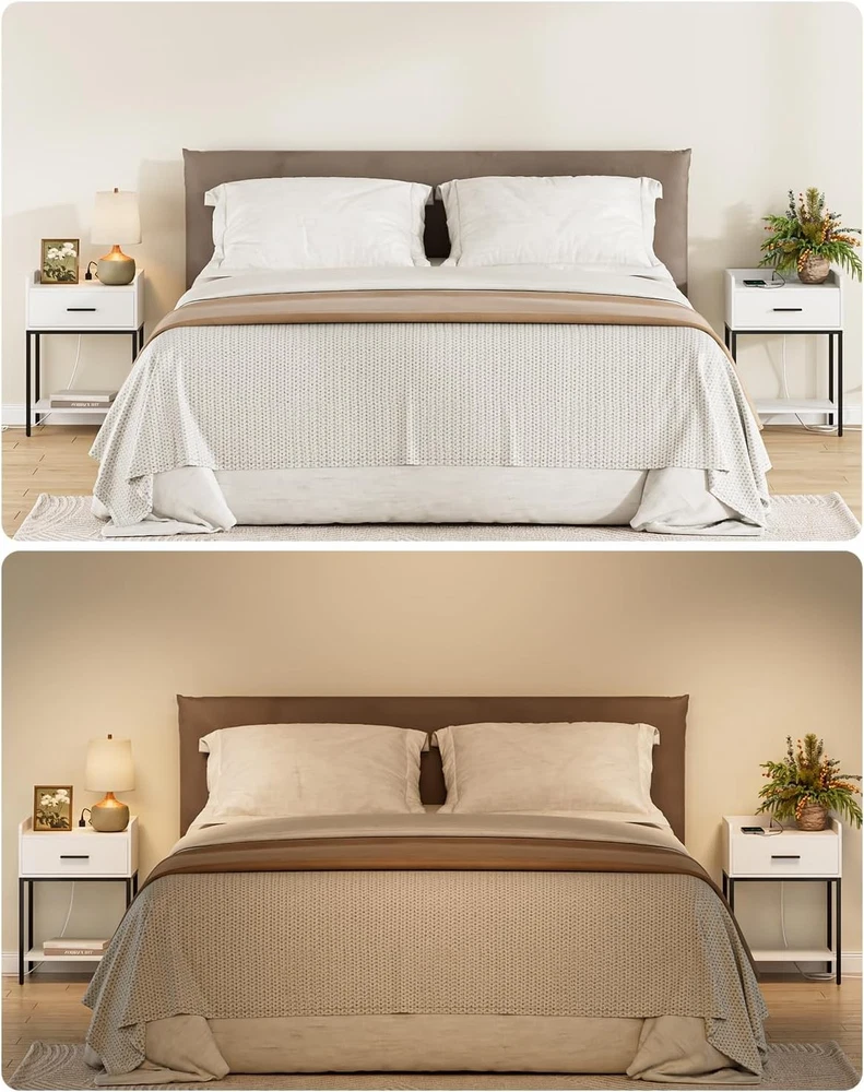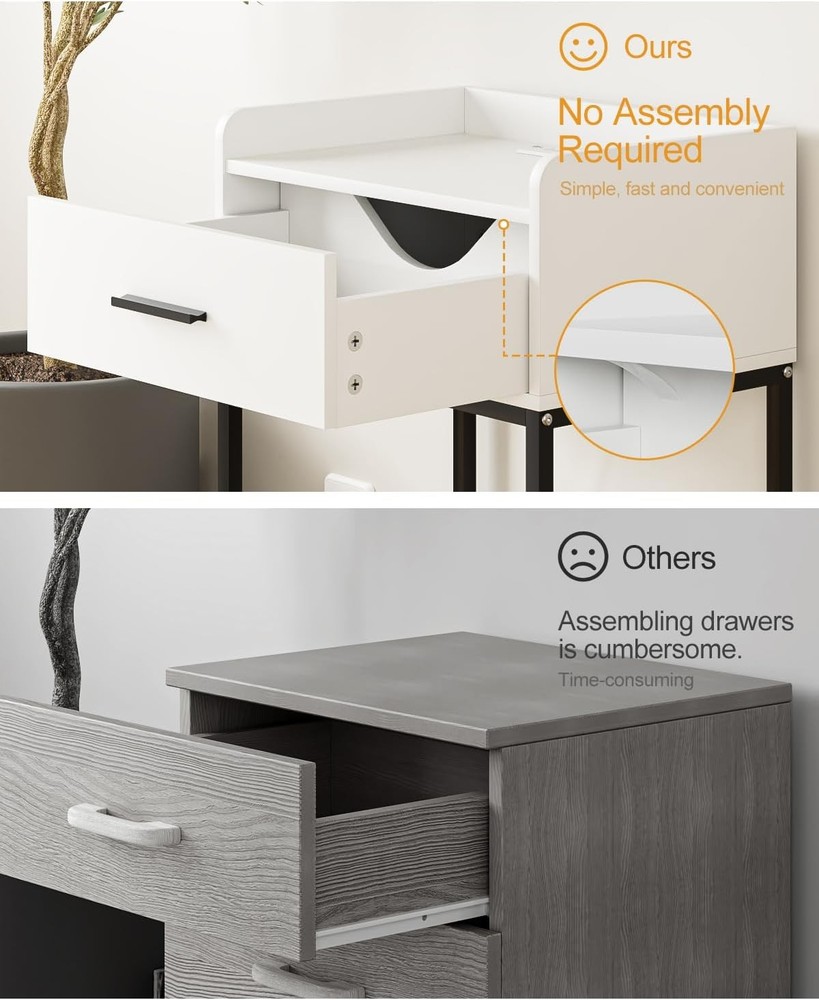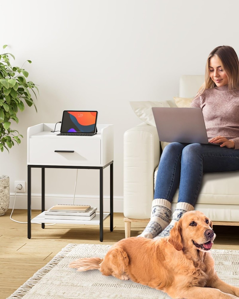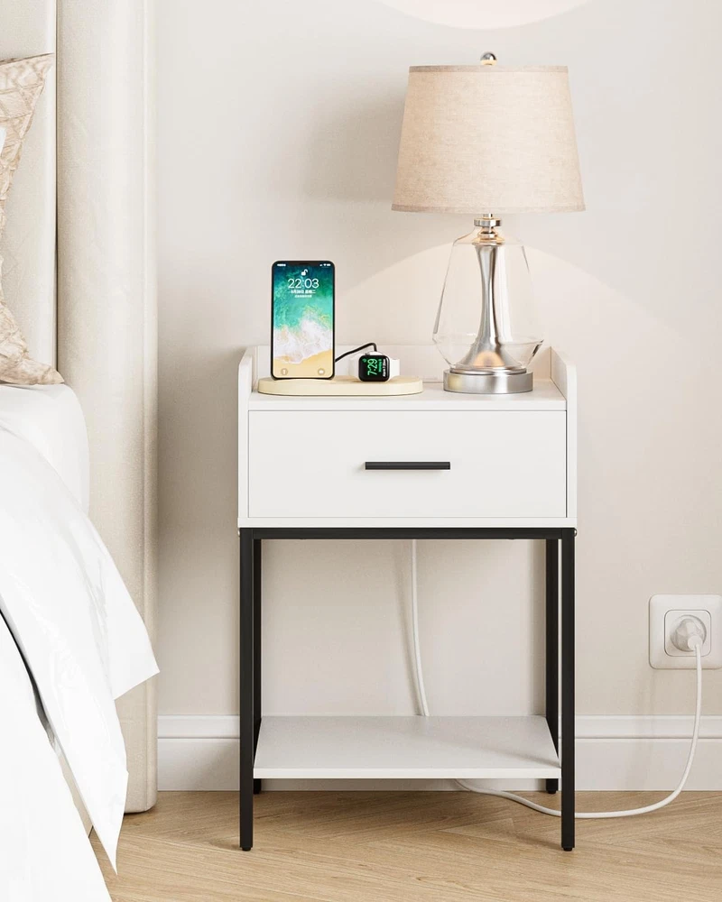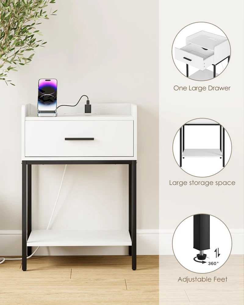Nightstand with Charging Station,Bedside Table Drawer White-black Legs Product Details Brand: AEPOALUA Product Dimensions: 11.8"D x 16.53"W x 23.62"H Maximum Weight Recommendation: 11 Pounds Color: White-black Legs Base Type: Pedestal Item WeightFrame Material: 11 PoundsEngineered Wood Top Material TypeShape: Engineered WoodRectangular Modern White Bedside Table: The white and black color combination and eye-catching appearance make it a uniquely designed nightstand, suitable for various styles of home decoration, accompanying you every fresh morning. Large Storage Space: Measuring 11.81"d x 16.54"w x 23.62"h, this coffee table's compact size and large storage space make the small nights tand perfect for small spaces. The height of this nightstand is 23.62"h, making it suitable for placing in your bedside, sofa side, and suitable for bedrooms, living rooms and desks. Bedside Charging Helper: This nightstand has built in 2 AC outlets and 2 USB ports. Whether it is by the bed or the sofa, you can enjoy the fun of timely and rapid charging without worrying about insufficient power and cluttered wires, fully meeting your charging needs. Multi-Scenario Use: This side table has a drawer and two open shelves. Anti-drop bezel design provides perfect storage space for your desk lamp, remote control and mobile phone. Imagine relaxing next to this stylish piece of furniture while enjoying a cup of coffee. Modern design, the best nightstand for friends and family. High Quality Material, Sturdy and Stable:The end table is made of high quality MDF board with gold iron frame. Strong and durable. The bottom has adjustable feet, which not only can be placed stably on the floor, but also prevent scratches on the floor and reduce noise when moving. Easy to Assemble: The wooden nightstand comes with detailed instructions and all necessary parts in the package. You can easily install this Nightstand, and quickly clean and use. Please feel free to contact us if you have any questions on Nightstand.