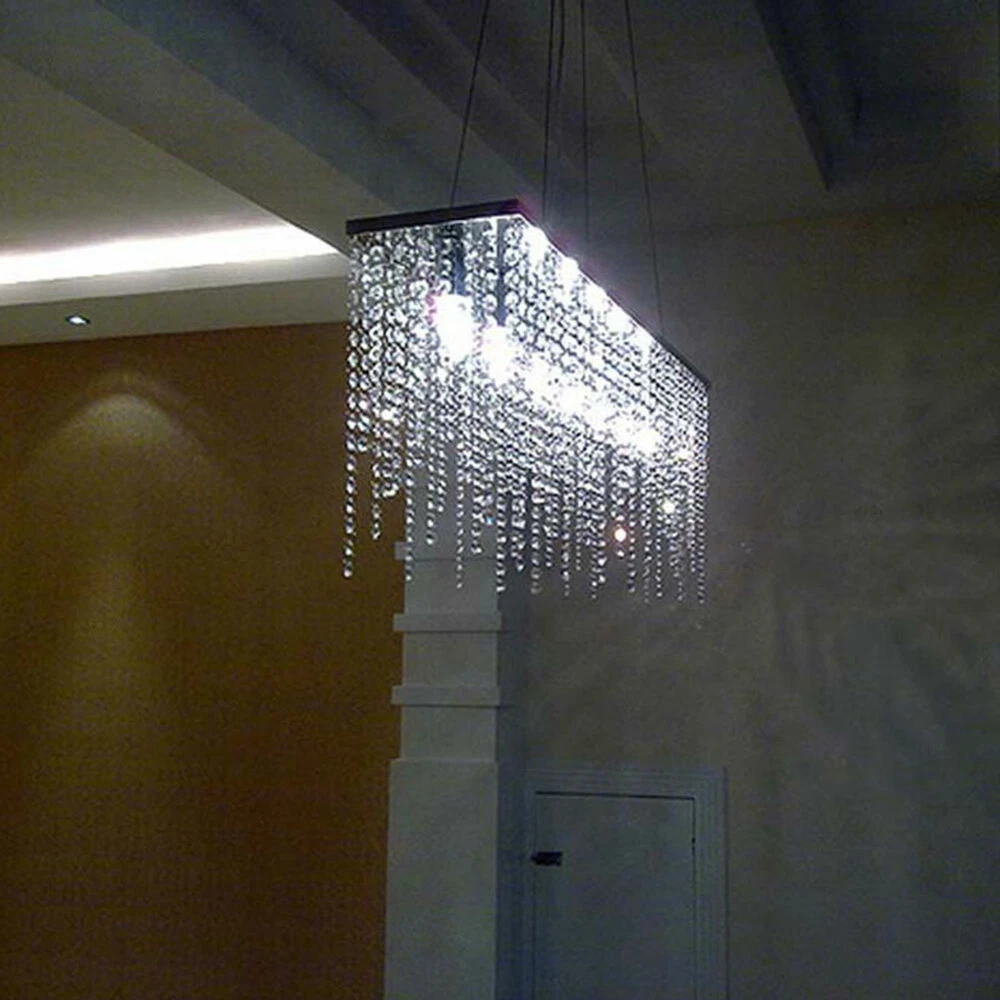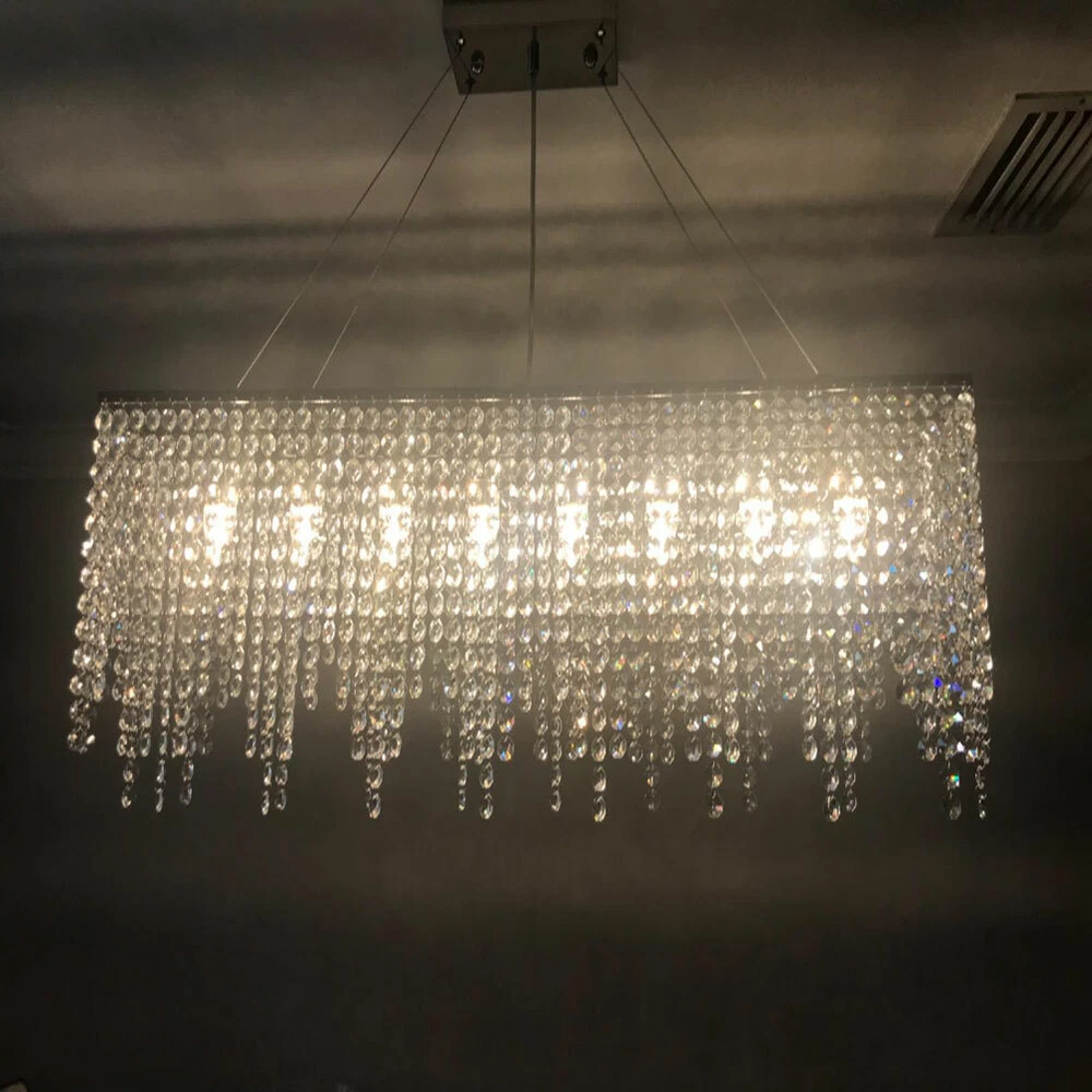 Description: Rain drop collection, sparkles from every angle. Full Assembly Required with time and effort. Feature: Material: Polished chrome stainless steel canopy and frame, top K9 clear crystal Dimension: Length 32" (80cm), Width 8" (20cm), Height 16" (40cm). Pendant wire: adjustable 59"(150cm) Light Source:E12 x 7 Bulbs Required (Max 40W each, NOT included). Works with incandescent, LED, CFL, halogen or color changing bulbs up to 40W. Fully dimmable when used with dimmable bulbs and a compatible dimmer switch (not included). Application: Ideal for living room, dining room, kitchen island, bedroom, foyer, indoor, farmhouse, sloped ceiling, bar, restaurants, galleries, exhibition room, hotel, coffee shop, office. Modern Rectangular Raindrop Crystal Chandelier Light Ceiling Light Pendant Lamp Description: Rain drop collection, sparkles from every angle. Full Assembly Required with time and effort. Feature: Material : Polished chrome stainless steel canopy and frame, top K9 clear crystal Dimension : Length 32" (80cm), Width 8" (20cm), Height 16" (40cm). Pendant wire: adjustable 59"(150cm) Light Source : E12 x 7 Bulbs Required (Max 40W each, NOT included) . Works with incandescent, LED, CFL, halogen or color changing bulbs up to 40W. Fully dimmable when used with dimmable bulbs and a compatible dimmer switch ( not included) . Application: Ideal for living room, dining room, kitchen island, bedroom, foyer, indoor, farmhouse, sloped ceiling, bar, restaurants, galleries, exhibition room, hotel, coffee shop, office. Payment Delivery details Terms of sales About us Contact us Payment We accept ebay payment 。 Fees such as import duties, taxes are not included in the item price or shipping costs. These charges are the buyer's responsibility. Delivery details Shipping: 2-9 working days to: USA Terms of sales We maintain high standards of excellence and strive for hundred percent customer satisfaction. Feedback is very important to us. We hope that you contact us immediately before you give neutral or negative feedback, so that we can address your concerns. It is impossible to address issues if we do not know about them! About us Your satis faction is our ultimate goal. We work hard to earn your trust and future business. Our certified technicians have tested each item before shipping. The unit comes with 1 year limited warranty on all manufacturing defects. a) If you receive a defective item, you may return it or ask for a discount. Please contact us within 14 days after you receive the package. b) What you returned must be intact and in its original packaging as re? u. Customer is responsible for shipping costs of the returned item. c) We will cover the cost of shipping back t with the shipping rate indicated in the registration page. We will send you a new unit or refund the full payment you paid. Thank you. Contact us Business Hour Business Hour: Monday To Friday: 8:30 AM to 5:00 PM (Beijing China time) Due to time zones, our reply to your questions may not be immediately. But within above working time, we will reply your email within 24 hours. If it's non-workdays, please kindly be patient and wait till Monday. Please contact us with ebay message. Please feel free to contact us if you have any questions. Monday To Friday: 8:30 AM to 5:00 PM (Beijing China time) Due to time zones, our reply to your questions may not be immediately. But within above working time, we will reply your email within 24 hours. If it's non-workdays, please kindly be patient and wait till Monday. Please contact us with ebay message. Please feel free to contact us if you have any questions. Features Durable Category Lighting Number of Bulbs 7 E12 Bulbs ( Not Included) Material Aluminum, K9 Crystal Item Length 80cm/31.5inch Pendant Wire Adjustable 150cm/59inch Voltage 110-120V Item Height 35cm/13.77inch Style Crystal, Modern Item Width 20cm/7.87inch Recommended Room Size 15-20㎡/161-215sq. ft Ceiling Chassis Size 17.5*8.89cm/6.89*3.5inch * Feature * Creative Design,Durable Material,Beautiful Appearance Note: Do not send to Brazil Bundle Description: No Feature 1 *Stable characteristic*, *high reliability* shipping notice Can not ship to Puerto Rico,Alaska/Hawaii Item location: CA /NJ /Austell Transportation does not include: canarias Power Source Hardwired MPN Does Not Apply Shade Shape Rain Drop Power Consumption Max 40W each, NOT included Room Bedroom, Dining Room, Home Office/Study, Living Room, Porch Lighting Technology LED Installation Area Indoor Manufacturer Warranty 2 years Department Adults Light Color Warm White Finish Polished Brand Unbranded Color Clear Item Diameter 16 in Type Chandelier