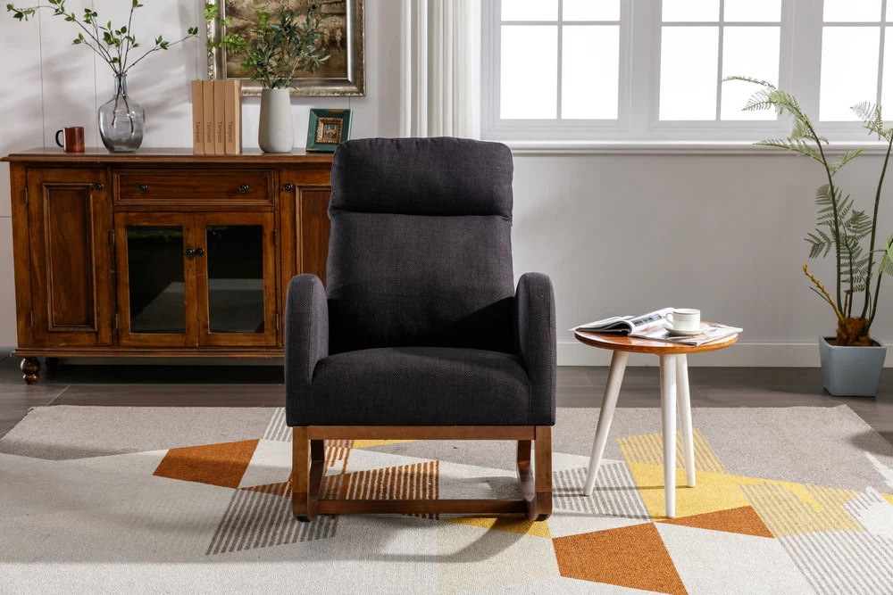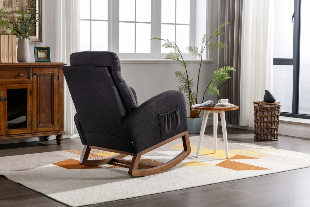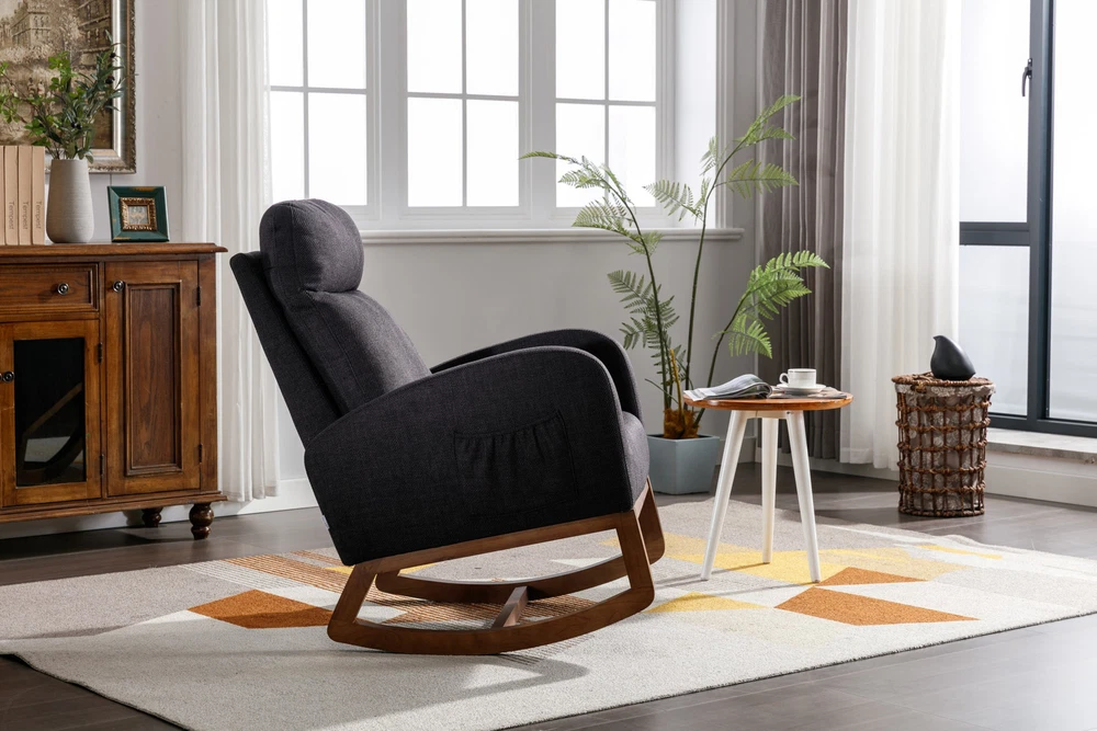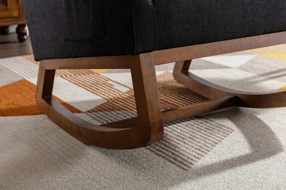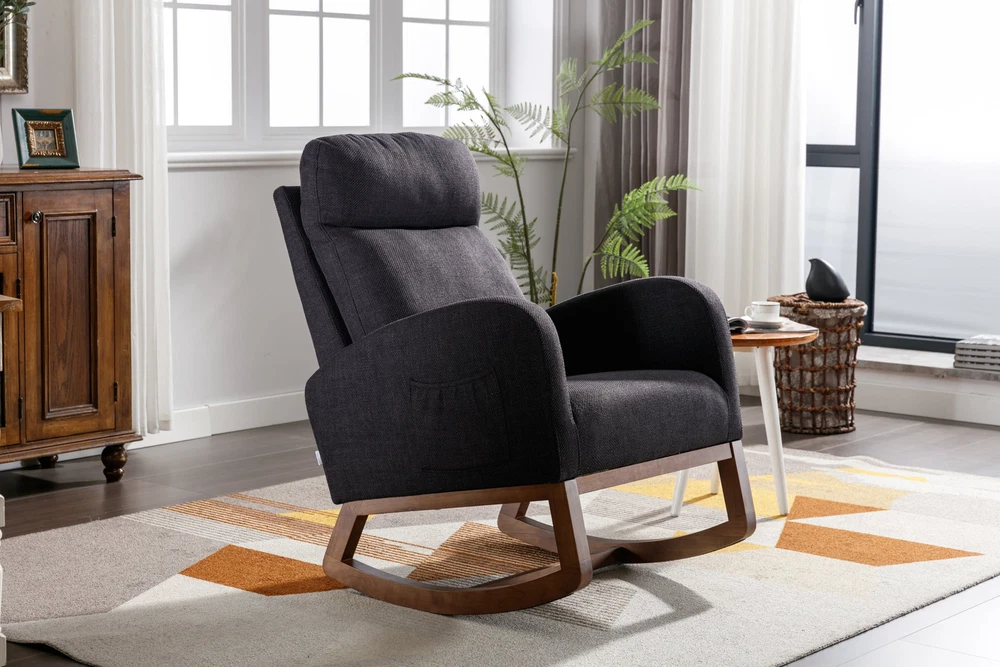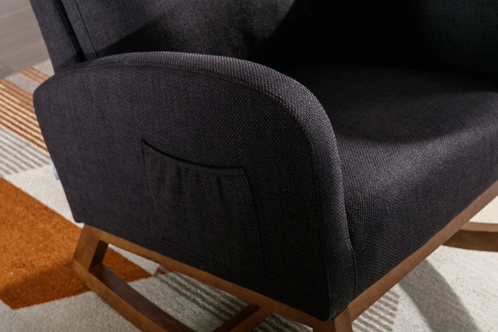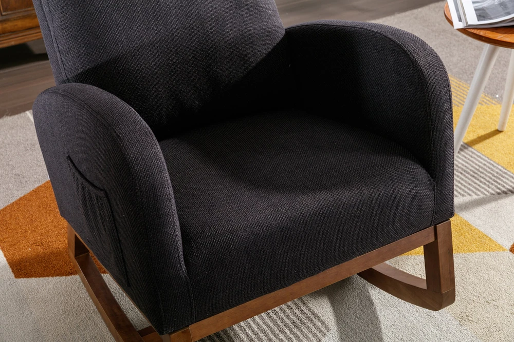 Specifications Place of Origin China Main Color Black Main Material Linen Filler Foam Dangerous Goods #dangerFlag# Dimensions & Weights Assembled Length (in.) 37.01 Assembled Width (in.) 27.17 Assembled Height (in.) 39.76 Weight (lbs) 45.29 Product Features Our modern rocking chair is designed for relaxation and comfort. giving you a larger sitting area and a comfortable sitting experience while reading, crocheting or taking a short nap. You can put a read book or magazine in a indoor rocking chair with side pockets. This glider rocking chair is ideal for living rooms, nurseries, bedrooms, study rooms and any other room in the home. The wide and long armrests also provide ample space for your arms to rest and relax. With a combination of elegant appearance and rocking function, this fabric accent chair is ideal for living rooms, nurseries, bedrooms, study rooms and any other room in your house. We offer the required hardware, tool, and an illustrated manual to help you in assembling the chair within 20 minutes. Description Mid-Century Modern Nursery Rocking Armchair Upholstered Tall Back Accent Glider Rocker The rocking chair provides a unique place to drink a cup of coffee, read a wonderful book, or comfortably pass the time. Durable and sturdy structure: The entire frame is made of solid wood, sturdy enough to support 300 pounds. Covered with high-quality fabric and filled with high-density soft sponge. High backrest and comfortable armrests: This ergonomic modern rocking chair provides strong support for your entire body. The high backrest provides you with great comfort and safety. More importantly, placing your hands or arms on comfortable armrests will reduce fatigue. Modern design: This rocking chair feels at home in the nursery, living room or any Shared space. The high back contour design and ergonomic arm height add more charm to this piece. Easy installation: Our rocking chair is easy to assemble. It can be assembled within 10 minutes. Including all hardware and components. Back and sides Made of high-quality rattan fabric, the rocking chair is not only durable but also comfortable. The pocket design allows you to conveniently store small items like your phone or remote control while relaxing. The soft cushion provides excellent support and comfort, making it perfect for long periods of sitting. The ergonomic design of the backrest and the integrated pillow ensure that you can lean back and relax with ease. Versatile and adaptable, this rocking chair is suitable for various scene