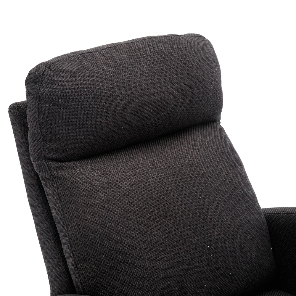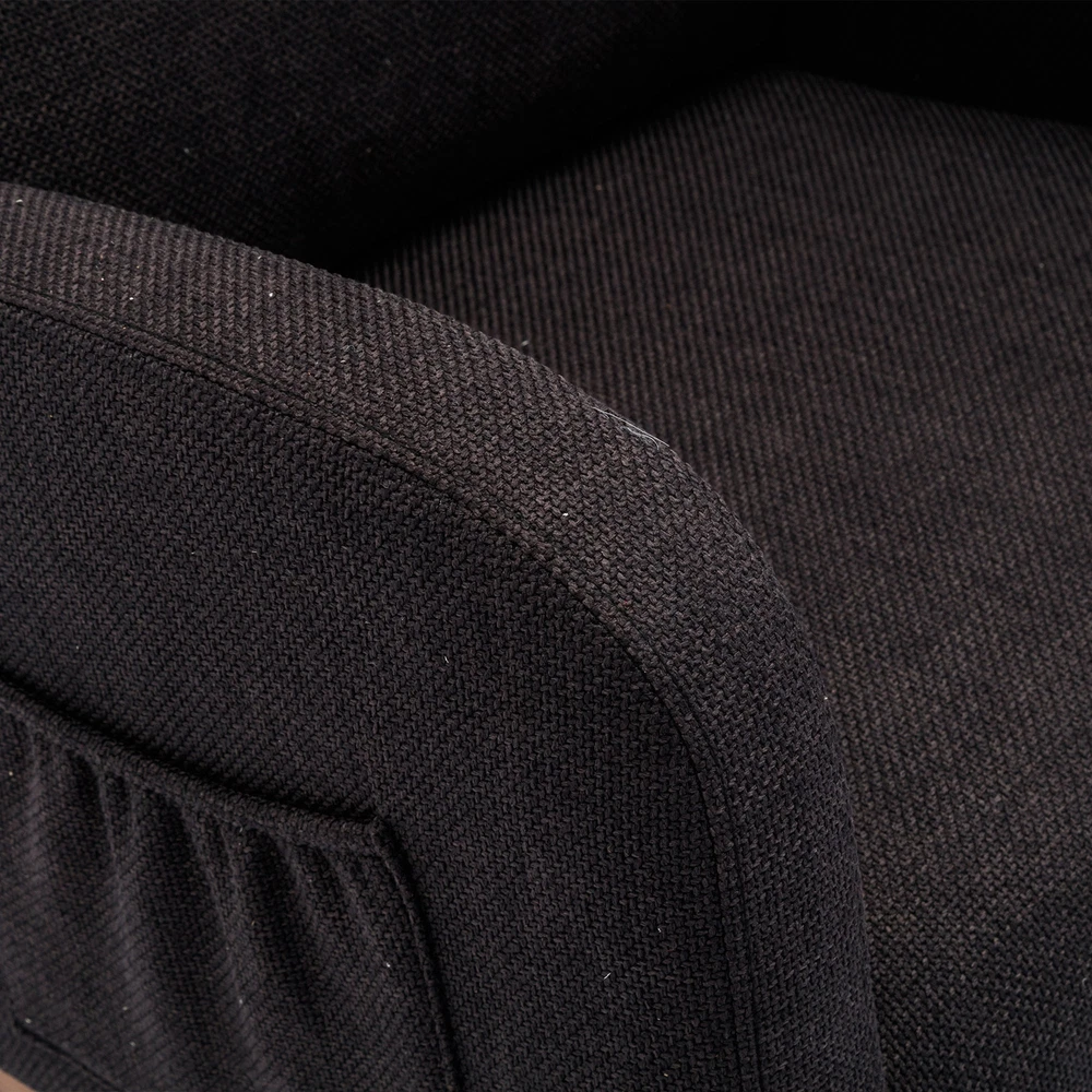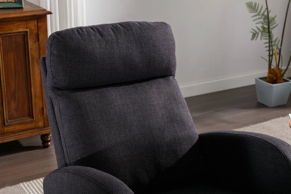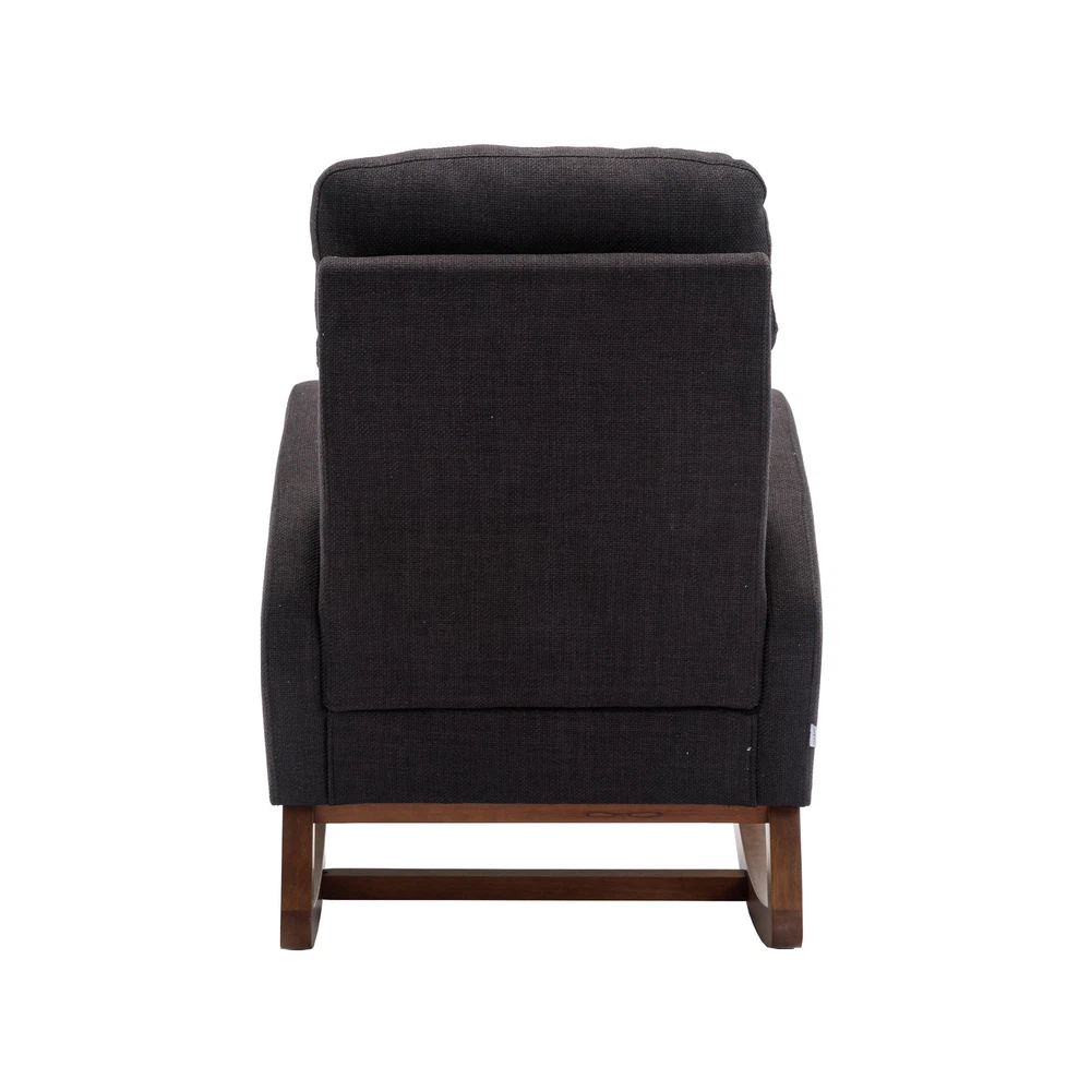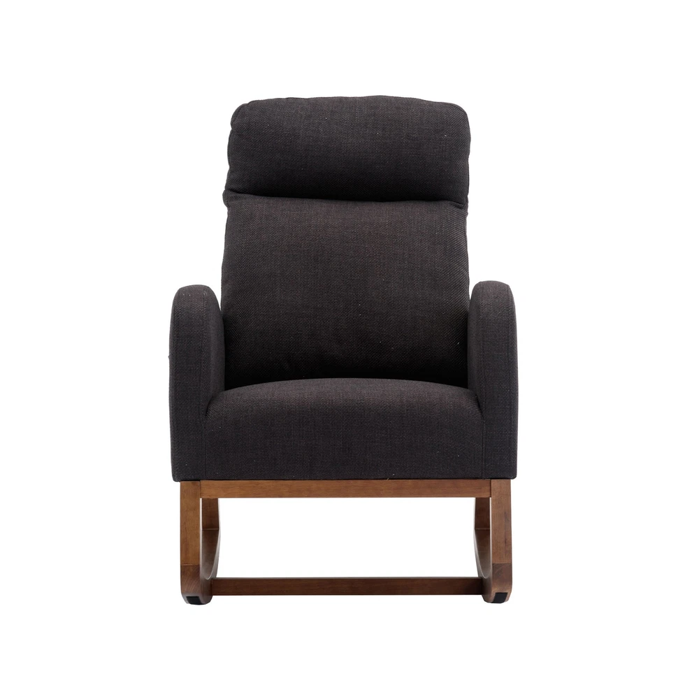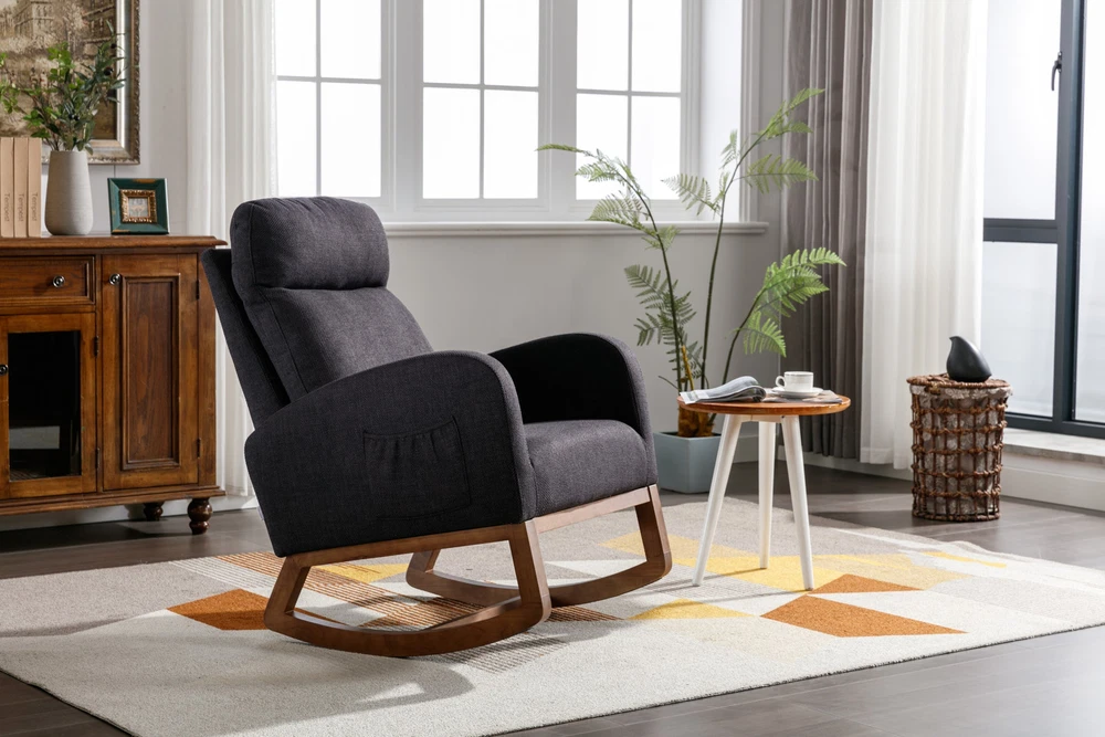 Specifications Place of Origin China Main Color Black Main Material Linen Filler Foam Dangerous Goods #dangerFlag# Dimensions & Weights Assembled Length (in.) 37.01 Assembled Width (in.) 27.17 Assembled Height (in.) 39.76 Weight (lbs) 45.29 Product Features Our modern rocking chair is designed for relaxation and comfort. giving you a larger sitting area and a comfortable sitting experience while reading, crocheting or taking a short nap. You can put a read book or magazine in a indoor rocking chair with side pockets. This glider rocking chair is ideal for living rooms, nurseries, bedrooms, study rooms and any other room in the home. The wide and long armrests also provide ample space for your arms to rest and relax. With a combination of elegant appearance and rocking function, this fabric accent chair is ideal for living rooms, nurseries, bedrooms, study rooms and any other room in your house. We offer the required hardware, tool, and an illustrated manual to help you in assembling the chair within 20 minutes. Description Mid-Century Modern Nursery Rocking Armchair Upholstered Tall Back Accent Glider Rocker The rocking chair provides a unique place to drink a cup of coffee, read a wonderful book, or comfortably pass the time. Durable and sturdy structure: The entire frame is made of solid wood, sturdy enough to support 300 pounds. Covered with high-quality fabric and filled with high-density soft sponge. High backrest and comfortable armrests: This ergonomic modern rocking chair provides strong support for your entire body. The high backrest provides you with great comfort and safety. More importantly, placing your hands or arms on comfortable armrests will reduce fatigue. Modern design: This rocking chair feels at home in the nursery, living room or any Shared space. The high back contour design and ergonomic arm height add more charm to this piece. Easy installation: Our rocking chair is easy to assemble. It can be assembled within 10 minutes. Including all hardware and components. Back and sides Made of high-quality rattan fabric, the rocking chair is not only durable but also comfortable. The pocket design allows you to conveniently store small items like your phone or remote control while relaxing. The soft cushion provides excellent support and comfort, making it perfect for long periods of sitting. The ergonomic design of the backrest and the integrated pillow ensure that you can lean back and relax with ease. Versatile and adaptable, this rocking chair is suitable for various scene