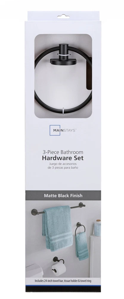 Modern Round 3-Piece Bath Accessory Kit in Matte Black features clean designs with concealed screws for a timeless look. This kit includes a matching 24" towel bar, round towel ring, and a single post, euro-style toiler paper holder. Crafted from metal, each piece is durable and built to last, helping your bathroom remain effortlessly stylish. Mounting hardware and instruction manuals included. Includes matching 24" towel bar, towel ring, and toiler paper holder Contemporary, sleek design with concealed screws Made of zinc & aluminum alloy Mounting hardware included Easy DIY installation Coordinates with Modern Round Bath Accessories
