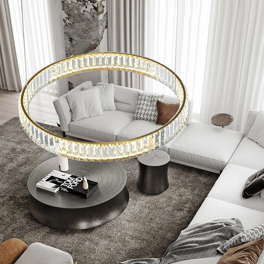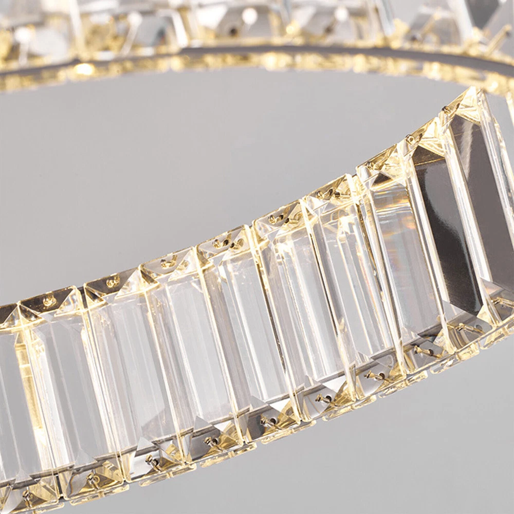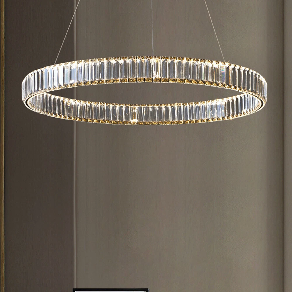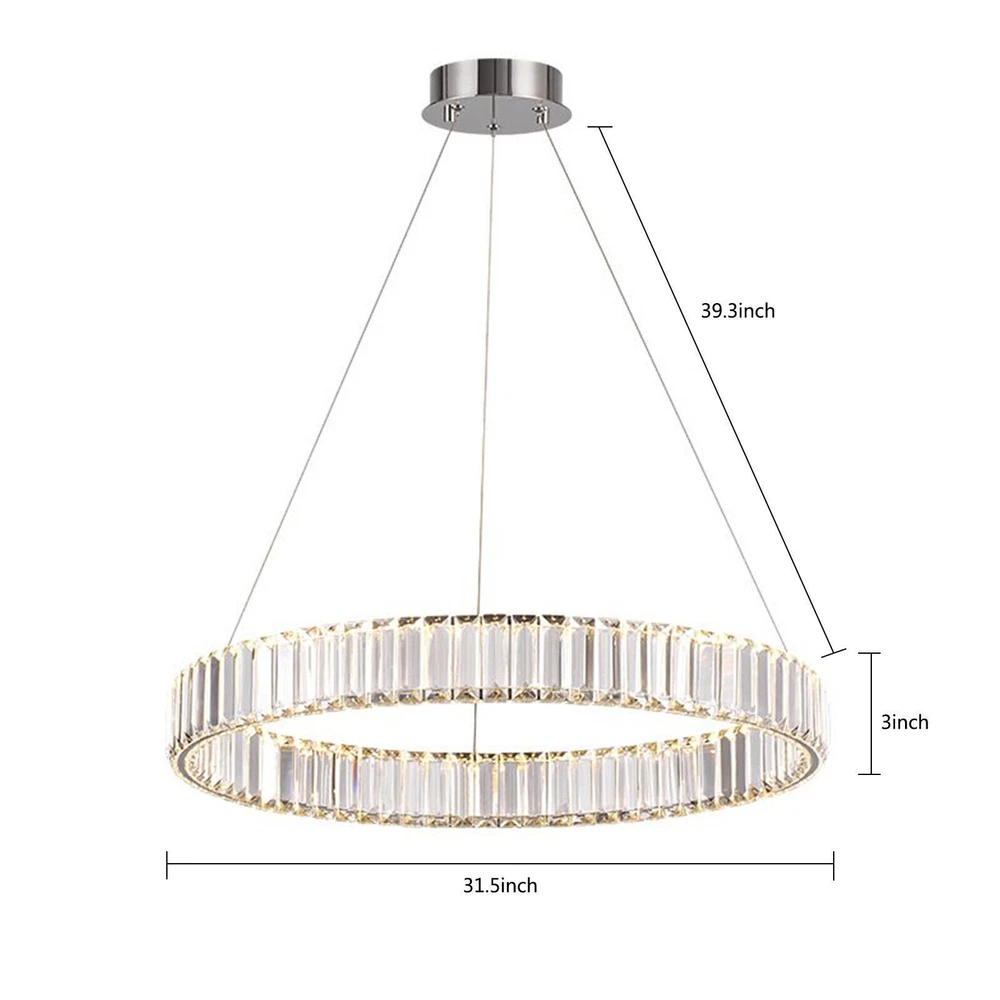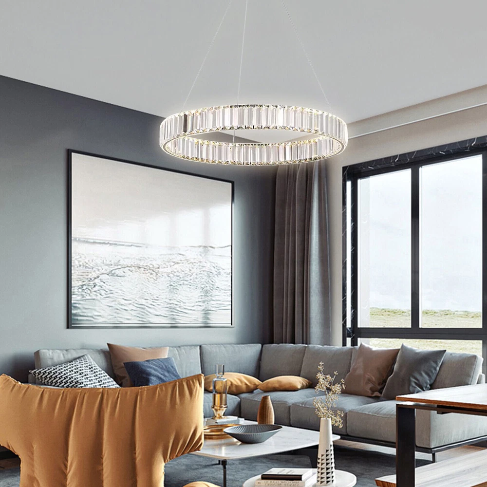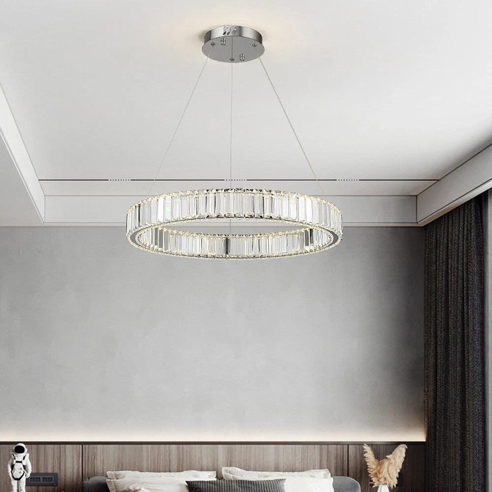 Modern Round Crystal Chandelier Pendant LED Lamp Ceiling Lighting Light Fixture About this item * HIGH QUALITY MATERIAL: LED pendant lights with the polish stainless steel and glass crystals, the sparking crystal glass prisms will create a glamour and brilliant room for you. * SPECIFICATION: Ring size: diameter31.5 inches, The strings are 39.3" Long adjustable, you can adjust the height of the ring easily by using the cable locking pins; Perfectly fit the height of your ceiling * DIMMABLE : Dimmable with traditional dimmer switches, 5%-100% dimming range. Dimmer switch is excluded. * ENERGY SAVING: 25W modern chandeliers, Voltage=85-265V, Light Source: LED chips, Light Color: 3000K-4500K-6000K(Warm light-Warm White- White), perfect for living room ,bedroom,dining room ,restaurant,porch etc. Please check the farmhouse chandelier lighting fixtures ceiling size before buying. The luminaire does not include a dimmer. Specifications: LED pendant light size: Diameter 31.5 inches × Height39.3 inches Power: 25Watt Working voltage: 110-120V 50/60Hz Lumens:1500 lumens Light color:3000K-4500K-6000K(Warm light-Warm White- White), Material: Stainless steel + Crystal Glass Light Body Color: Chrome finish Light Source: SMD2835 led chip, above CRI 80 index Feature of modern chandelier : 1. Energy saving: SMD2835 LED light source, which is 90% high-effective than traditional incandescent bulbs, will save a lot on your power bill. 2. Long lifespan: Better heat dissipation, can be used over 30000 hours. 3. Adjustable height: The lighting fixtures hanging string wires are adjustable, you can adjust the height of the wire easily by using the cable locking pins. 4. Wide applications: Modern and elegant design rustic chandelier, ideal for pendant lights in living room, kitchen island lighting, bedroom mini chandelier, study room hanging light fixtures, foyer small chandelier, etc. 5.You can dim the brightness of the chandelier light fixture according to your needs. Tips: · We recommend installing by professionals · -When installing and cleaning light, youmust cut off the power supply. Payment Delivery details Terms of sales About us Contact us Payment We accept ebay payment 。 Fees such as import duties, taxes are not included in the item price or shipping costs. These charges are the buyer's responsibility. Delivery details Shipping: 2-9 working days to: USA Terms of sales We maintain high standards of excellence and strive for hundred percent customer satisfaction. Feedback is very important to us. We hope that you contact us immediately before you give neutral or negative feedback, so that we can address your concerns. It is impossible to address issues if we do not know about them! About us Your satis faction is our ultimate goal. We work hard to earn your trust and future business. Our certified technicians have tested each item before shipping. The unit comes with 1 year limited warranty on all manufacturing defects. a) If you receive a defective item, you may return it or ask for a discount. Please contact us within 14 days after you receive the package. b) What you returned must be intact and in its original packaging as re? u. Customer is responsible for shipping costs of the returned item. c) We will cover the cost of shipping back t with the shipping rate indicated in the registration page. We will send you a new unit or refund the full payment you paid. Thank you. Contact us Business Hour Business Hour: Monday To Friday: 8:30 AM to 5:00 PM (Beijing China time) Due to time zones, our reply to your questions may not be immediately. But within above working time, we will reply your email within 24 hours. If it's non-workdays, please kindly be patient and wait till Monday. Please contact us with ebay message. Please feel free to contact us if you have any questions. Monday To Friday: 8:30 AM to 5:00 PM (Beijing China time) Due to time zones, our reply to your questions may not be immediately. But within above working time, we will reply your email within 24 hours. If it's non-workdays, please kindly be patient and wait till Monday. Please contact us with ebay message. Please feel free to contact us if you have any questions.