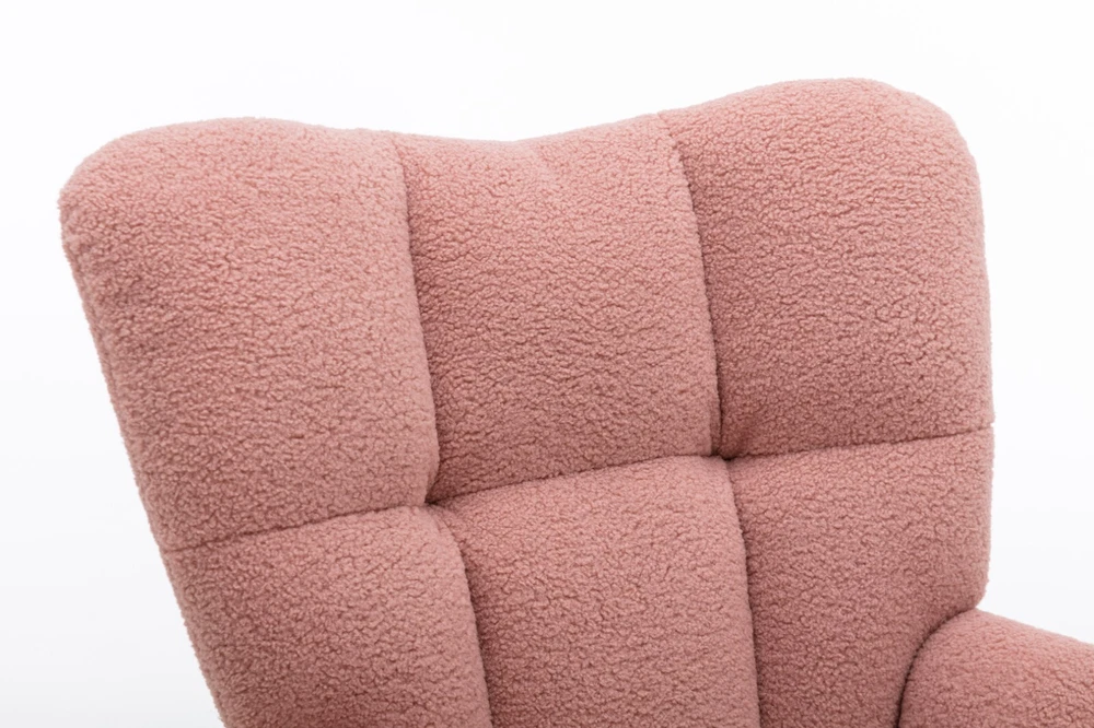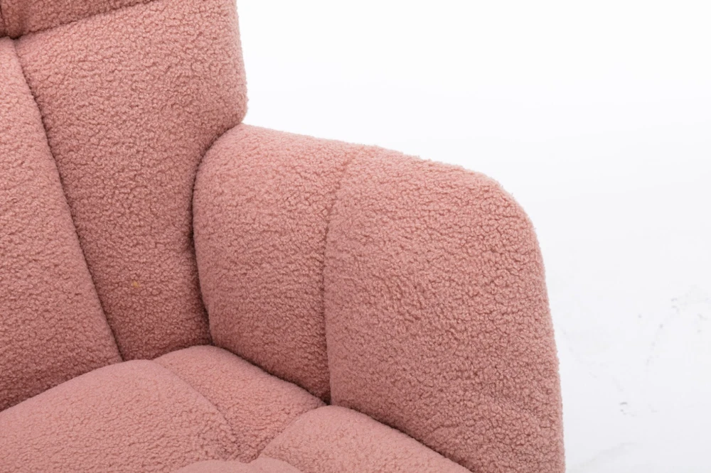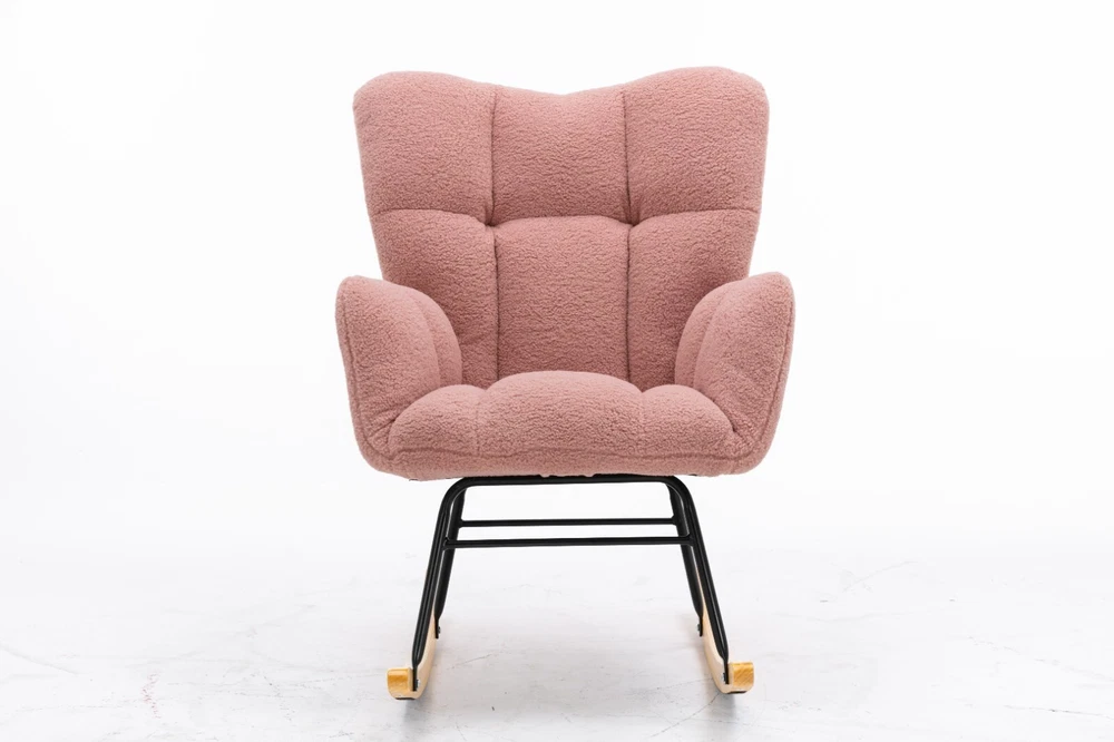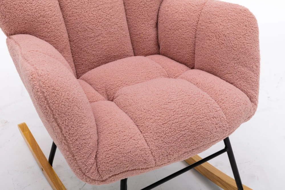 About This Item: Product BOM: Soft Teddy Material+Foam Filling+Wooden Frame+Black Paint Metal Base+Wooden Rocking Legs+Upholstered+Floor Protection And Isolation Layer; Product Feature:Rocking; Use Case:Indoor,Accent Chair,Nursery Chair,Rocking Chair,Glider Chair,For Living Room,Bedroom and Other indoor space; Product Capacity: 250 LBS Product Assembly: The assembly is so simple that two person can assemble it in 25 minutes; Specification: Color: Pink Material: Teddy Filler: Foam Product Dimensions: 31.5"D×27.6"W×37.4"H Weight:26.46 LBS