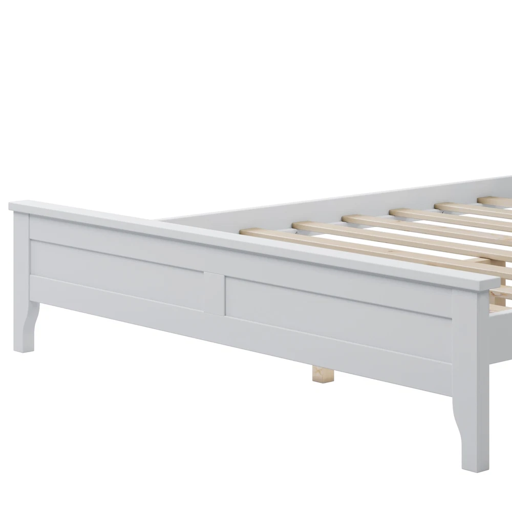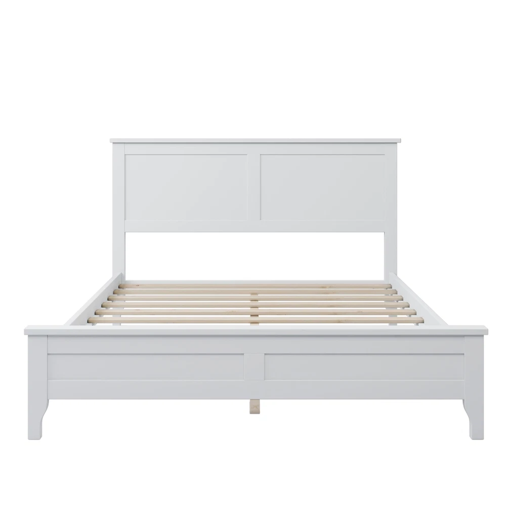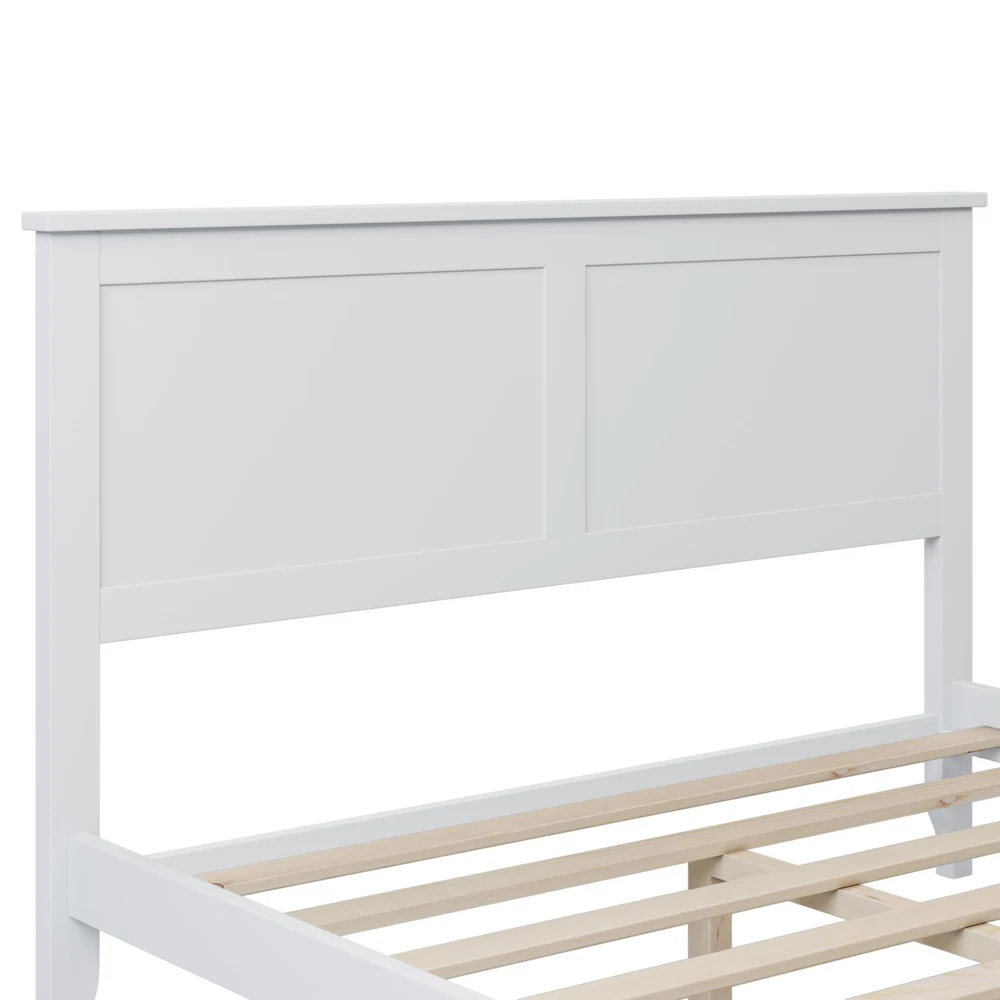 The white full bed is crafted with pine wood and.The elegant simple slat design headboard of this wood full size white bed adopts an exquisite flat design to complete the bedroom style. A standard full-size mattress is recommended.If ''simplicity'' and ''elegance''are the words you live by,then look no further: you've found the right dresser for your treasure's room! We like its versatile look,which blends easily with whatever might you...and we guarantee you'll like it as much as we do! Specifications Weight Capacity 600LBS Frame Material Pine Wood + Box Spring Required No Is it compatible with adjustable beds compatible, as as the buyer does not install bed slats Recommended mattress thickness 5~8" Clearance from Floor to Underside of Bed 7.8" Numbers of Slats Included 10 Center Support Legs Yes Mattress Included No Assembly Required Yes Package Number 1 1.Stylish and simple platform white full bed for your choice; bed frame is made of pine wood, extra small legs in the middle for strong construction and high load capacity. 2.Solid, tapered wood legs provide a of Sophistication. 3.Coated with a natural and exquisite wear-resistant finish, the bed frame is easy to clean, and brings a comfortable and feeling to your sleeping space. 4.All the instructions and hardware required for the assembly of this white wooden platform bed with headboard are included. 5.Its classic color is easy to integrate with your furniture and bring comfortable visual experience for your home.