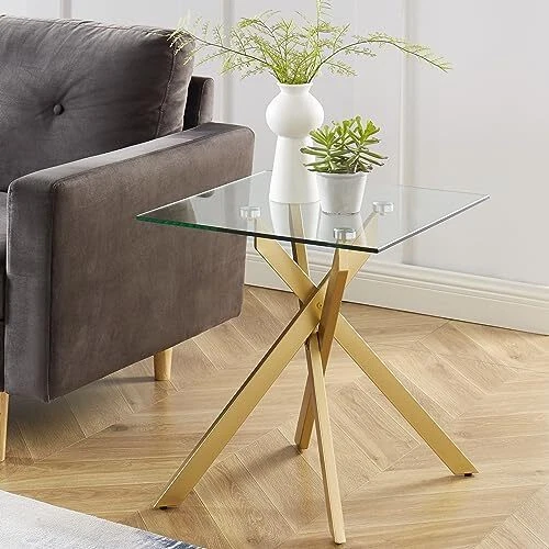Return Policy Fast Delivery Trusted seller Modern Style Square Side Table with Tempered Glass Top and Metal Tubular Legs, Gold 20”Dx20”Wx22”H Product Description Unique Geometric Design: This square side table brings modern theme to your living room with its clean glass top and metal tubular legs design Quality Material: With a hard wearing tempered glass top and sturdy metal legs, this rectangular modern end table is built to last and withstand daily use Sturdy Metal Tubular Legs: The table legs is supported by solid metal tubular, which ensures a excellent sturdiness and long lasting durability Multiple Places: Suitable to used in office, store, living room, guest room or bedroom as a sofa table, end table or coffee table Easy Assembly: Each glass top side table comes safely flat packed. Installation is simple and fast, which can be finish in just 15-25 minutes. To ensure safety, please keep children away from glass furniture. Shipping Returns Payment Shipping Shipping is FREE to all addresses other than APO/PO boxes in the lower 48 states. All our stock ships from US-based warehouses. Shipped via USPS or UPS (depending on location and package weight) Unless stated otherwise, all orders will ship within 24-72 hours of your payment being processed. Check our feedback to see the great reviews of FAST shipping we offer. Returns Seller does not accept returns Payment We currently accept payment via eBay managed payments only. Once payment is cleared, we will dispatch your shipment within 1-3 business days. Please refer to the "Shipping" tab for more information regarding shipping speed to your destination.