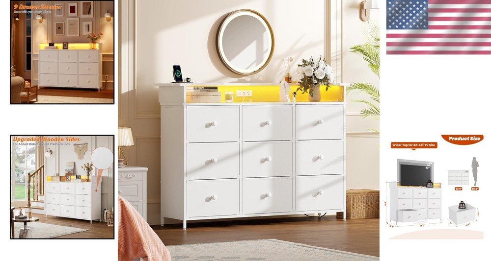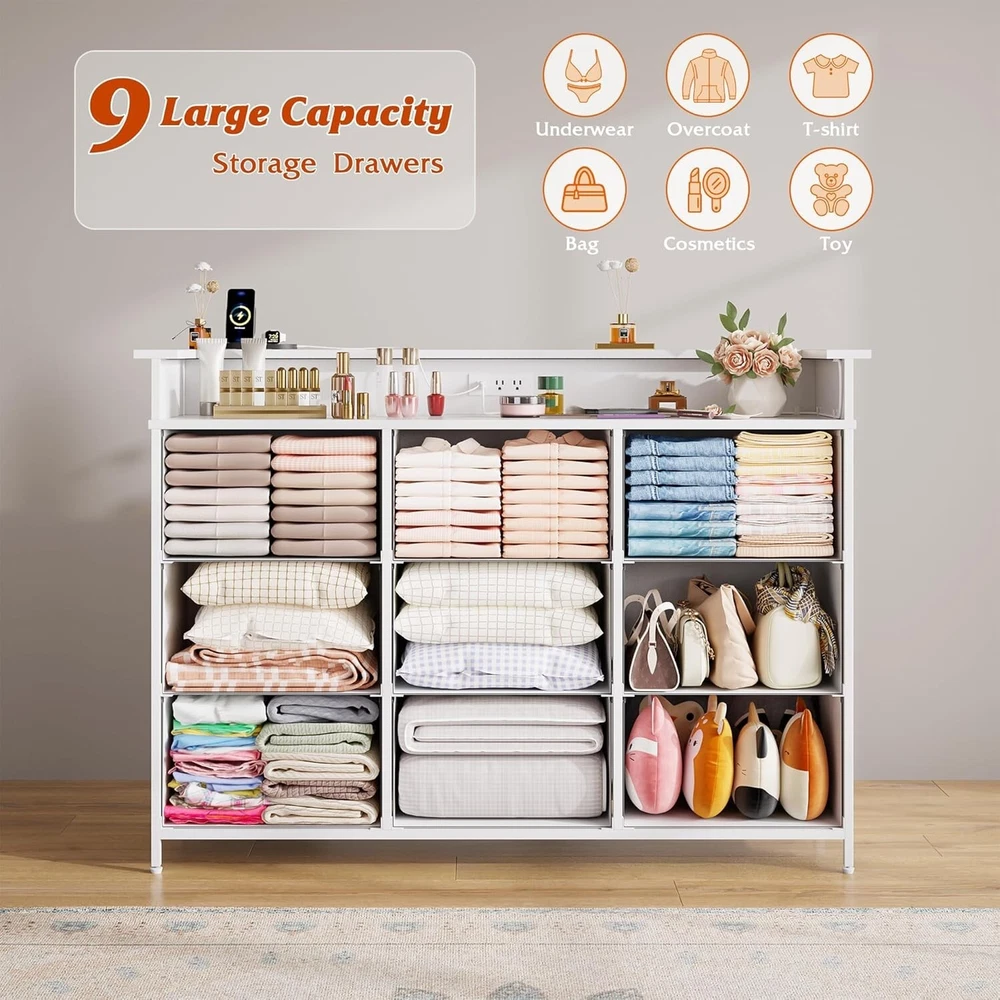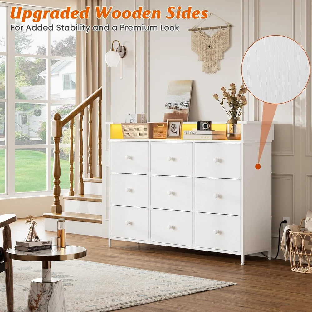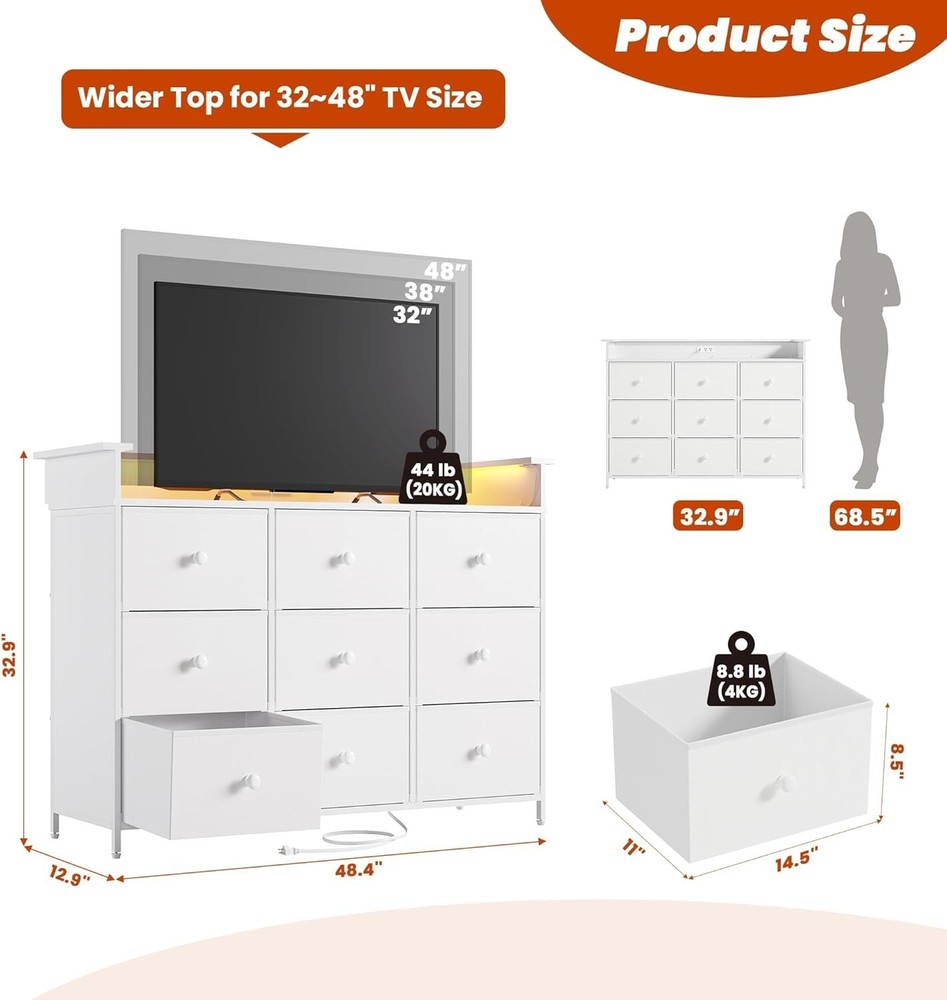 Finish: Painted Care Instructions: Easy Care Era: 21st Century (2000-now) Required Tools: Yes Color: White Item Length: Dresser with Drawers Handle Type: Cup Handle Door Mechanism: Sliding Type: Dresser Mounting Type: Standing Maximum Weight Capacity: 100 lb Handle Finish: Metal Room Type: Dressing Room, Bedroom, Living Room Room: Bedroom, Dressing Room, Living Room Personalized: No Number of Drawers: 9 Additional Parts Required: No gtin13: Does not apply Item Depth: 12.9 in Item Height: Dresser with Drawers Style: Modern Item Weight: 45.8 lb Features: LED Strip, Wooden Top & Sides, Charging Station Shape: Rectangular Material: Wood, Fabric, Steel Distance from Floor to Bottom: More Than 14 in Number Of Pieces: 1 Mounting: Free Standing Item Width: Dresser with Drawers Product Dimensions: 12.9"d X 48.5"w X 32.6"h Wood Tone: Light Wood Handle Material: Plastic UPC: Does not apply Size: Large Department: Adults Brand: Unbranded