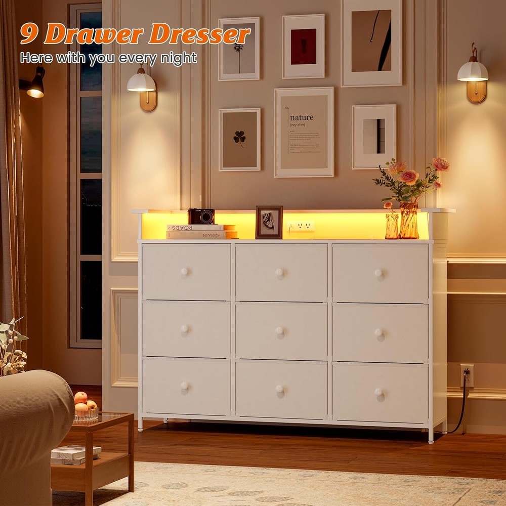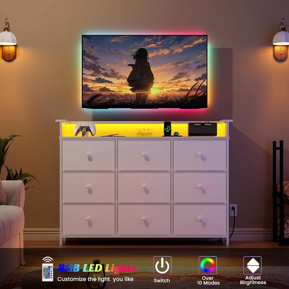 Modern White 9-Drawer Dresser with LED Lights & USB Charging Ports