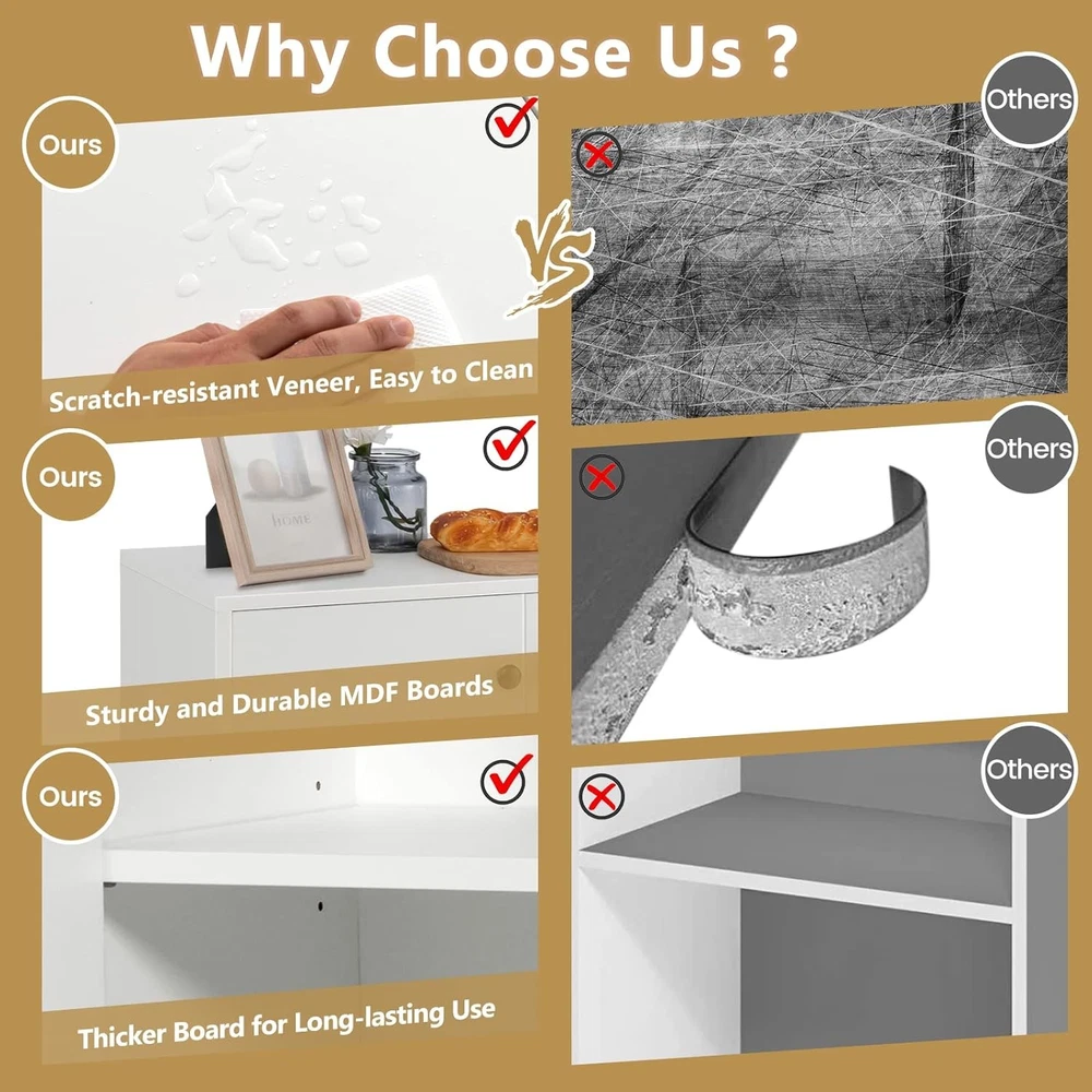 Product Description About this item [Ample & Classified Space]: The open spacious tabletop of this modern buffet cabinet allows you to place daily necessities and display your ornaments. In addition, the 2 storage drawers and 2 cabinets of different sizes can store the tableware, glass, cooking utensils, etc., hiding them to avoid dust. [3-Level Adjustable Right Shelf]: The shelf in the small cabinet features 3 adjustable heights. According to the height of the stored item, it can be easily adjusted up or down. Or, you can just remove the shelf to get more storage space for bigger and taller items. [Sturdy & Durable Materials]: Made of thick MDF boards and engineered wood boards, this buffet sideboard is not easy to bend. The surface is covered with scratch-resistant veneers that are also smooth and easy to clean. Besides, the drawers are equipped with premium metal rails, allowing you to slide them smoothly. [Safe Anti-Tipping Design]: This white sideboard features a large and stable base, which makes the cabinet not easy to wobble. Moreover, the included anti-tipping accessories enable you to fix the kitchen sideboard to the wall, which ensures maximum security and additional stability. [Easy Assembly & Wide Applications]: Coming with detailed instructions and necessary hardware, this buffet cabinet is easy to assemble. It is a practical cabinet to add extra storage space to the dining room, living room, etc. Overall dimension: 42” x 13.5” x 33.5” (L x W x H). Description: Featuring a large tabletop, 2 drawers and 2 cabinets, this storage cabinet with ample space would be a good solution to say goodbye to your messy room. The shelf in the small cabinet can be adjusted to fit items of different heights. And the functional magnetic catch keeps the doors closed tightly, preventing dust from getting in. With the smooth drawer rails and rounded handles, you can easily slide the drawers. Constructed from premium thick boards, this buffet cabinet with storage is quite sturdy and durable. The surface is smooth and scratch-resistant. Thanks to the anti-tipping devices, this sideboard cabinet can ensure additional stability and safe use. When you need to move it, the considerate anti-slip foot pads will protect the floor from scratches. This simple and stylish console cabinet is suitable for the dining room, living room, etc. Features: Large tabletop, 2 drawers and 2 cabinets meet daily storage needs Shelf in the small cabinet is adjustable to store items of different sizes Boards of quality ensure sturdy structure and long-lasting use Scratch-resistant and smooth surface for easy cleaning Stable and safe enough with the anti-tipping device Premium metal drawer slides for smooth opening and closing Doors with magnetic catches keep items away from dust Anti-slip foot pads prevent the floor from getting scratches Versatile to be used in the kitchen, dining room, living room, etc. Clear instructions and included hardware make the assembly easier Specifications: Color: White Material: Engineered Wood, MDF Overall Dimension: 42” x 13.5” x 33.5” (L x W x H) Inner Dimension of Each Drawer: 11” x 11” x 4” (L x W x H) Net Weight: 83 lbs Total Weight Capacity: 286 lbs Package Includes: 1 x Kitchen Sideboard 1 x Instruction