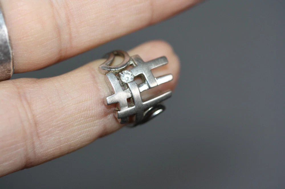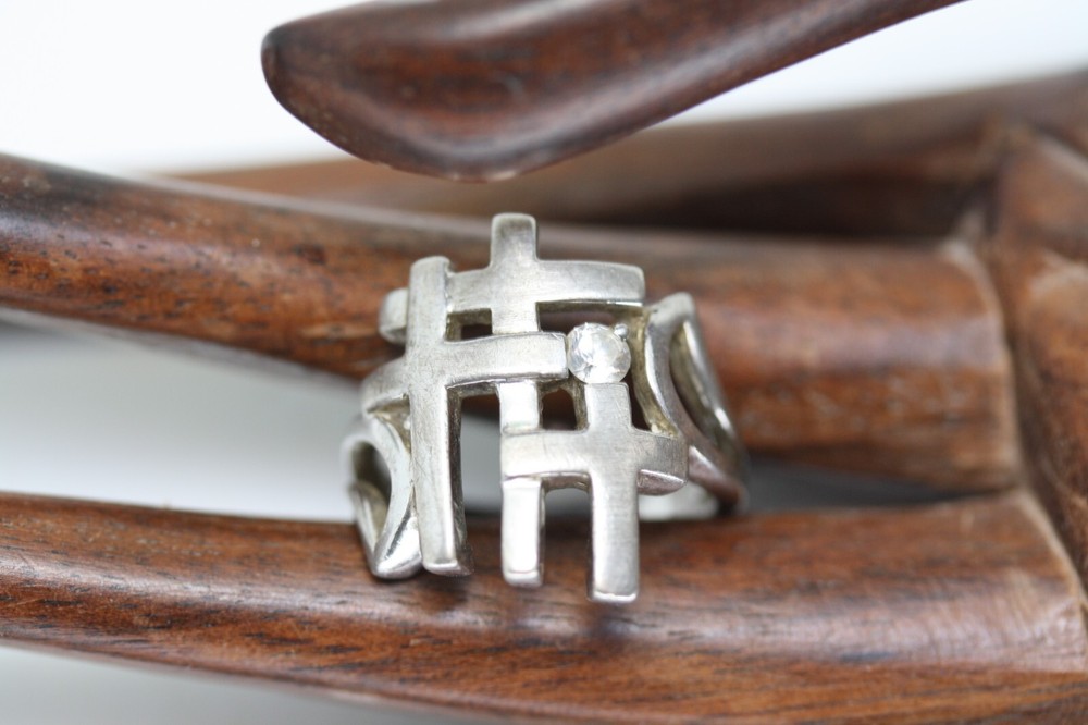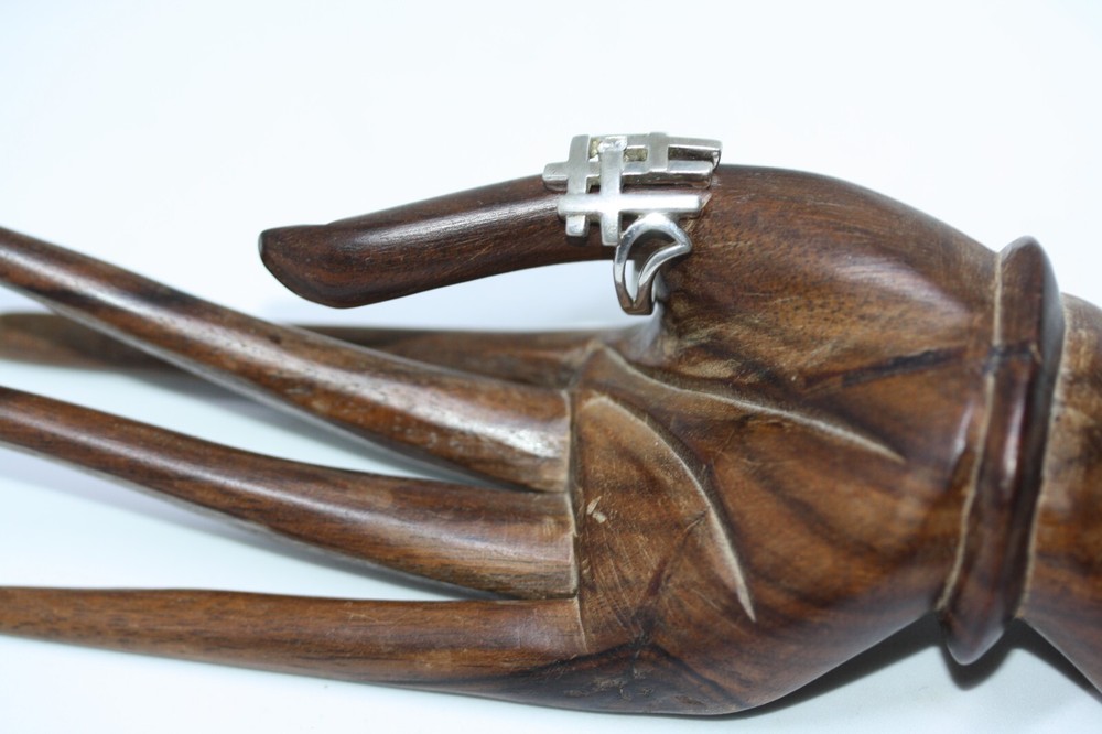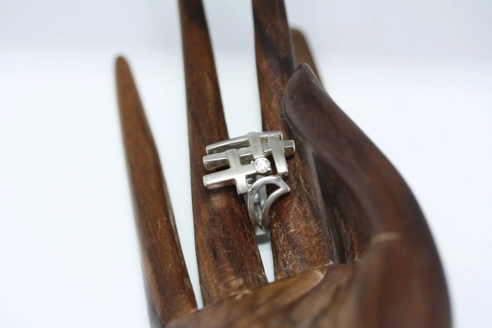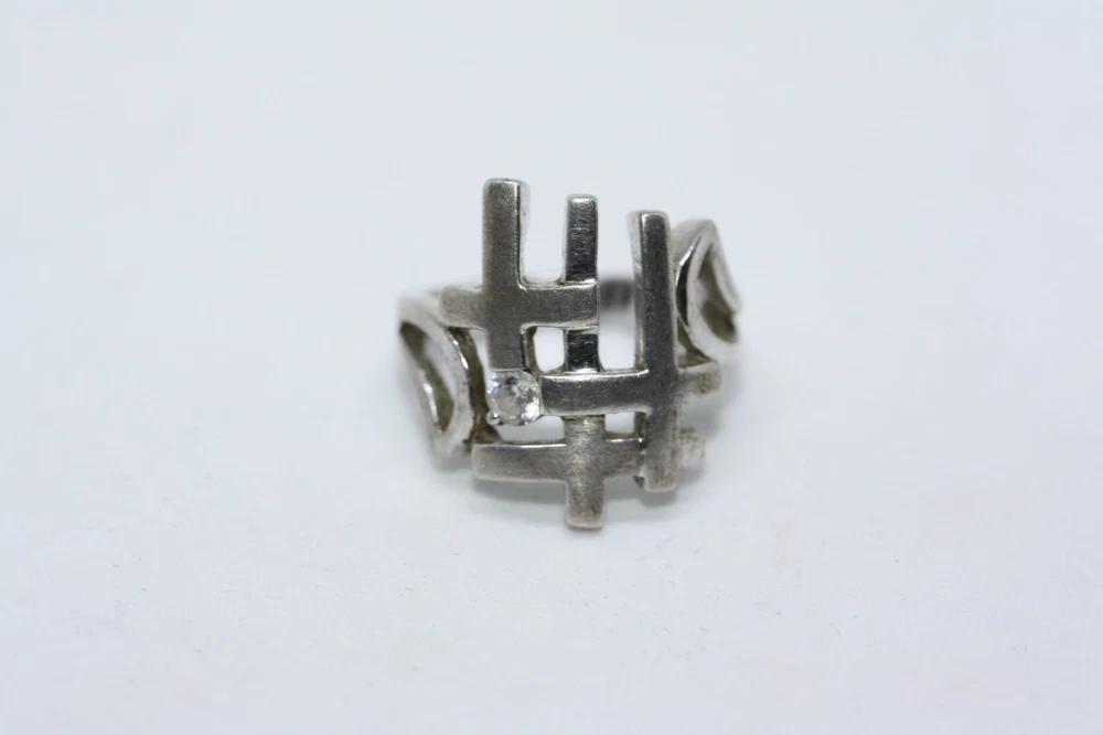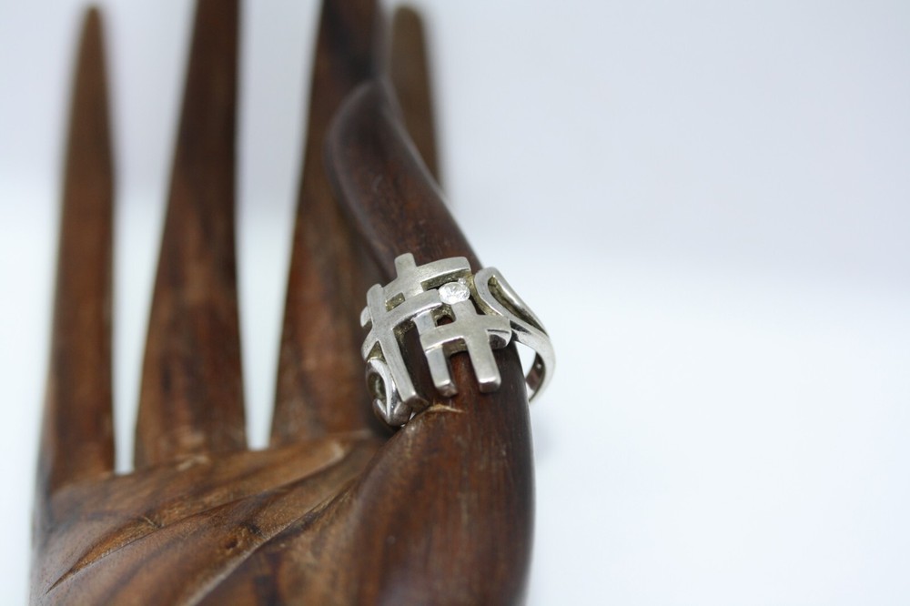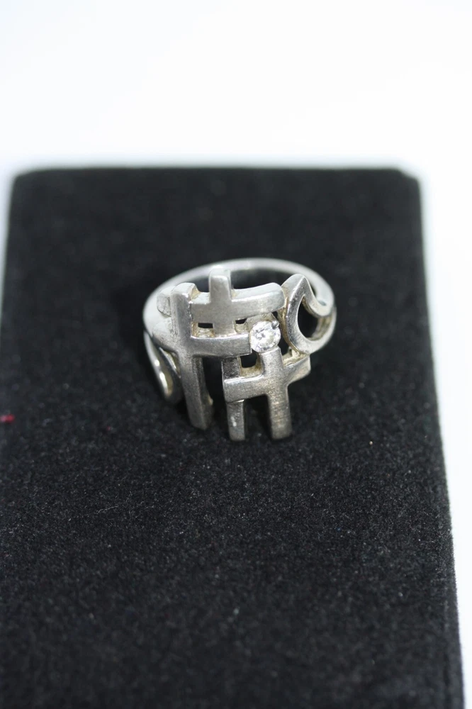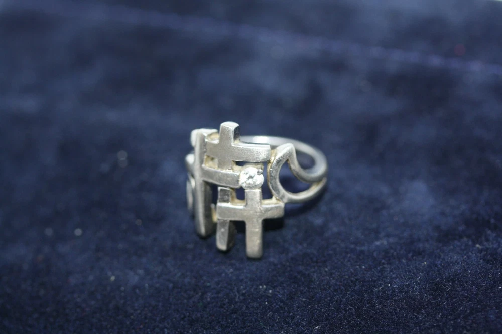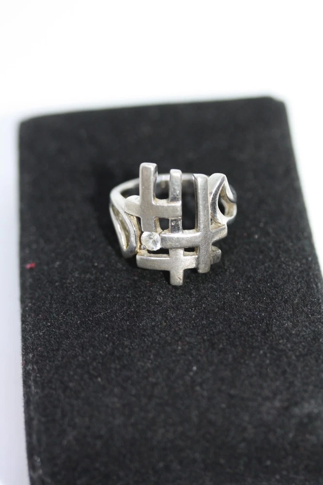 Modernist Jerusalem Crusader CZ Women's 925 Sterling Silver Lattice Ring Sz 4.75 18 MM Width Overview: This Stylish Ring with a Modern Design in 925 Sterling Silver features a beautiful Jerusalem Crusader Lattice Cross Design. Condition / Particulars: The Ring has a Very Nice Polished Finish, and is in vintage condition. Weight: The Ring is 4.6 Grams or 0.15 of an oz. Size & Measurements: The ring is size 4.75. Ornate with a 0.25 ctw CZ. Ring width is 18 MM. Metal & Hallmark: The Ring is Stamped 925 Silver. Additional Information: Each Ring is shipped in a secure manner and in a beautiful Blue or Black Velvet pouch.