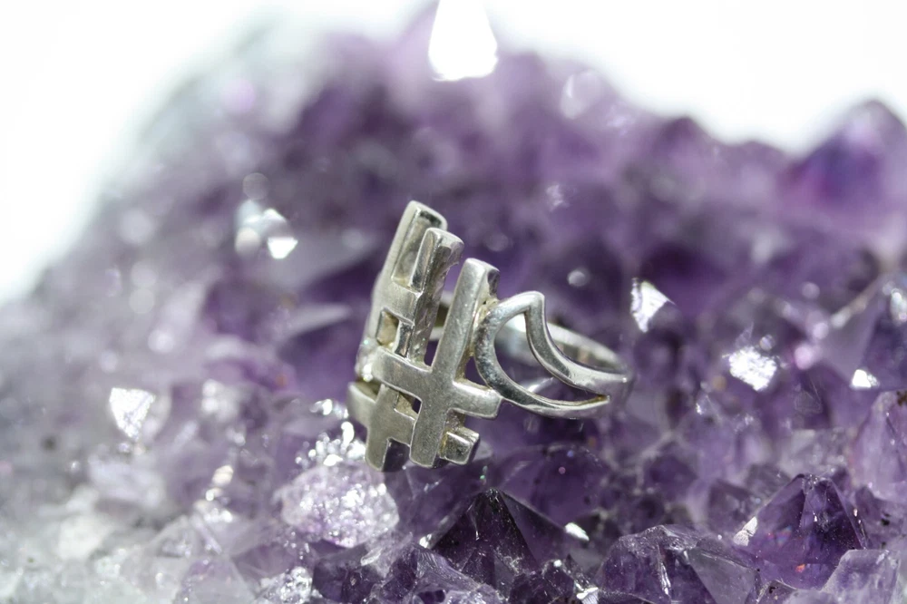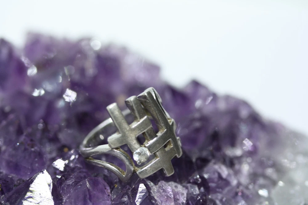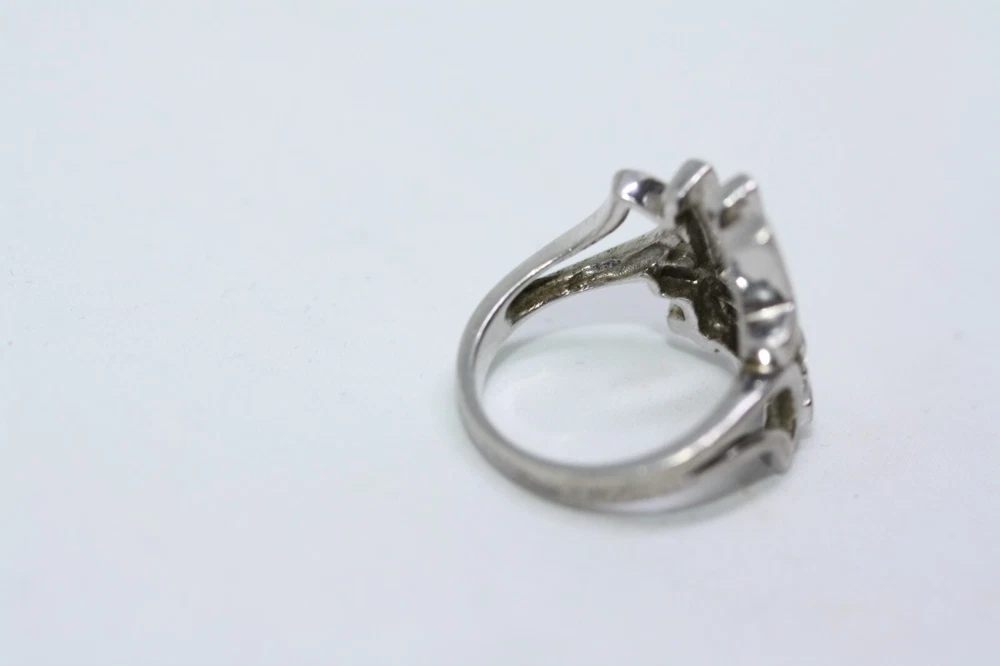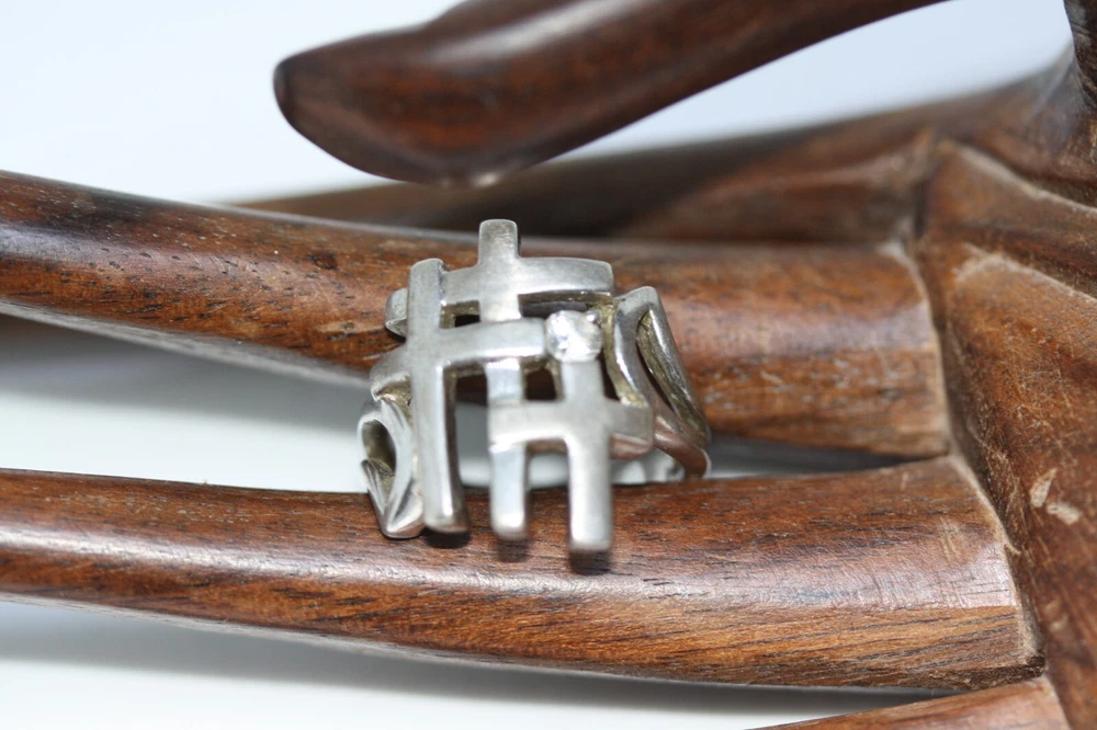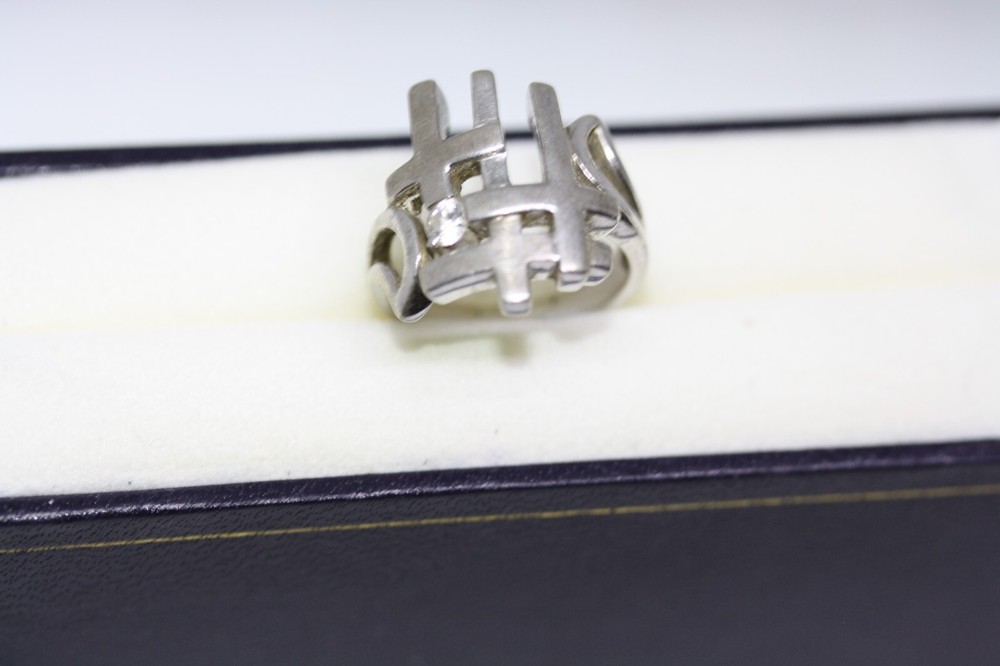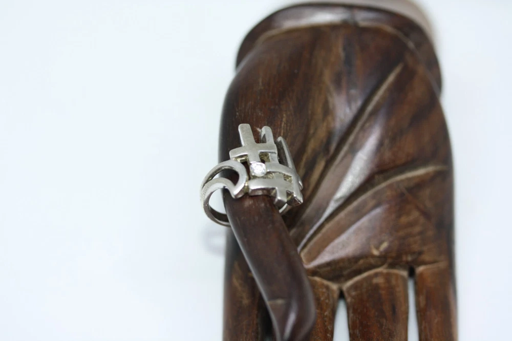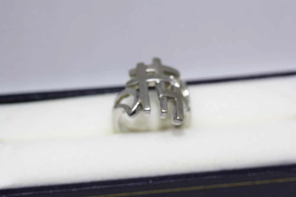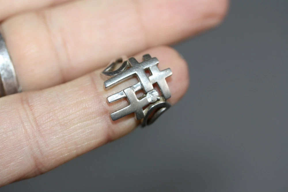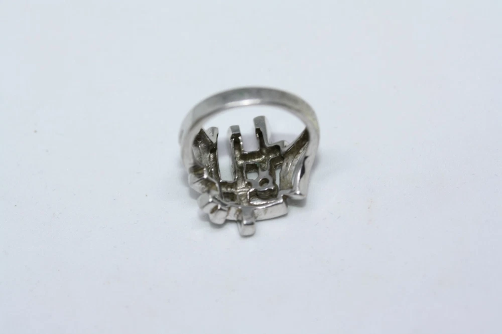 Modernist Jerusalem Crusader CZ Women's 925 Sterling Silver Lattice Ring Sz 4.75 18 MM Width Overview: This Stylish Ring with a Modern Design in 925 Sterling Silver features a beautiful Jerusalem Crusader Lattice Cross Design. Condition / Particulars: The Ring has a Very Nice Polished Finish, and is in vintage condition. Weight: The Ring is 4.6 Grams or 0.15 of an oz. Size & Measurements: The ring is size 4.75. Ornate with a 0.25 ctw CZ. Ring width is 18 MM. Metal & Hallmark: The Ring is Stamped 925 Silver. Additional Information: Each Ring is shipped in a secure manner and in a beautiful Blue or Black Velvet pouch.
