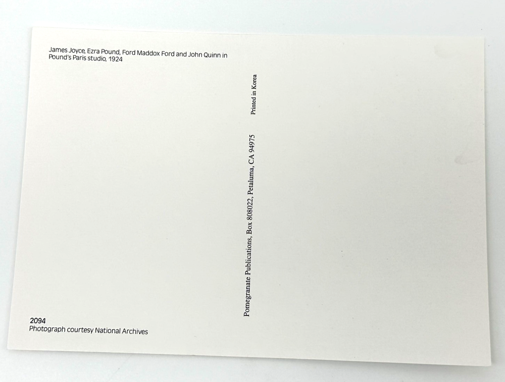 Literary history captured in one frame—this rare postcard features a 1922 photograph of James Joyce, Ezra Pound, Ford Madox Ford, and John Quinn. Printed by Pomegranate Publications, it’s a must-have for any scholar or collector of early 20th-century literature.