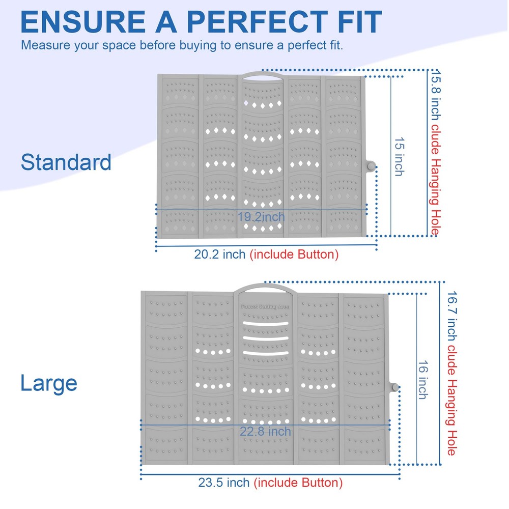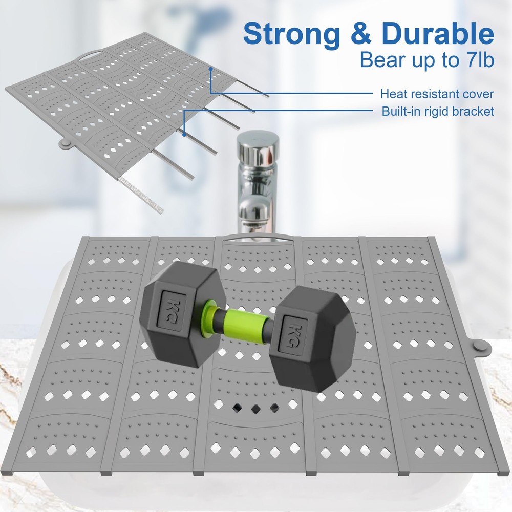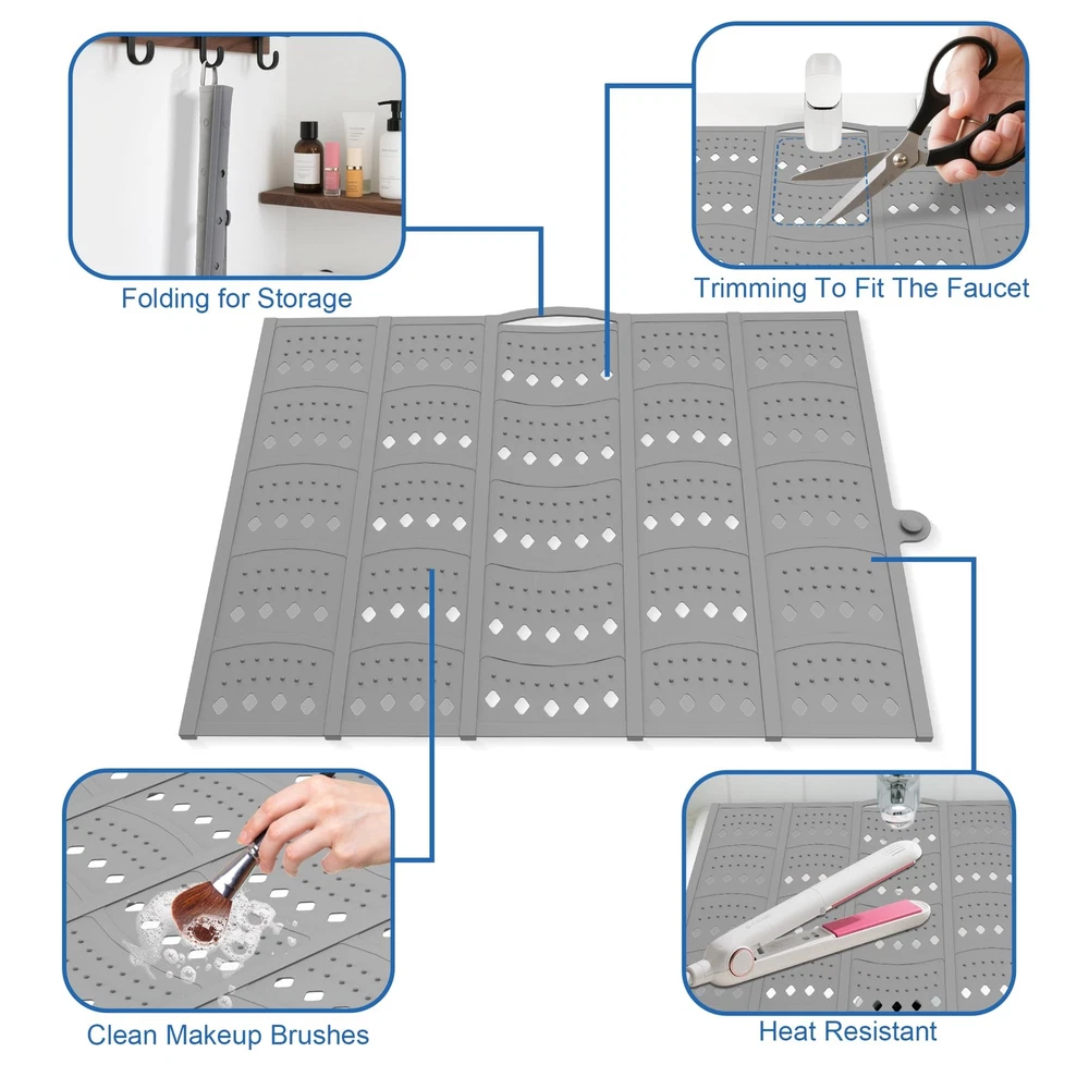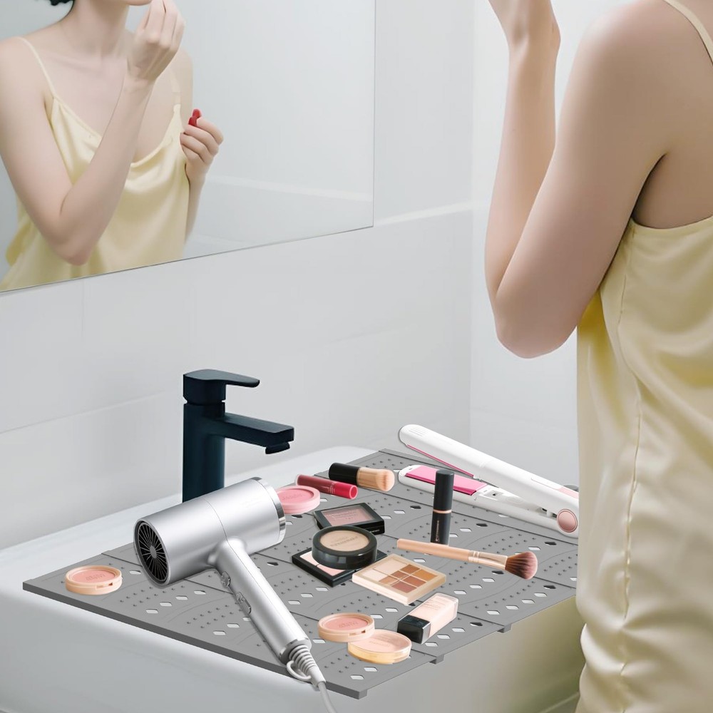 π Product Description --- Please Measure your sink for the best fit and enjoy a flawless experience! --- Do not place heavy or sharp objectson the soft silicone areas, Heavy or sharp objects must beplaced gently on 2-6 steel frames.,Durable and Sturdy: The bathroom sink cover features robust load-bearing capacity and precise structural design. The central steel frame can withstand significant weight (The load capacity of two steel frames is 7 pounds). The silicone foldable sink cover is designed for portability, ideal for small bathrooms, RVs, campers, and travel use.,Space-Saving: A must-have accessory for small bathrooms, this makeup sink cover mat expands countertop space and organizes all makeup tools and beauty products, such as eyebrow pencils and makeup brushes, keeping the sink countertop tidy. The sink cover measures 20.2inches Γ 15.8 inches (measurements include side buttons and top edge hanging holes).,Easy DIY: Foldable sink cover faucet area can be cut to allow water to flow freely from the faucet. Heat-resistant up to 450Β°F, protecting curling irons, hair dryers, straighteners, styling brushes, and more from heat damage.,Easy to Store and Clean: Sink cover for counter space can be easily rolled up and stored conveniently. You can choose to hang it for storage or carry it with you when traveling. π Specifications size 20.2 x15.8 inch color Gray model Sink Makeup Mat-1 style Classic material Silicone itemWeight 1.21 pounds partNumber Sink Makeup Mat-1 manufacturer Mofason productDimensions 2.5 x 1.9 x 15.8 inches β Fast Shipping | β Quality Guaranteed | β Customer Support 30-Day Returns β’ 100% Satisfaction