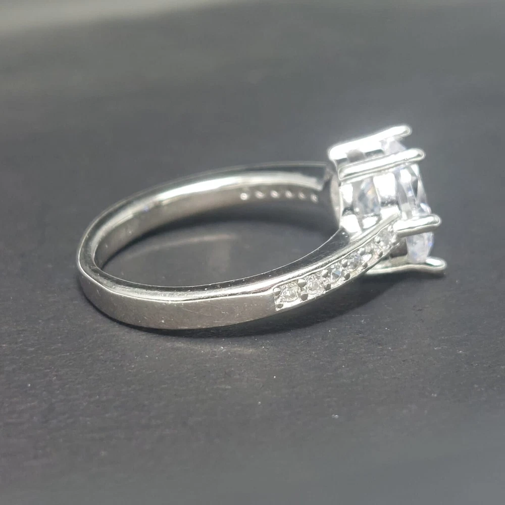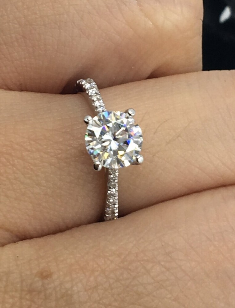 This beautiful ring is the perfect choice for anyone looking for a statement piece of jewelry. Crafted from high-quality materials, it features a stunning round moissanite stone with excellent cut grade and eye-clean clarity grade. The prong setting style ensures that the stone is securely held in place, while the nickel-free feature makes it comfortable to wear. The ring is made of 925 silver plated sterling silver and is completely handmade. It is perfect for any occasion, whether it's for an engagement, wedding, anniversary, or Valentine's Day. The band width is 2 mm, and the ring is available in size 6. This ring is customizable, and the seller offers a wide range of options to choose from.
