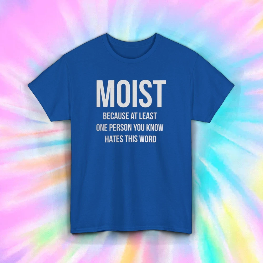 Moist T-Shirt Get a laugh with our "Moist" T-Shirt. Featuring the playful text "Because at Least One Person You Know Hates This Word," this tee is perfect for those who enjoy lighthearted humor. Features: Material: Made from 100% premium cotton for a soft and breathable feel. Fit: Unisex classic fit, true to size for comfortable wear. Design: Fun and humorous text graphic. Label: Tear-away label for easy customization and added comfort. Ideal For: Humorous occasions Casual wear Gag gifts Experience everyday comfort and style with our premium unisex tees, crafted from 100% cotton for a soft and breathable feel. Each shirt features a classic fit, providing a perfect balance of comfort and style for all. The medium fabric weight ensures durability while maintaining a comfortable wear. Designed with convenience in mind, our tees include a tear-away label for easy customization. True to size, these shirts are ideal for both casual and formal occasions. Shipping Details: Items are dispatched within 1-3 business days. Please note that holidays may extend this processing time, so we recommend ordering early. Enjoy free economy shipping on all orders! Expedited shipping options are available starting at $1. Returns Policy: We accept returns for items due to buyer's change of mind or errors; however, the buyer is responsible for the cost of return shipping. For defective items or those with issues, please provide documentation (photos or descriptions of the problem), and we will gladly offer a refund or replacement. Order your "Moist" T-Shirt today and make a statement wherever you go!
