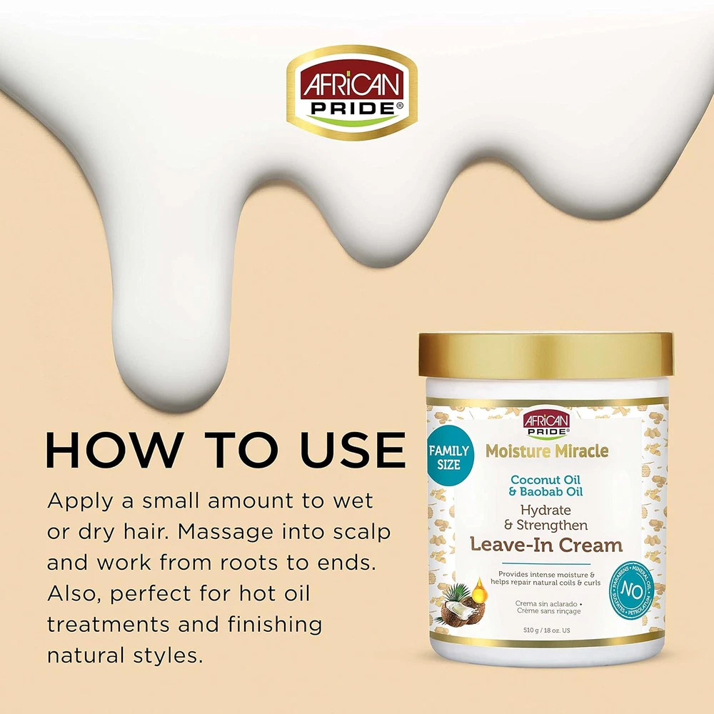 PROVEN HAIR CARE - African Pride Moisture Miracle Coconut Oil & Baobab Oil Leave-In Cream moisturizes hair using a nourishing blend of Baobab & Coconut Oil to add lasting hydration while protecting against breakage; leaving hair manageable & strong. FEATURED INGREDIENTS - Enriched with Coconut Oil: Deeply conditions, hydrates and helps repair; Baobab Oil: Restores and helps strengthen damaged hair, locks in moisture. NATURALLY FORMULATED - The ingredients within African Pride products are free of harmful components, including parabens, mineral oil, sulfates, & petrolatum. By utilizing natural ingredients, we are able to provide high quality, safe products. HOW TO USE - Apply a generous amount to hands, rub together, smooth product into dry or damp hair from roots to ends. Do not rinse. Style as desired. Use as a daily moisturizer or layering with styling products. ABOUT THE BRAND – The Moisture Miracle line of products is naturally created for the specific needs of coily & curly textures. Our ingredients are specially selected to deliver intense moisture and benefits you need in every step of your natural routine. Product Description Trusted for 30 years, African Pride products are specifically crafted with legendary natural ingredient blends, selected to help you nurture hair and create styles in the healthiest, most nourishing way possible. By offering a wide range of affordable products with a focus on ingredient integrity, African Pride gives you the versatility to flaunt your hair, your way, with pride. African Pride Moisture Miracle 5 Essential Oils As part of the Never Fail Twist Out Regimen, the restoring African Pride Moisture Miracle 5 Essential Oils treatment moisturizes your natural hair & scalp. Using a nourishing blend of five specifically chosen essential oils, including castor oil and grapeseed oil, as well as vitamin e, this oil replenishes natural nutrients, prevents breakage & promotes natural growth. Apply a small amount of 5 Essential Oils treatment to wet or dry hair. Massage oil treatment into scalp. Work from roots to ends coating hair evenly. Style natural hair as desired. Pro Tip: This oil is perfect for hot oil treatments and finishing natural styles. Never Fail Twist Out Regimen Leave-In Cream African Pride Moisture Miracle Coconut Oil & Baobab Oil Leave-In Cream moisturizes hair using a nourishing blend of Baobab & Coconut Oil to add lasting hydration while protecting against breakage; leaving hair strong. Conditioner The lightweight blend of African Pride Moisture Miracle Coconut Milk & Honey Leave-In Conditioner softens, hydrates and moisturizes your natural hair while adding shine; leaving your natural hair feeling soft, manageable and defined. Pre Shampoo African Pride Moisture Miracle Aloe & Coconut Water Pre-Shampoo moisturizes, cleanses & detangles hair. By using the natural benefits of Aloe Vera & Coconut Water this pre-shampoo deep conditions, protects & nourish natural coils and curls. 5 Essential Oils The restoring African Pride Moisture Miracle 5 Essential Oils treatment moisturizes the hair & scalp using a nourishing blend of essential oils & Vitamin E to replenish nutrients, prevent breakage & promote growth. The Key Ingredients Castor Oil Castor Oil assists in nourishing the scalp as well as hydrating and moisturizing your dry natural hair. It also plays an essential role in helping to promote nourished, soft hair growth. Grapeseed Oil Grapeseed Oil provides thermal protection to your natural hair. By protecting your hair against heat damage, you prevent breakage and foster healthy hair growth. Coconut & Olive Oil Both Coconut Oil and Olive Oil work to help deeply condition, hydrate and repair your natural hair. They also aid to nourish, moisturize, and restore overall natural hair to prevent breakage.