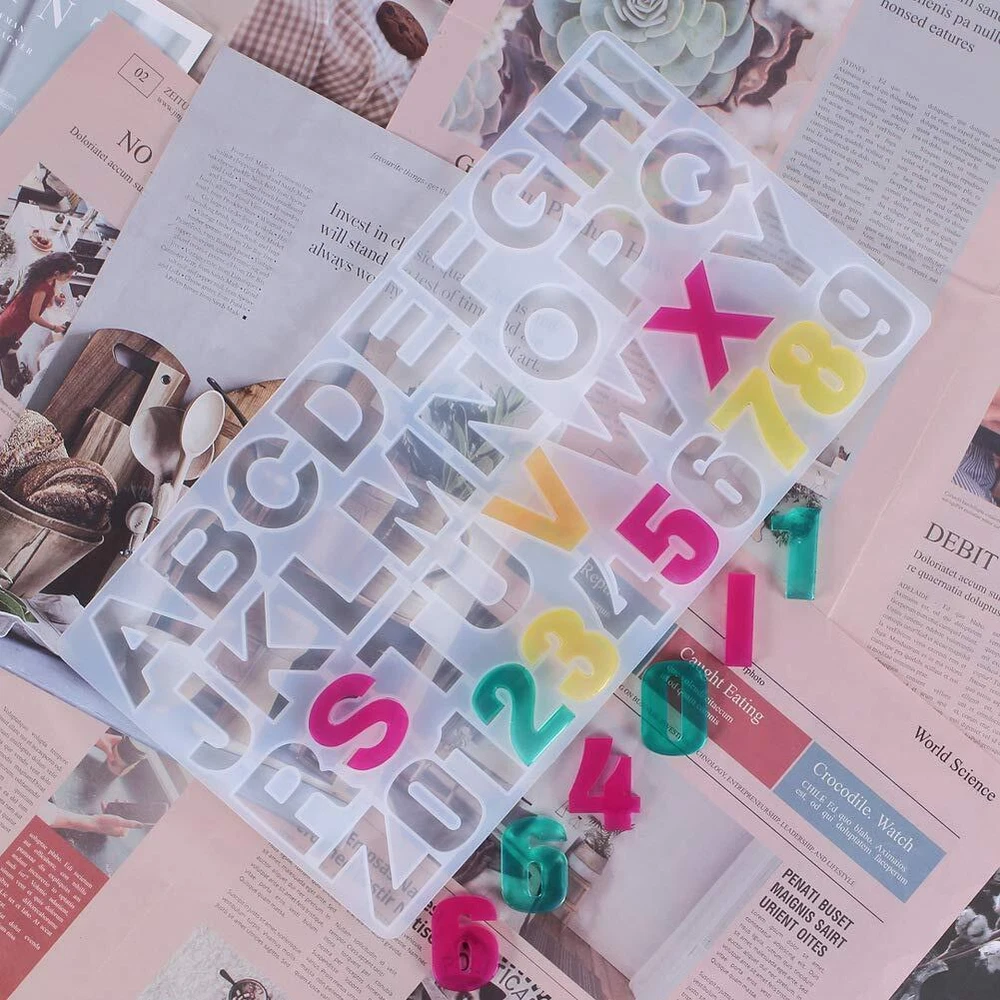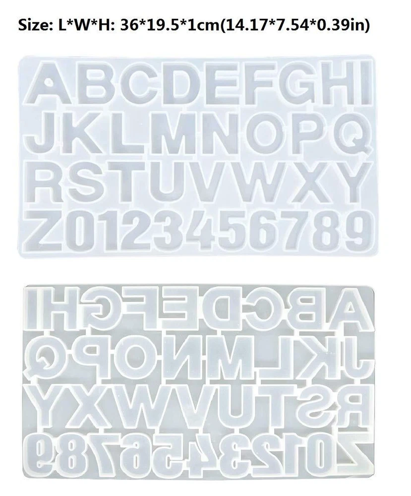 Silicone Alphabet Number Resin Molds Size: L*W*H: 36*19.5*1cm(14.17*7.54*0.39in).The keychain resin mold set come with 1 letter & number silicone mold,key rings, keychain screws eye pins,12 x glitter sequins Easy to Use -- The epoxy resin molds are made of high quality durable silicone which make the letters mold is very flexible, no tearing.When you release the item out of the mold, just twist the mold and press the button of the mold, so the piece can be easily push out. Reusable Silicone Mold: Art resin molds are made up of silicone, very flexible and easy to clean and it reusable, not easily damaged. When you do the project, it will check project process in anytime with transparent. Perfect gift which allows you to make your own ornament,the molds can be used for DIY jewelry making,pendant,earrings,necklace,bracelets,key chains,auto parts,and so on. Wrapping them as gifts for family and friends on Valentine's day, Mother's day, birthdays and other occasions! The molds is suitable for pendant resin casting,the colorful and beautiful resin letter. Storage and Care: Please store your resin molds in room temperature place, avoid from the direct sunlight. Clean these silicone coasters molds with soap water; for the finished products, there will also be rough edges that will need to be sanded and polished once removed from the mold but do not sand until the casting has fully hardened. Note: The maximum temperature of the molds can withstand is 220℃ (428℉).