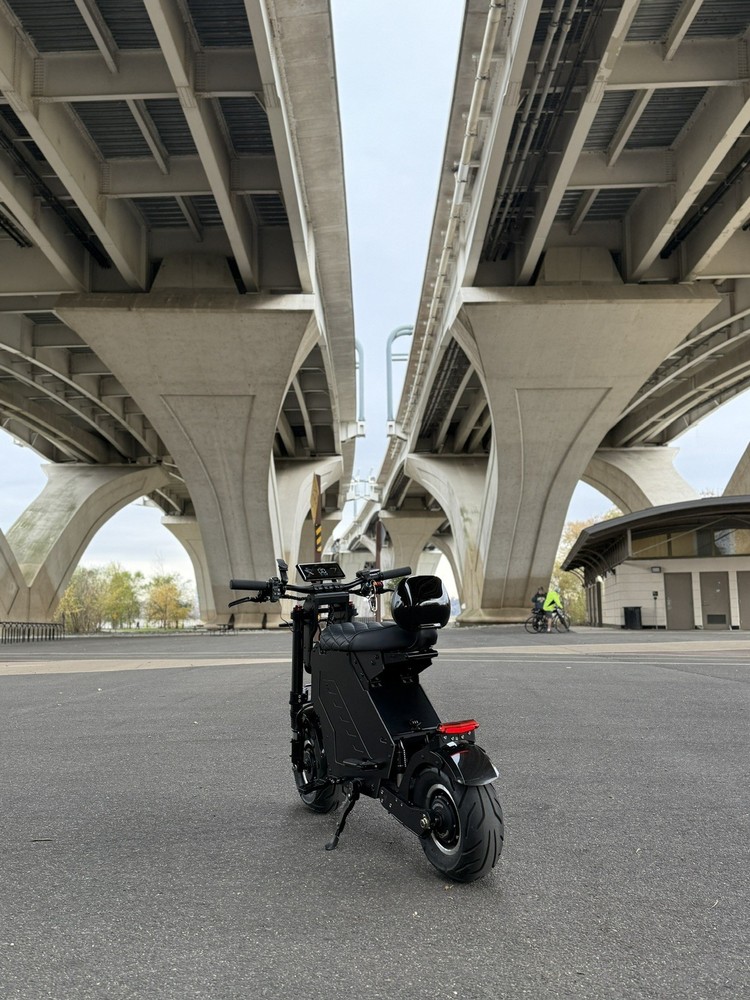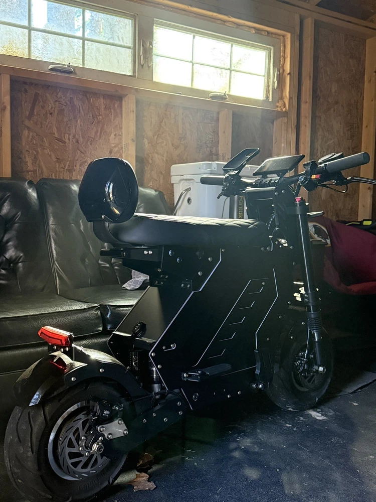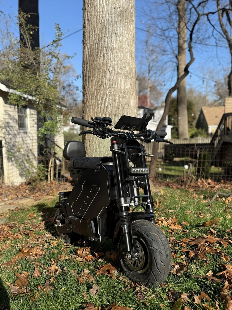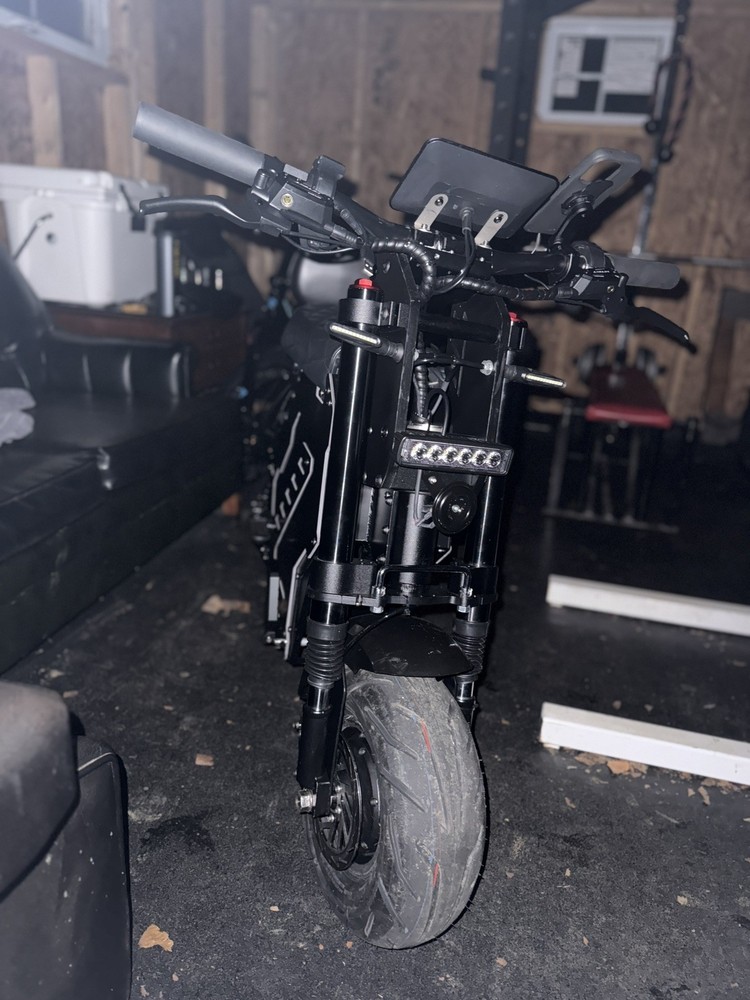150lbs 13 inch street tires 60+MPH top speed 50-80 mi/ range Only ~100 miles driven Dual 18-Mosfet 60A Speed Controllers Custom headlight installed from factory Charger