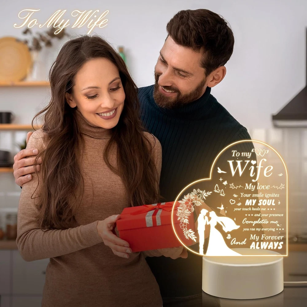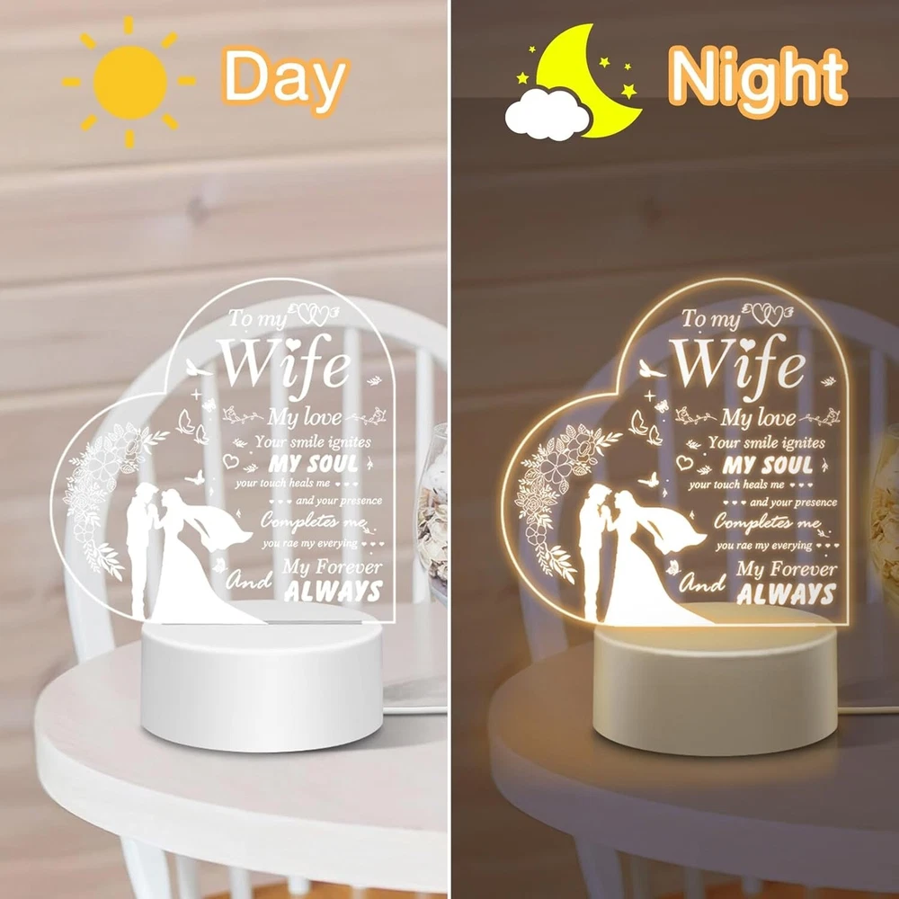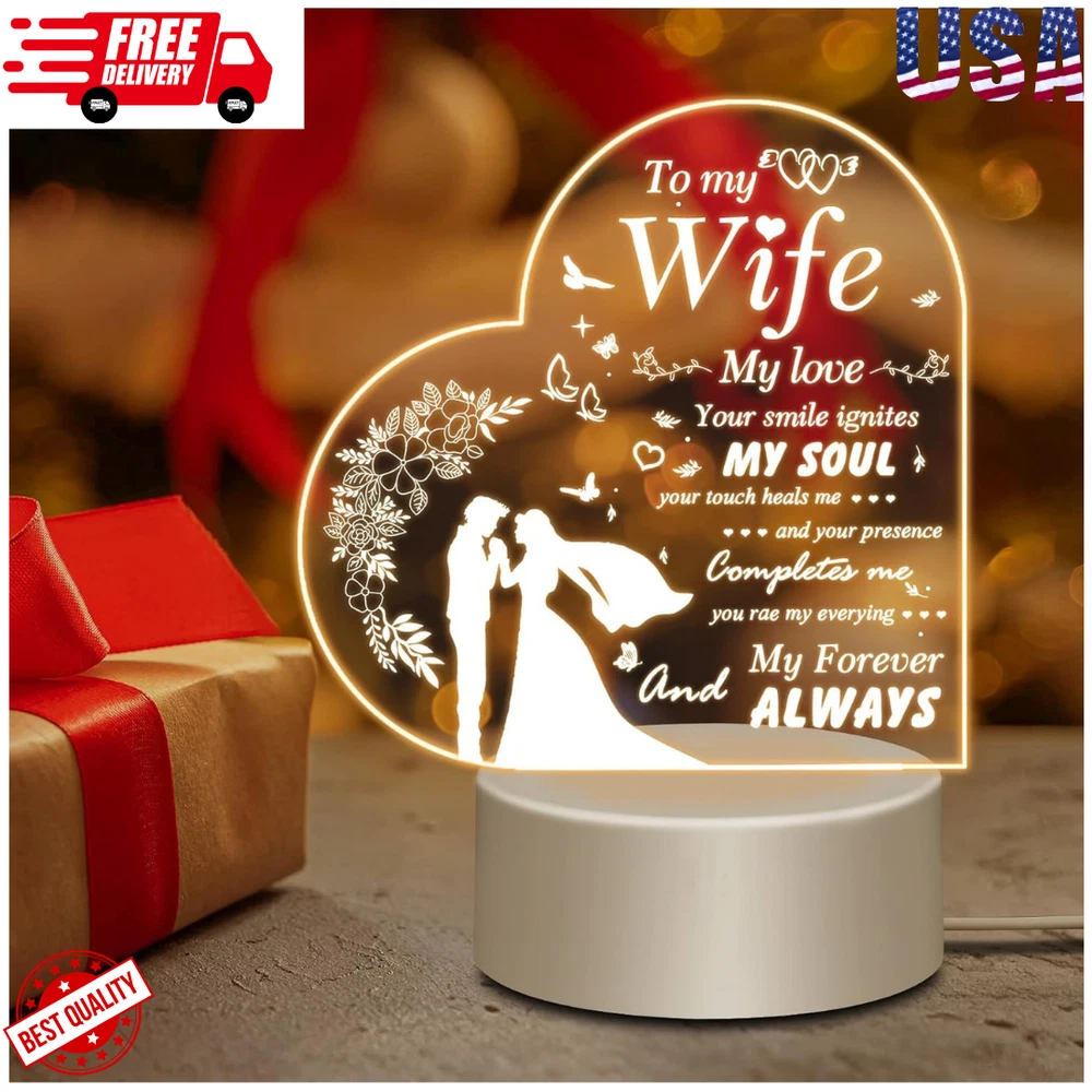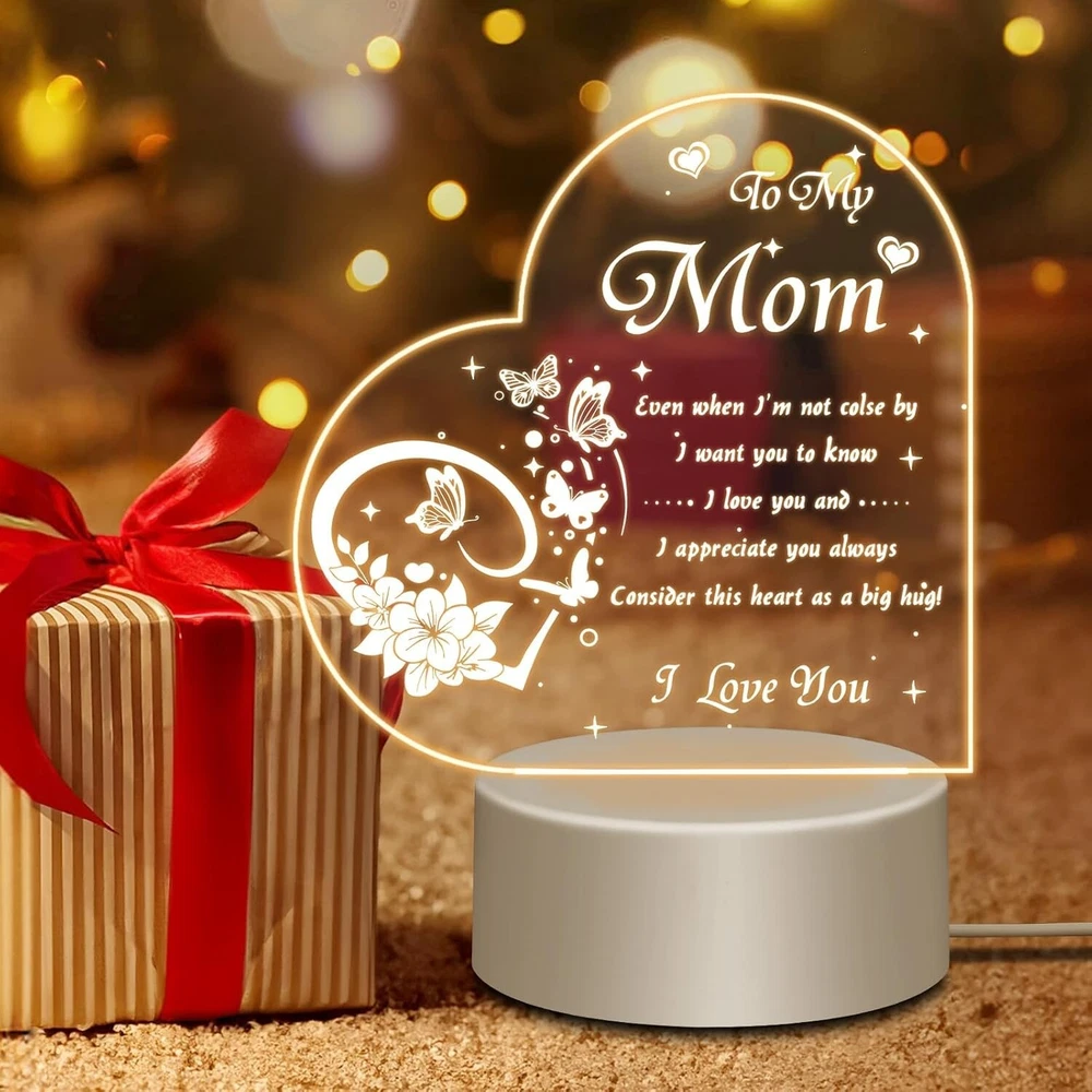 Mother: 【Gifts for Mom】 This personalized night light is engraved with heartwarming words -"Even when I'm not colse by I want you to know I Love you and I appreciate you always consider this heart as a big hug! I Love you"; This night lamp present to express your love for your mother, mom is a great woman that we are most thankful. 【Mom Birthday Gifts Ideas】The night light is made of acrylic and a base, with acrylic light guide plate to bring you a soft lighting effect, the light will not be too strong or too weak, non-flickering and non-glaring, even if you wake up in the middle night, it won’t be dazzling and create the ideal sleep environment for your family. Expressing sincere gratitude for her. USB charging port for PC, charger and mobile devices, et 【Gifts Birthday Gifts For Mom】When you receive the goods, you will find that there is a protective film on the night light. You need to tear it off before use. Be careful not to leave fingerprints when installing. if you are not careful, you can wipe it off to achieve the best visual effect. This LED lamp is great gifted for different special occasions. 【Happy Gifts for Mom 】Every time mom sees this night light engraved with heart-warming words, she will feel strong love. This is a surprise and amazing gift to your Mom.This mom night light for women is the choice. Wife: 【Gifts For Wife 】This personalized night light is engraved with heartwarming words - "To my Wife My Love Your smile ignites MY SOUL your touch heals me and your presence Completer me you are my everying My Forever and ALWAYS". This night light present to express your love for your wife. 【Mothers Day Gifts For Wife 】The night light is made of acrylic and a base, with acrylic light guide plate to bring you a soft lighting effect, the light will not be too strong or too weak, non-flickering and non-glaring, even if you wake up in the middle night, it won’t be dazzling and create the ideal sleep environment for your family. Expressing sincere gratitude for her. USB charging port for PC, charger and mobile devices, et. 【Wife Gifts 】When you receive the goods, you will find that there is a protective film on the night light. You need to tear it off before use. Be careful not to leave fingerprints when installing. if you are not careful, you can wipe it off to achieve the best visual effect. This LED lamp is great gifted for different special occasions. The night lamp marriage will bring wife lucky and happiness. Let your wife know that she will always be in your heart. Let your wife know how important she means to you. 【Birthday Gifts For Wife】Every time sister sees this night light engraved with heart-warming words, she will feel strong love from her sisterhood . This is a surprise and amazing to your sister. She will love it. Suitable to apply as home decoration in your bedroom, living room, dining room, etc.