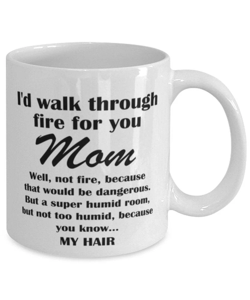 Mom Funny Coffee Mug I'd Walk Through Fire For You Mom Mothers Day Mug Gift Mug Product Details.. This high quality 11oz. ceramic white mug has a premium hard coat that provides crisp and vibrant color reproduction sure to last for years. Perfect for all hot & cold beverages. The highest quality printing possible is used. It will never fade no matter how many times you wash it. Material: 100% Ceramic. Print both sides. Dishwasher and Microwave Safe. High Gloss + Premium White Finish. Printed in the U.S.A. Personalized & Custom. We support personalized and custom mug to add custom, when placing an order, you can add notes to the "order note" in shipping address section. Also you can contact us directly via message. Shipping Info. Ready to ship in 1 to 2 business days, All products are made-to-order and proudly printed in the United States. Shipped by USPS and DHL, You will receive your order in 5-7 days. Replace & Refund. All products are defective during shipping broken, chipped will be replaced free of charge. You are not satisfied with the product, we will refund 100% money to you. If any other issues arise, please do not hesitate to message, we would be more than happy to assist you.