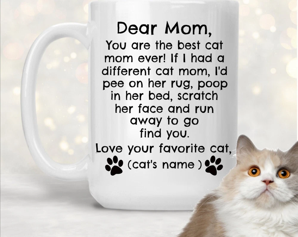 Mom Gift Custom Cat Mug Personalized Cat Mom Mug Dear Cat Mom Coffee Cup Love Product Details.. This high quality 11oz. ceramic white mug has a premium hard coat that provides crisp and vibrant color reproduction sure to last for years. Perfect for all hot & cold beverages. The highest quality printing possible is used. It will never fade no matter how many times you wash it. Material: 100% Ceramic. Print both sides. Dishwasher and Microwave Safe. High Gloss + Premium White Finish. Printed in the U.S.A. Personalized & Custom. We support personalized and custom mug to add custom, when placing an order, you can add notes to the "order note" in shipping address section. Also you can contact us directly via message. Shipping Info. Ready to ship in 1 to 2 business days, All products are made-to-order and proudly printed in the United States. Shipped by USPS and DHL, You will receive your order in 5-7 days. Replace & Refund. All products are defective during shipping broken, chipped will be replaced free of charge. You are not satisfied with the product, we will refund 100% money to you. If any other issues arise, please do not hesitate to message, we would be more than happy to assist you.