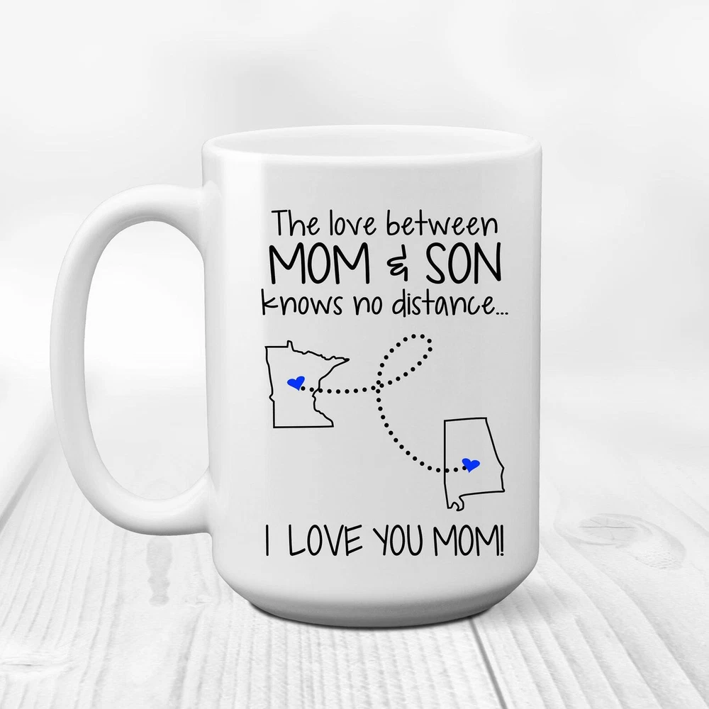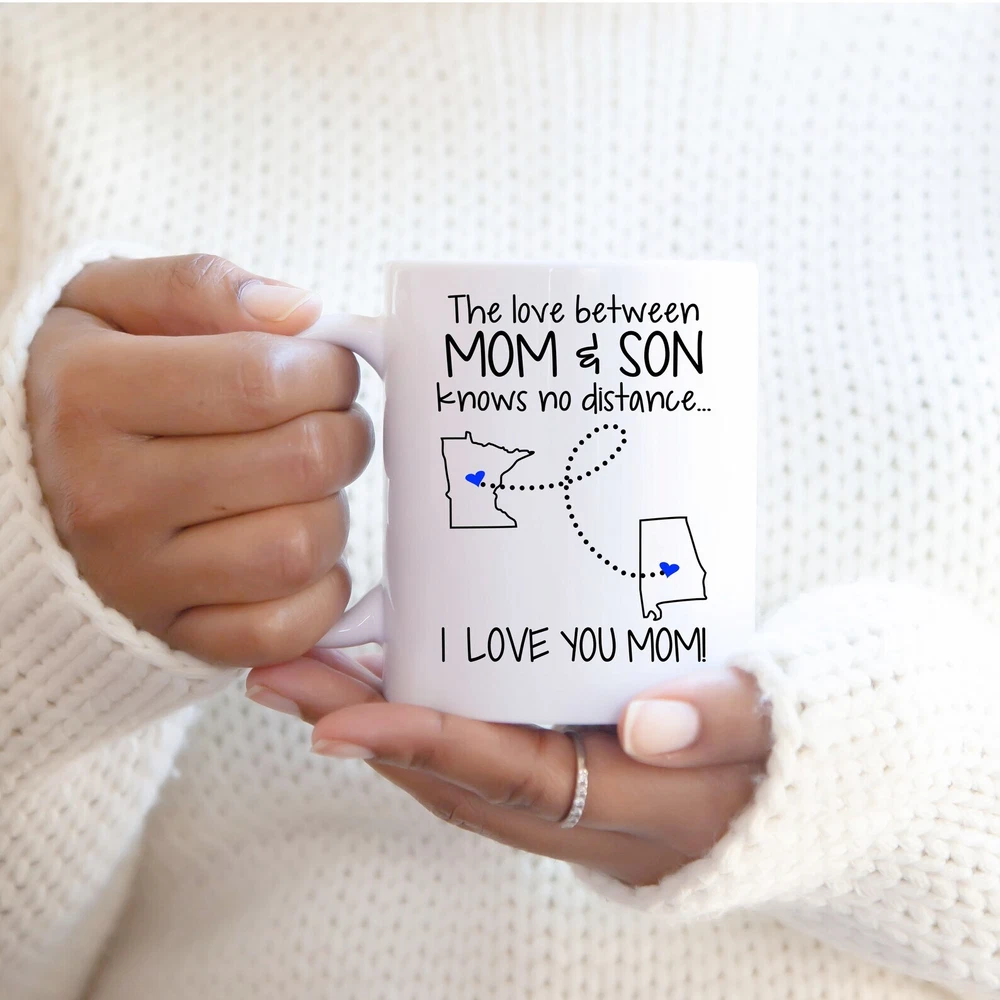 Mom Son State To State Coffee Mug Moving Away Gift The Love Between Mom And Son Product Details.. This high quality 11oz. ceramic white mug has a premium hard coat that provides crisp and vibrant color reproduction sure to last for years. Perfect for all hot & cold beverages. The highest quality printing possible is used. It will never fade no matter how many times you wash it. Material: 100% Ceramic. Print both sides. Dishwasher and Microwave Safe. High Gloss + Premium White Finish. Printed in the U.S.A. Personalized & Custom. We support personalized and custom mug to add custom, when placing an order, you can add notes to the "order note" in shipping address section. Also you can contact us directly via message. Shipping Info. Ready to ship in 1 to 2 business days, All products are made-to-order and proudly printed in the United States. Shipped by USPS and DHL, You will receive your order in 5-7 days. Replace & Refund. All products are defective during shipping broken, chipped will be replaced free of charge. You are not satisfied with the product, we will refund 100% money to you. If any other issues arise, please do not hesitate to message, we would be more than happy to assist you.