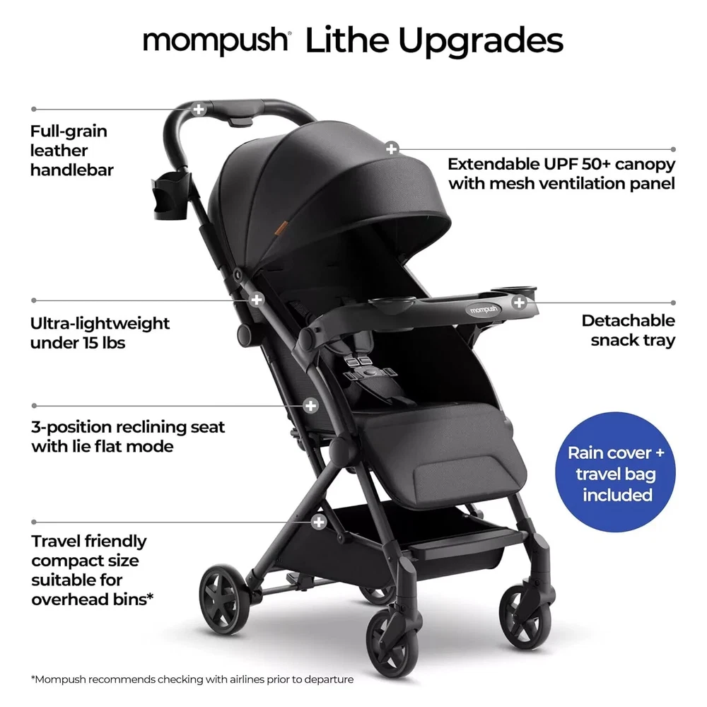 Package: 1X Mompush Lithe V2 Lightweight Stroller + Snack Tray, Ultra-Compact Fold & Airplane Ready Travel Stroller, Near Flat Recline Seat, Cup Holder, Raincover & Travelbag Included Description: Polyester 175° NEAR-FLAT RECLINE - Fully reclining backrest and adjustable footrest providing a lie flat mode that is perfect for newborns. 3-Position reclining backrest with easy one-hand adjustment. KEEP IT LIGHT - Ultra-lightweight at under 15 lbs, allowing you to effortlessly navigate the world. We've upgraded the folding carry mechanism to a carry handlebar, elevating the user experience and simplifying storage, whether in your car's trunk or a discreet home corner. ONE SECOND FOLD – One-handed, one step fold for on-the-go convenience. Fit into most overhead airplane bins. Travel bag included for traveling and carrying stroller with ease. MAXIMUM PROTECTION –The large UPF 50+ canopy provides complete shade protection from harmful UV rays, while the extendable mesh ventilation panel ensures better air flow. Included rain shield to keep baby dry. BUILT-IN TRAY - Features a detachable child tray, provides a durable, easy-to-clean surface for your child's snacks and drinks, keep baby satisfied while strolling. Tray folds with the stroller.