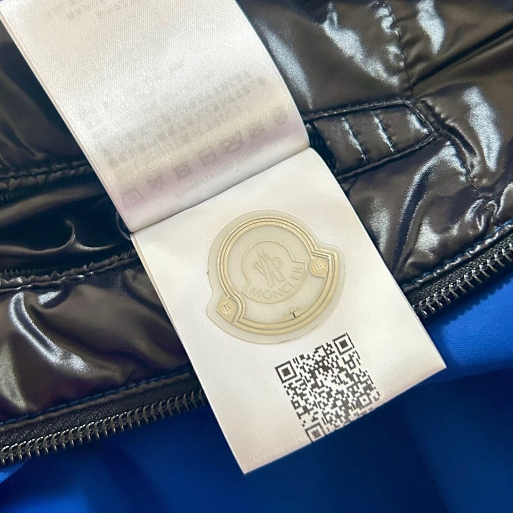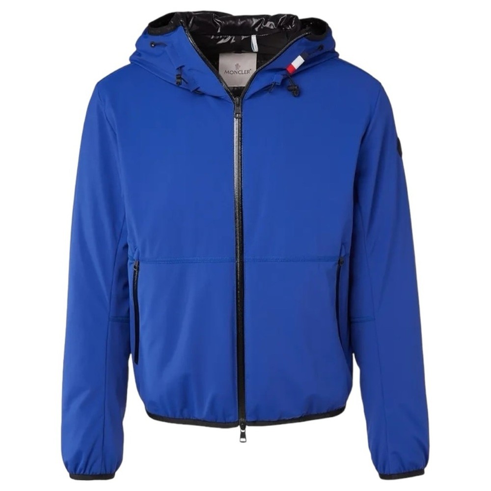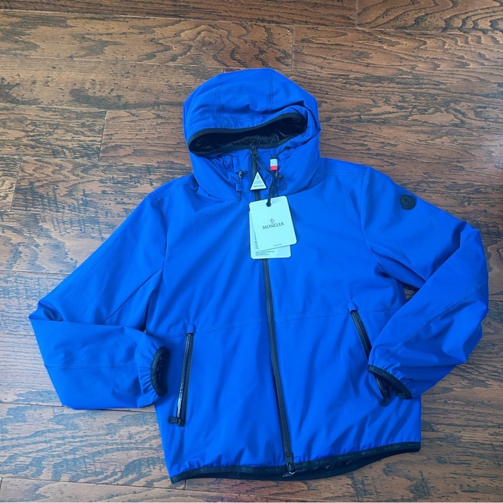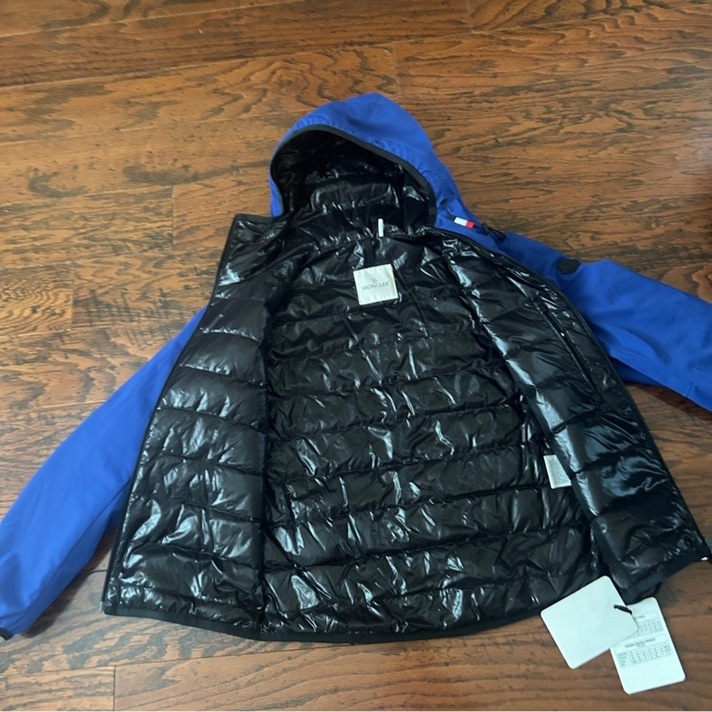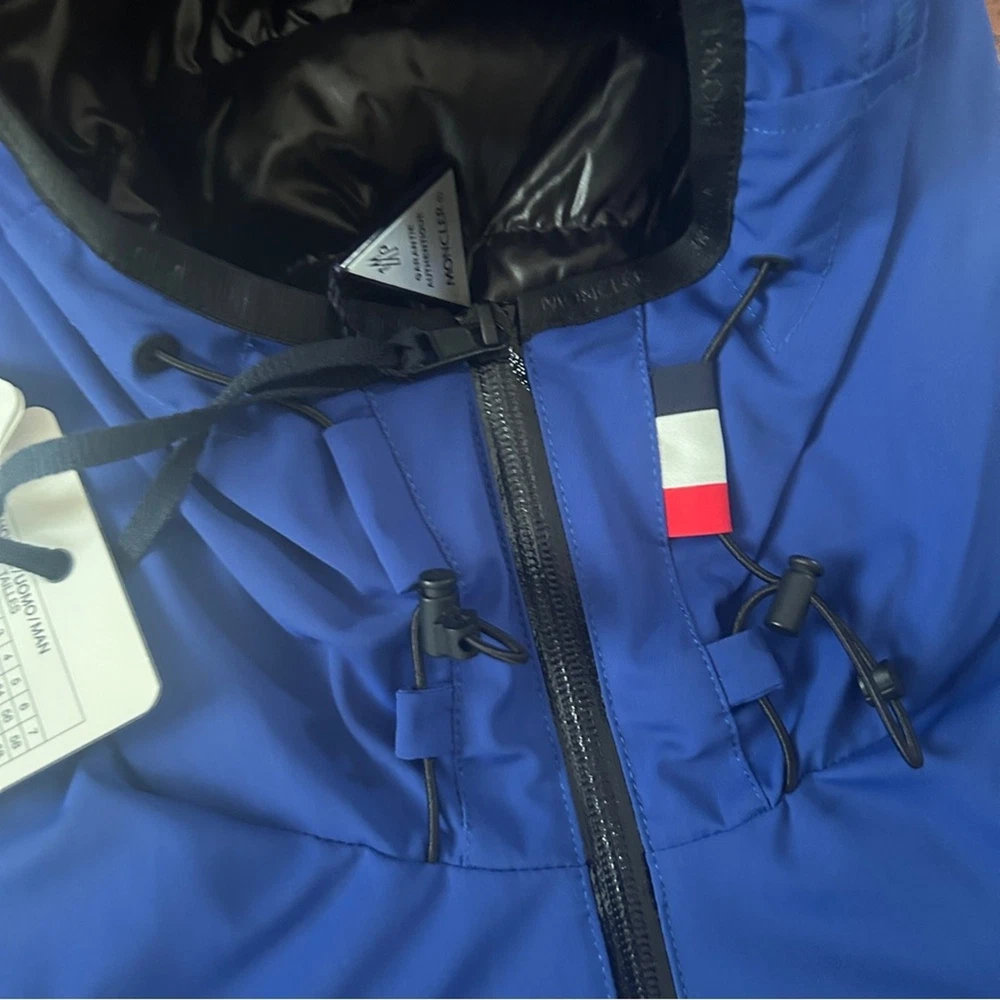 Moncler Men's Duport Hooded Down Filled Jacket Blue with Black lining - Size 1 (Small) NEW with original tags: $1,740 Retail Minimalist in design, this soft shell down jacket showcases a nylon-blend design and a contrasting padded down-filled lining • Attached bungee cord hood • Stand collar • Two-way zip front • Waist zip pockets • Piping trim • Fully lined • Outer: 76% Polyamide; 24% Elastane; Lining: 100% Polyamide; Fill: 90% Down, 10% Feather • Dry clean Approx. 21" armpit to armpit and 24" center back neck to hem Moncler Duport Blue Men's Hooded Down-Filled Jacket Size Small NWT