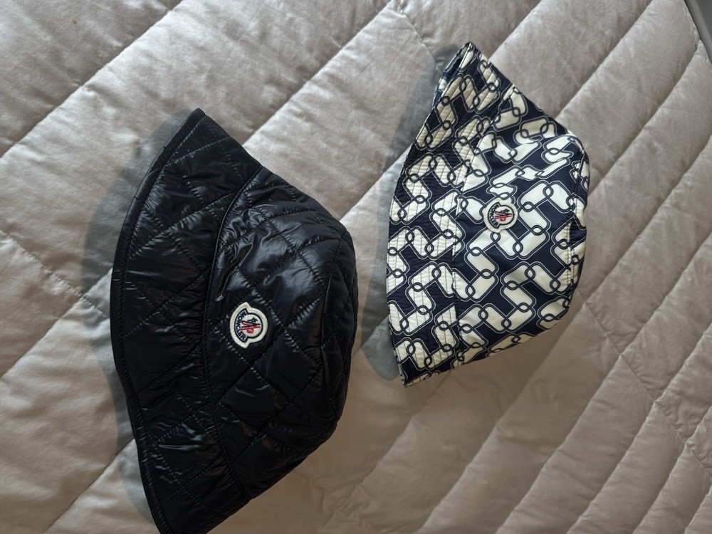 MONCLER BUCKET HATS | 2024 collections White multi design was part of the resort collection / the black was fall collection BOTH SIZE M ( unisex ) Purchase both for $ 200 If interested in just 1 ( inbox me which and I’ll post is separate so you purchase ) separate each will be 125
