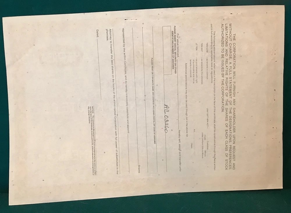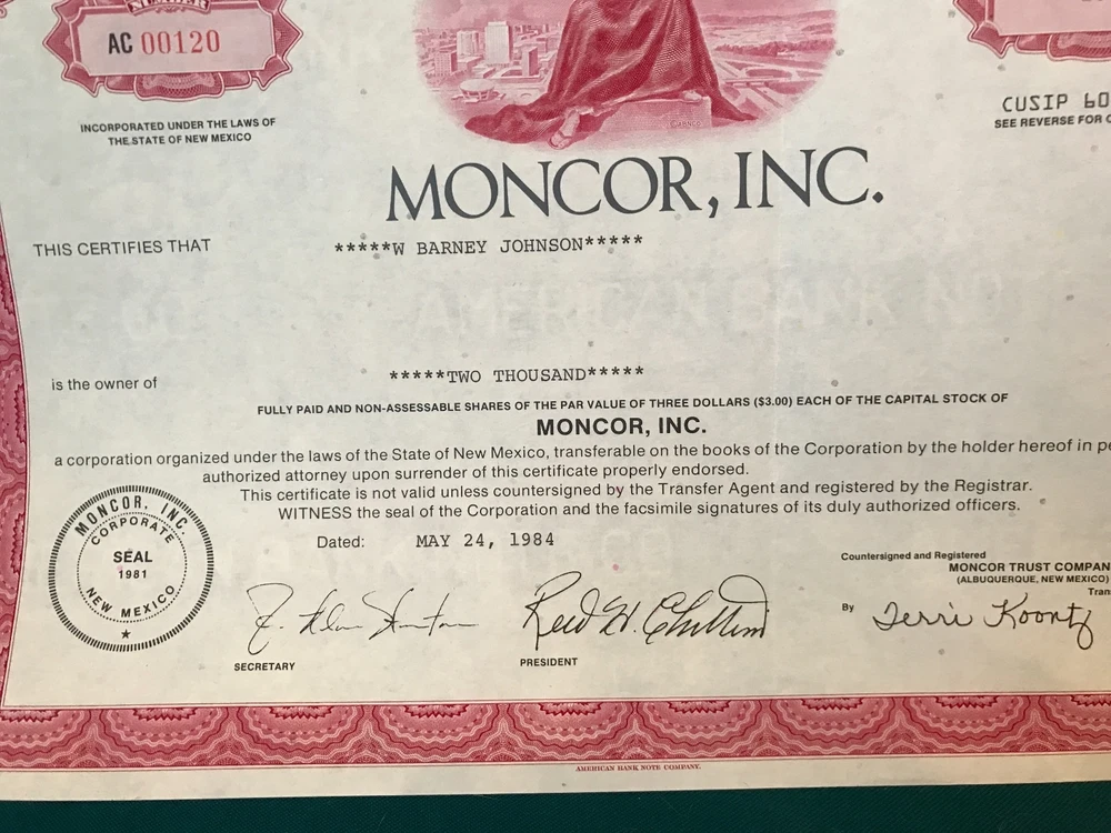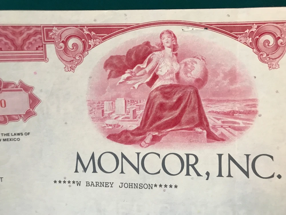 This beautiful stock certificate was issued by Moncor, Inc. of New Mexico for 2000 shares of company stock. The certificate is beautifully engraved by the American Bank Note Co. Moncor National Bank of Hobbs, N.M. started an aggressive loan program in 1981. By 1985 went sour because 'safe and sound lending practices were sacrificed in pursuit of rapid growth and the loan portfolio deteriorated. The loan practices finally exhausted the bank's capital,' federal banking officials said. The certificate has the usual light folds and staple holes, otherwise, in fine condition. Certificate measures roughly 12 inches by 8 inches. All items guaranteed authentic and original. Domestic First Class Mail shipping is $3.00. Please contact for international shipping costs. Shipping is gladly combined for multiple purchases. Please request an invoice before paying for multiple items. Good luck.