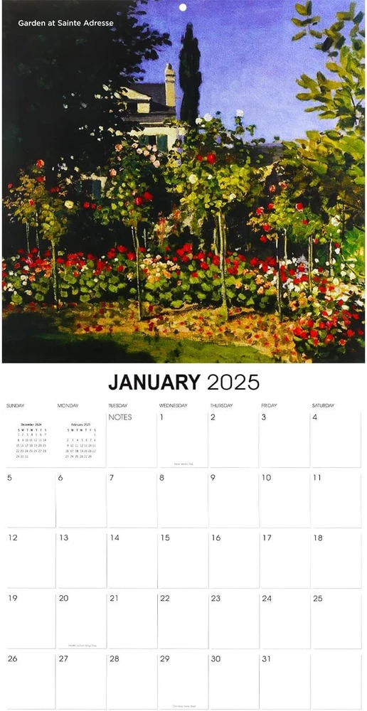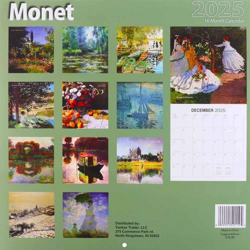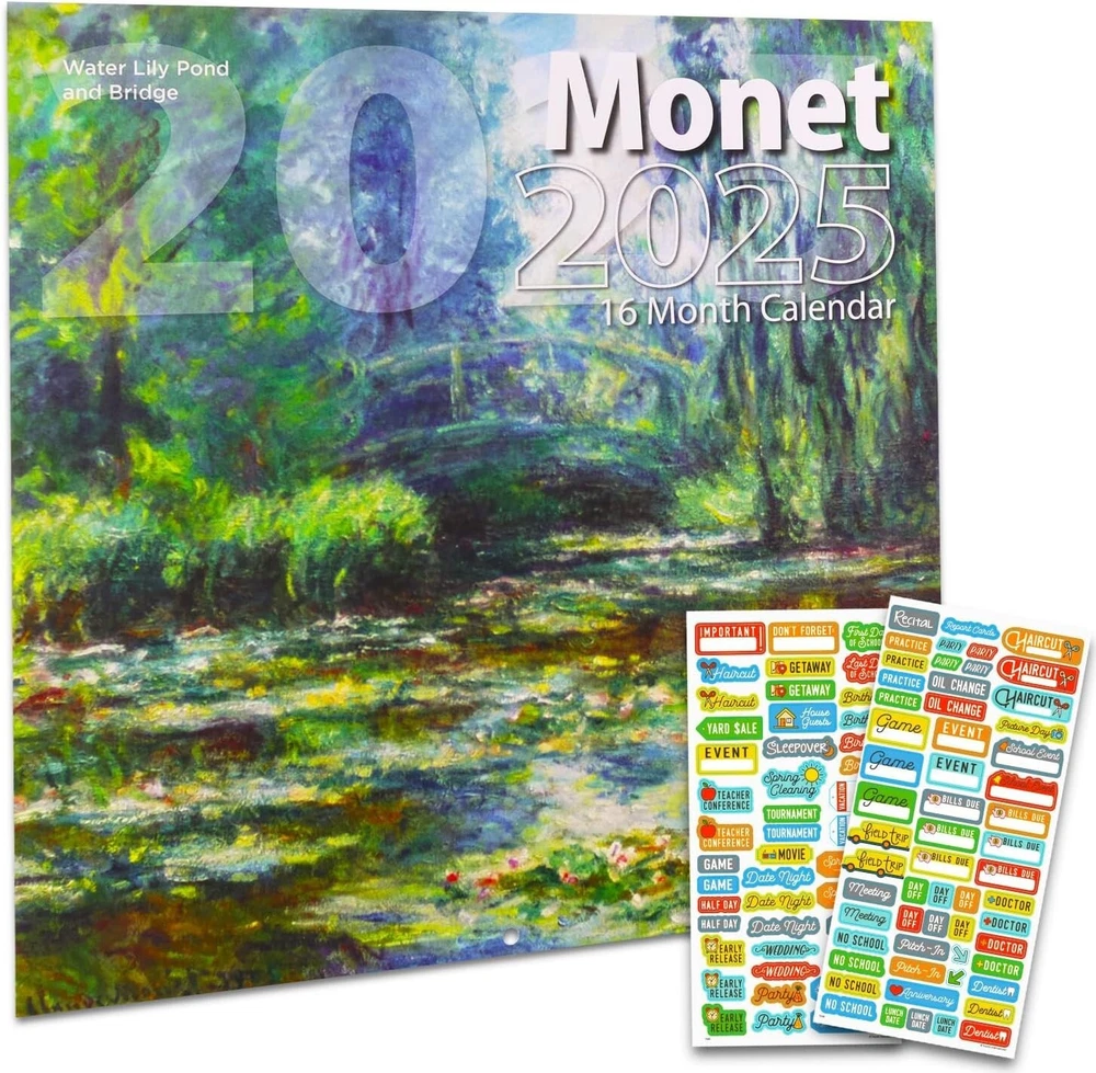Monet Calendar 2025 - Deluxe 2025 Claude Monet Wall Calendar Bundle with Over 100 Calendar Reminder Stickers (Impressionism Gifts, Office Supplies) Bring Monet’s masterpieces to life in your home with our Claude Monet calendar—where every month is a new brushstroke of brilliance. Experience the art of impressionism that never goes out of style! Deluxe Monet 2025 Wall Calendar Bundle with Calendar Reminder Stickers. This 2025 Monet calendar is printed on premium heavyweight deluxe paper. Large grids to mark appointments and events. Observes major holidays and moon phases. This Monet 2025 wall calendar measures 12 x 12 inches closed and 12 x 24 inches opened. Includes an individually wrapped pack of calendar reminder stickers. Over 100 calendar stickers to mark school events, doctor appointments, dates, vacations and more!